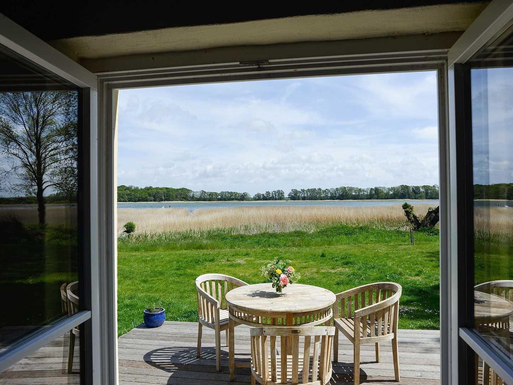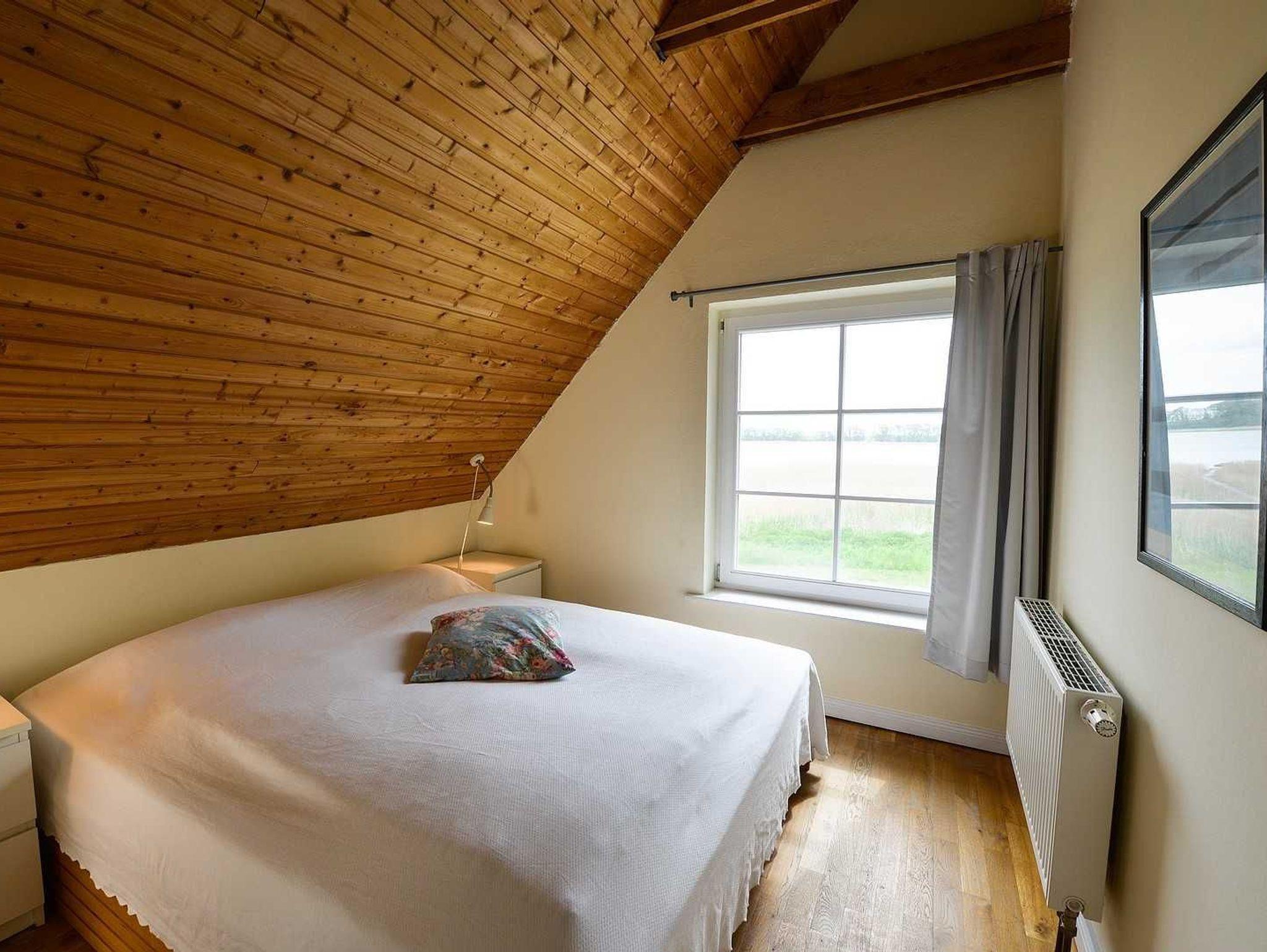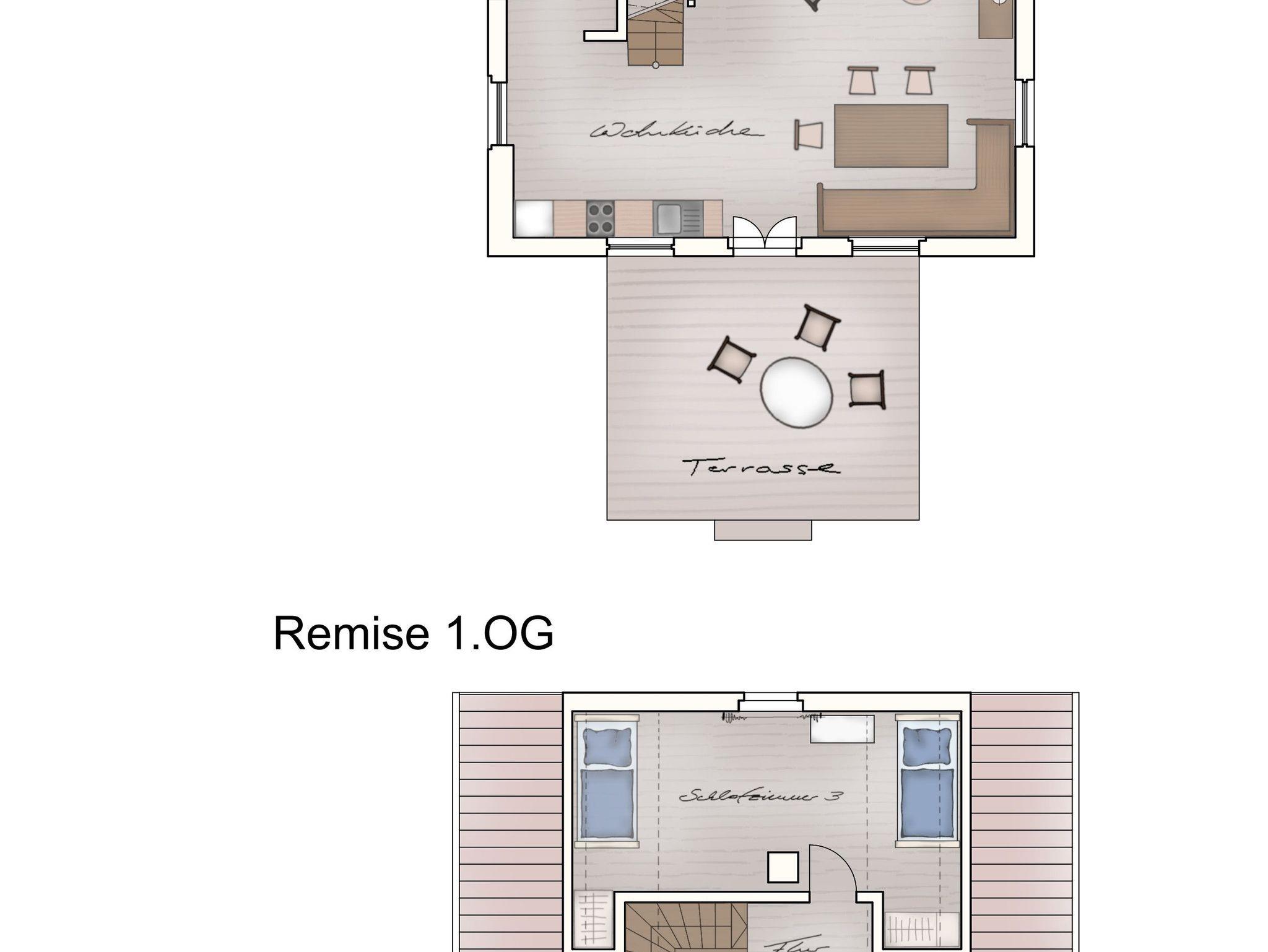 Das frei stehende Ferienhaus Remise befindet sich neben dem Gutshaus und erstreckt sich über zwei Etagen, wobei das Obergeschoss über eine Holztreppe zu erreichen ist. Die Remise für bis zu sechs Personen und in einer Größe von 72 m² ist gemütlich und mit Liebe zum Detail eingerichtet und besteht aus vier Zimmern: Im Erdgeschoss ein großes Wohnzimmer mit offener Küche (Siemens-Geräte) und schönem Blick auf den Garten und das Wasser, ein Schlafzimmer mit zwei Einzelbetten und zwei Schlafzimmer mit einem Doppelbett, die drei Schlafzimmer alle im Obergeschoss. Die Remise hat ein Badezimmer mit Badewanne und Dusche sowie ein separates WC. Die Böden sind aus Eichenholz-Parkett. Im Wohnzimmer befindet sich ein Kaminofen.