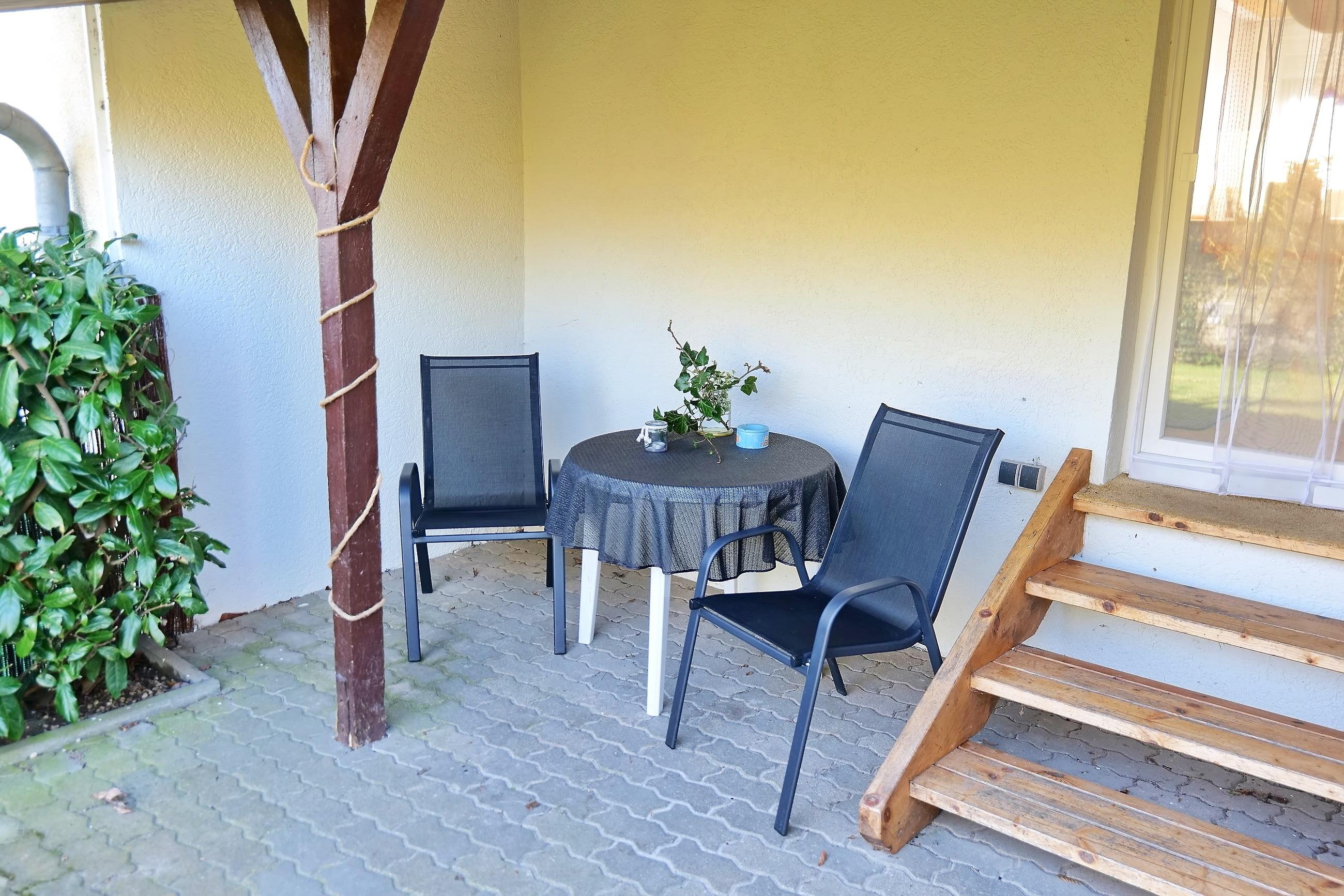 Direkt am Ferienhaus befindet sich die überdachte Terrasse (Zugang von der Küche). Hier gibt es Sitzmöbel und man kann ganz entspannt mit einem gemütlichen Frühstück in den Tag starten. Die Möglichkeit zum BBQ-Grillen ist außerdem gegeben. An die Terrasse schließt sich eine Rasenfläche, die den Gästen weiteren Platz im Freien bietet, an.