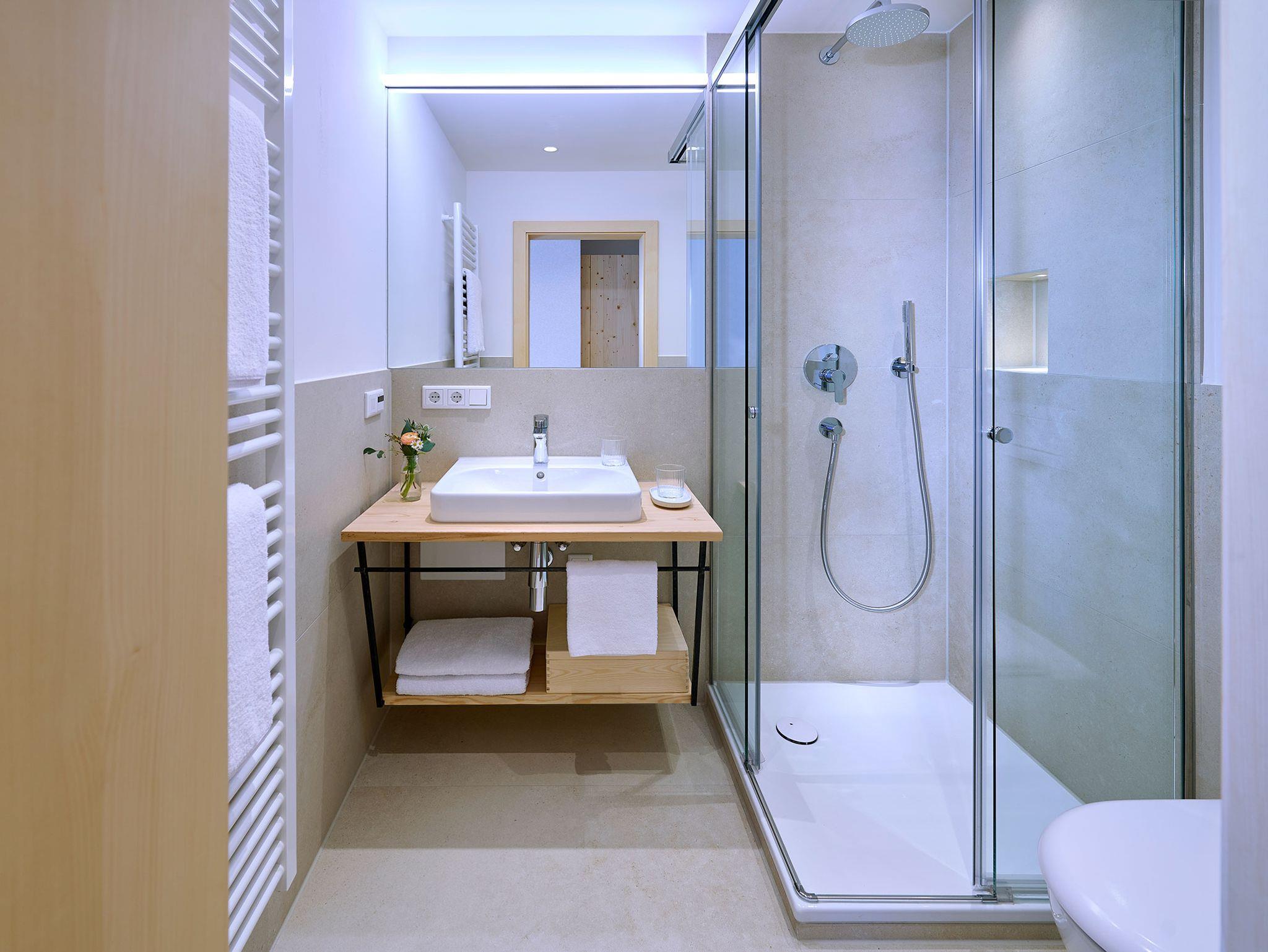 • 1 Badezimmer mit Regendusche, WC, Waschtisch, Föhn, beheizbarem Handtuchtrockner, Badradio, Pflegeprodukten und Schminkspiegel