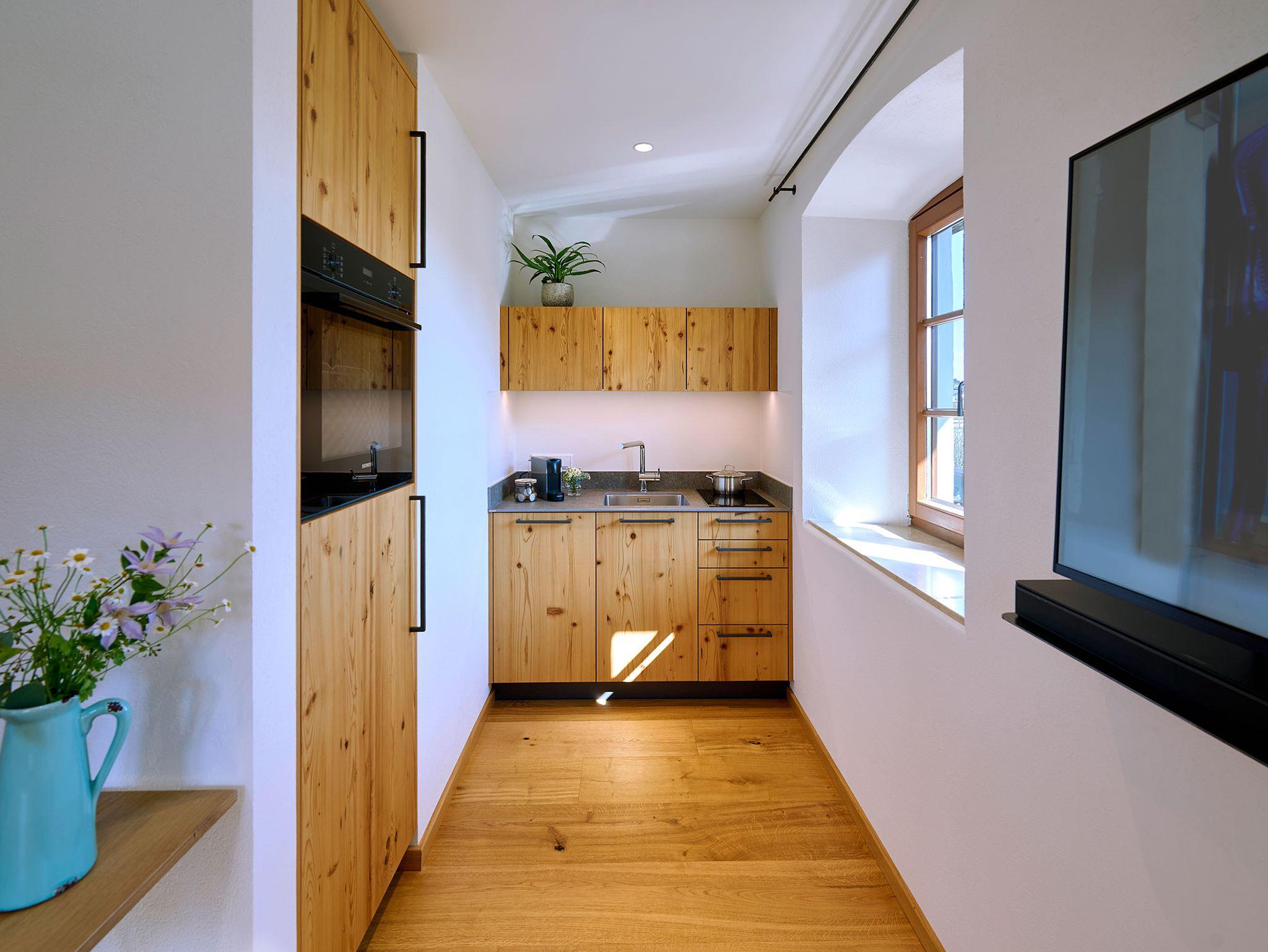 • Komplett ausgestattete Küchenzeile mit E-Herd (Induktion), Backofen, Kühlschrank mit Gefrierfach, Geschirrspüler, Nespresso Kaffeemaschine, Wasserkocher, Toaster und Eierkocher