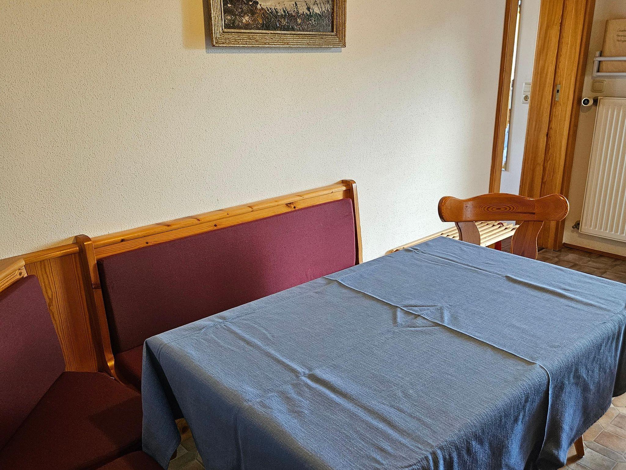 Die Ferienwohnung liegt im Nebenhaus, ist ebenerdig und hat eine sehr große möblierte Terrasse, sowie einen direkten Garten-Zugang. Sie verfügt über ein Bad mit Dusche und WC, ein Schlafzimmer mit Doppelbett, einen kombinierten Wohn- / Schlafraum mit zwei Tagesbetten und TV - die Tagesbetten können als Couch oder auch als Bett genutzt werden. Eine gut ausgestattete Küche mit Essbereich und Gaderobe. Die Küche ist ausgestattet mit Spülmaschine, Kaffeemaschine, Wasserkocher, Toaster, 4-Plattenherd, Backofen und Kühlschrank mit Gefrierfach. Außerdem W-Lan und Radio-CD-Player. Ein Babybett ist hier leider nicht möglich.