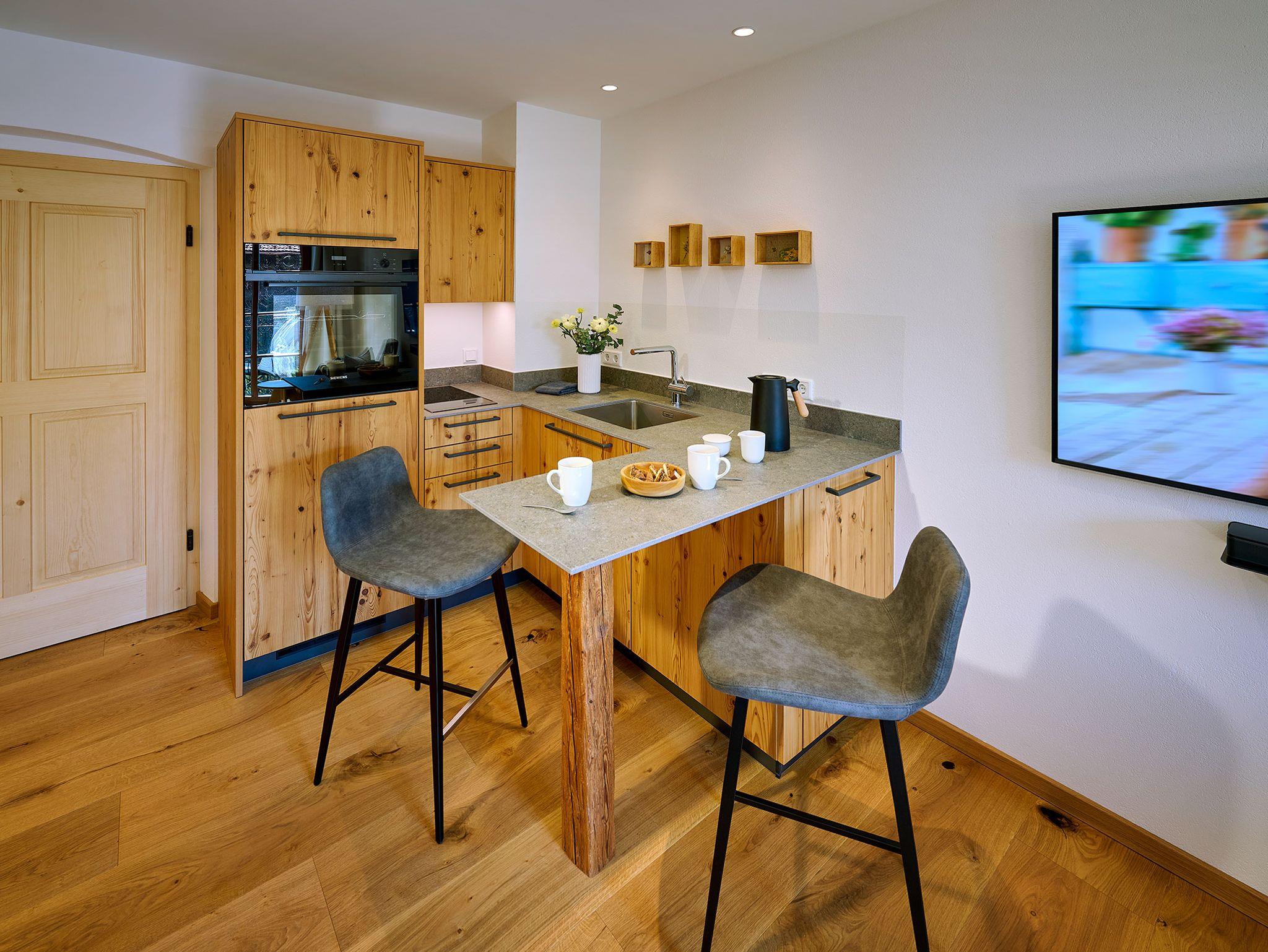 • Komplett ausgestatteter Küchen-Essbereich mit E-Herd (Induktion), Backofen, Kühlschrank mit Gefrierfach, Geschirrspüler, Nespresso Kaffeemaschine, Wasserkocher, Toaster und Eierkocher