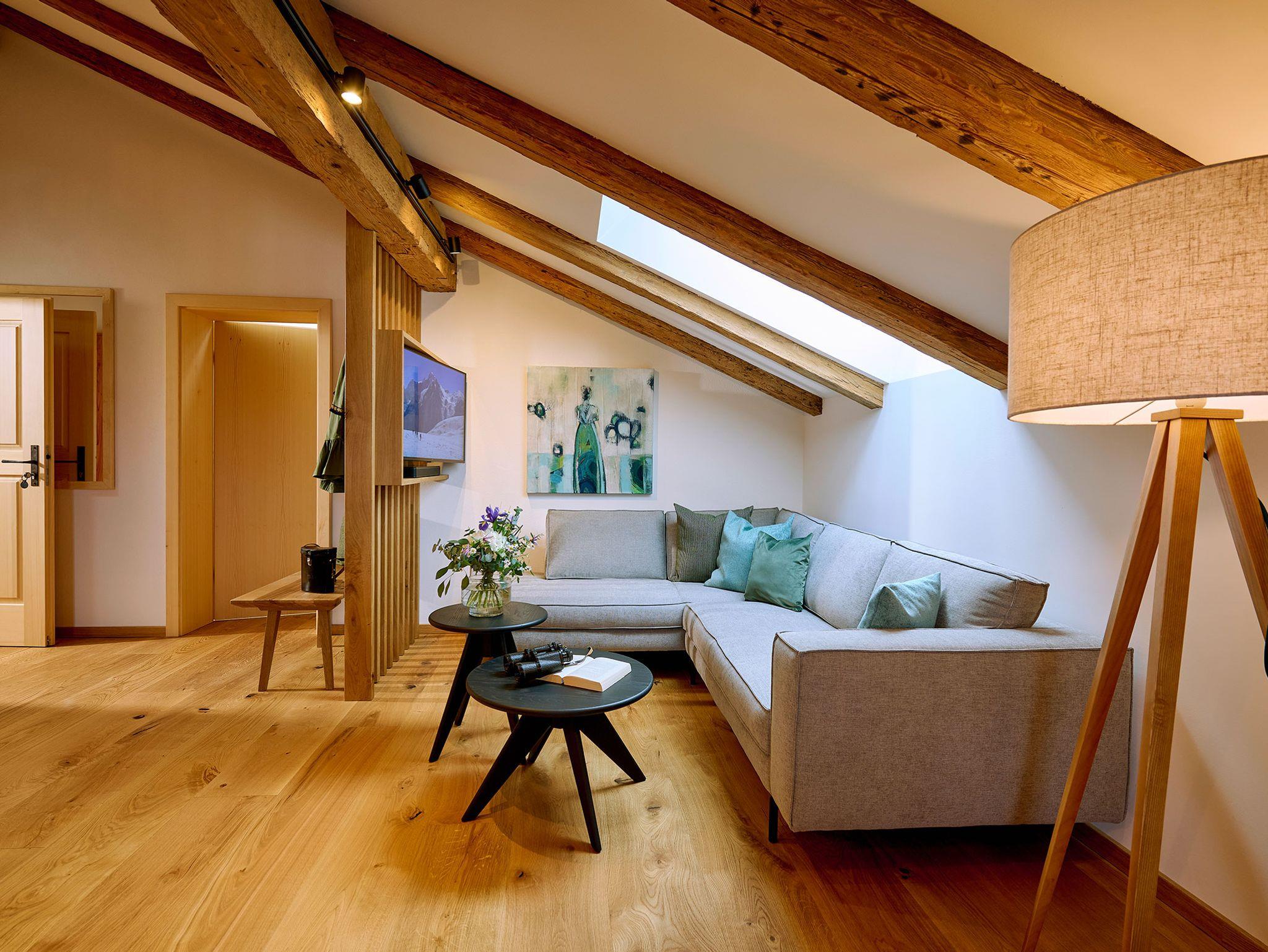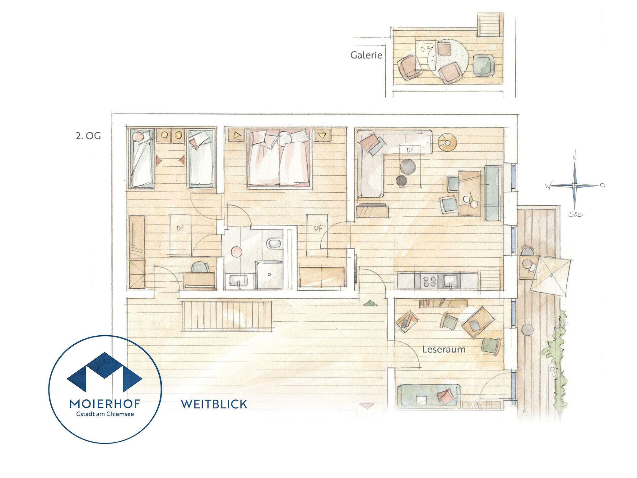 Die luxuriöse 5-Sterne-Ferienwohnung „Weitblick“ im zweiten Obergeschoss des Wohngebäudes bietet mit vielen Details ein wohliges Urlaubszuhause für bis zu vier Personen. Das harmonische Ambiente zieht sich vom lichtdurchfluteten Wohn- und Essbereich bis in die heimelige Galerie als echten Rückzugsort. Zwei Schlafzimmer mit direktem Zugang zum geräumigen Badezimmer bieten ausreichend Platz zum Erholen. Darüber hinaus verfügt die Ferienwohnung über einen Zugang zum großen, möblierten Ost-Balkon mit Blick in die Natur. Und sollte es noch mehr Ruhe in angenehmer Atmosphäre sein, stellt der direkt an die Ferienwohnung angrenzende Leseraum umfangreiche Entspannungs-Literatur bereit.