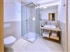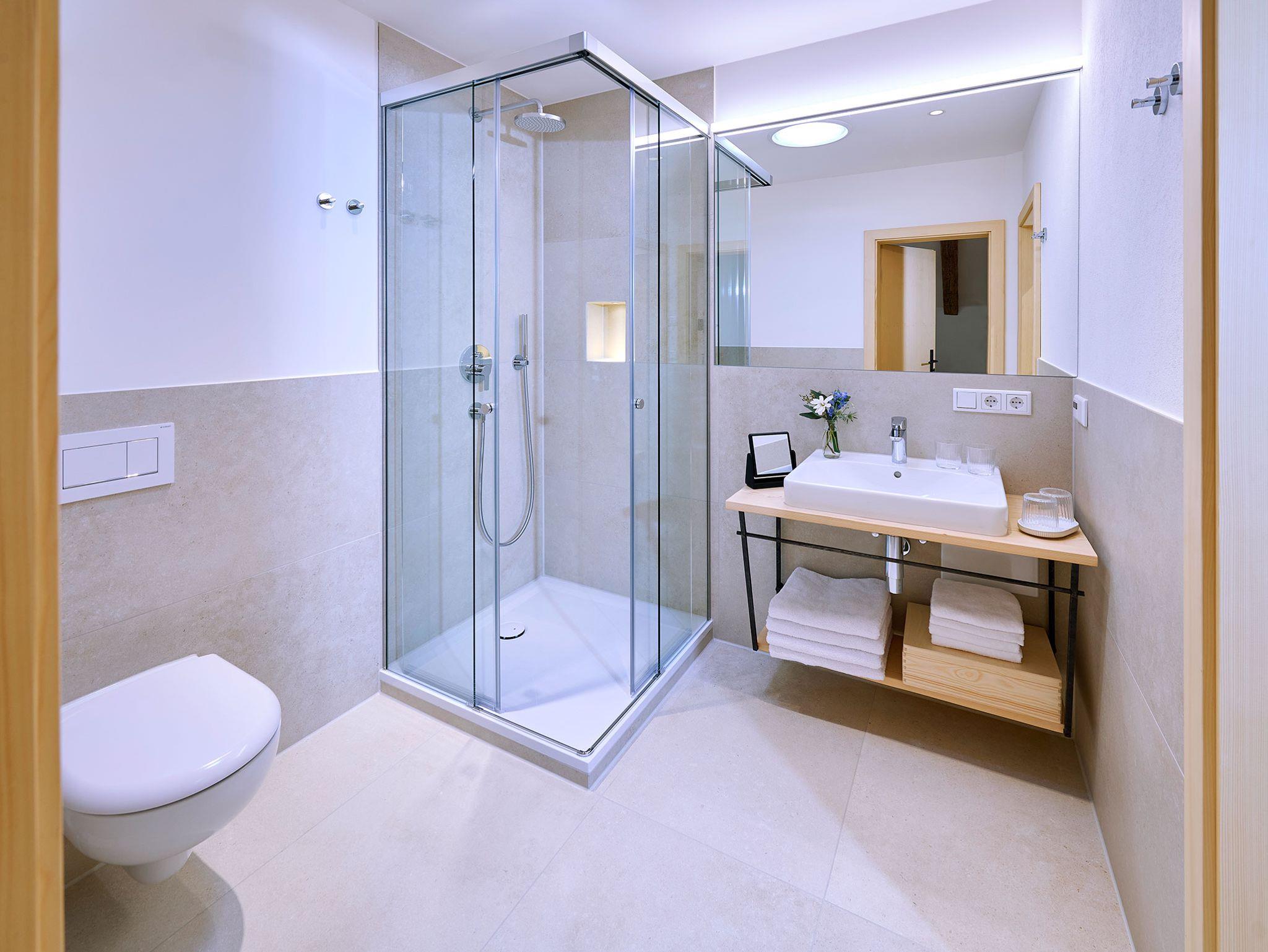 • 1 Badezimmer mit Regendusche, WC, Waschtisch, Föhn, Badradio, Pflegeprodukten und Schminkspiegel