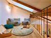 • Angrenzender, ruhiger Leseraum mit Couch, Tisch, Stühlen, Literatur und Zugang zum Balkon