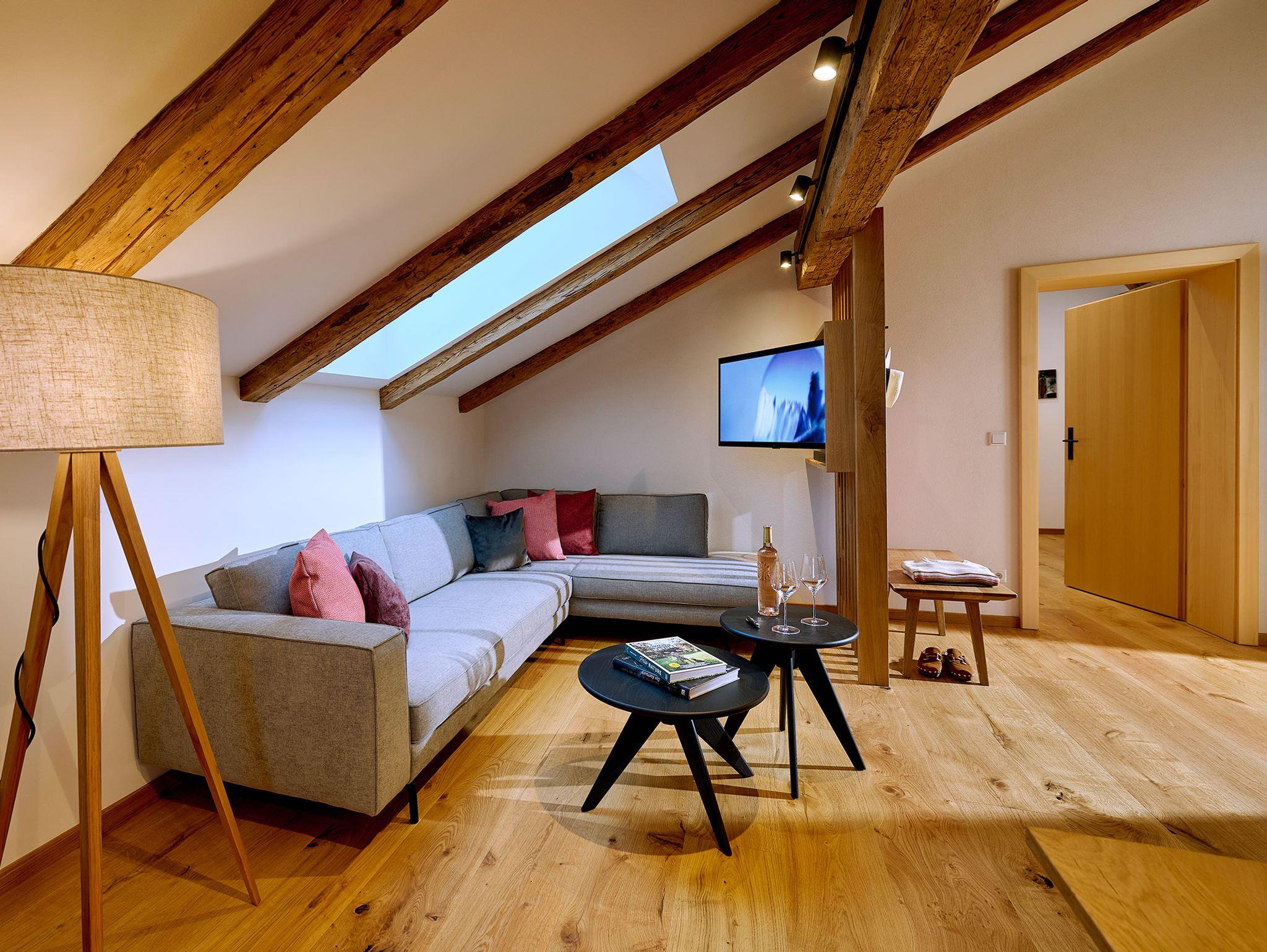 In der komfortablen 5-Sterne-Ferienwohnung „Gipfelstürmer“ sorgen viele durchdachte Feinheiten für ein harmonisches Wohlgefühl. Bis zu vier Personen finden hier im zweiten Obergeschoss des Wohngebäudes auf der Süd-Seite ein echtes Urlaubs-Feeling. Der freundliche Wohn- und Essbereich mit stilvoller Galerie und der möblierte Ost-Balkon bietet zahlreiche gemütliche Rückzugsorte zum Entspannen. Zwei Schlafzimmer mit direktem Zugang zum Badezimmer runden den Luxus dieser Ferienwohnung ab. Darüber hinaus schließt sich direkt an diese Ferienwohnung ein Leseraum an, in welchem spannende Literatur in gemütlicher Umgebung verschlungen werden mag.