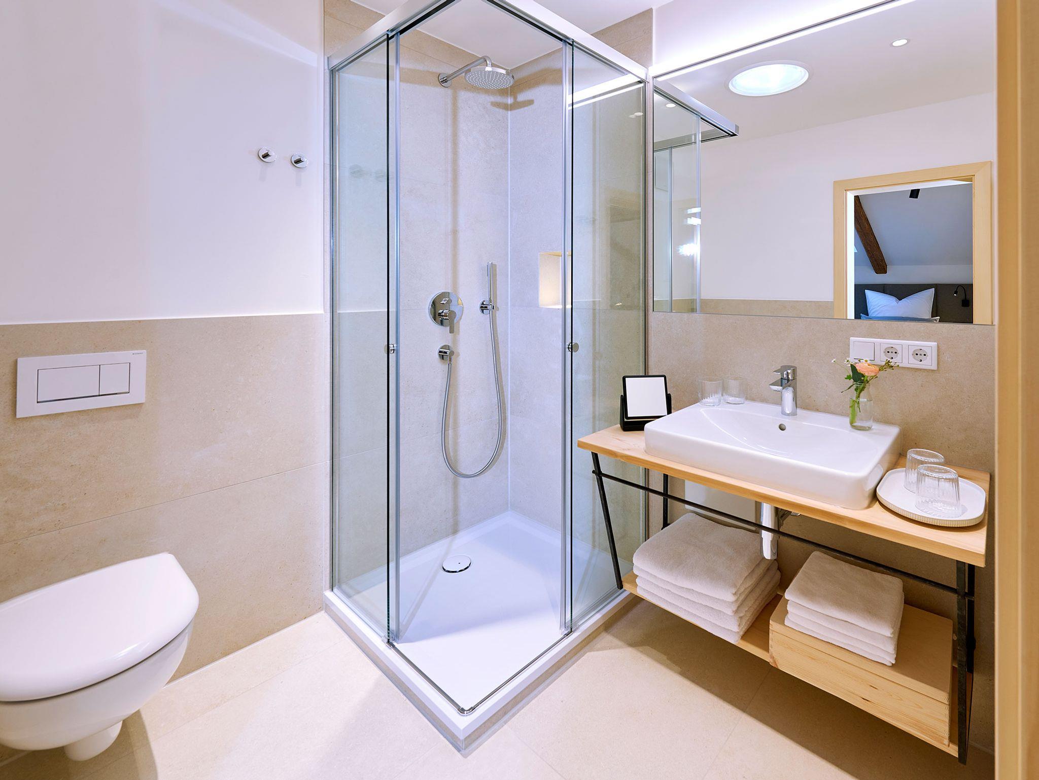 • 1 Badezimmer mit Regendusche, WC, Waschtisch, Föhn, Badradio, Pflegeprodukten und Schminkspiegel