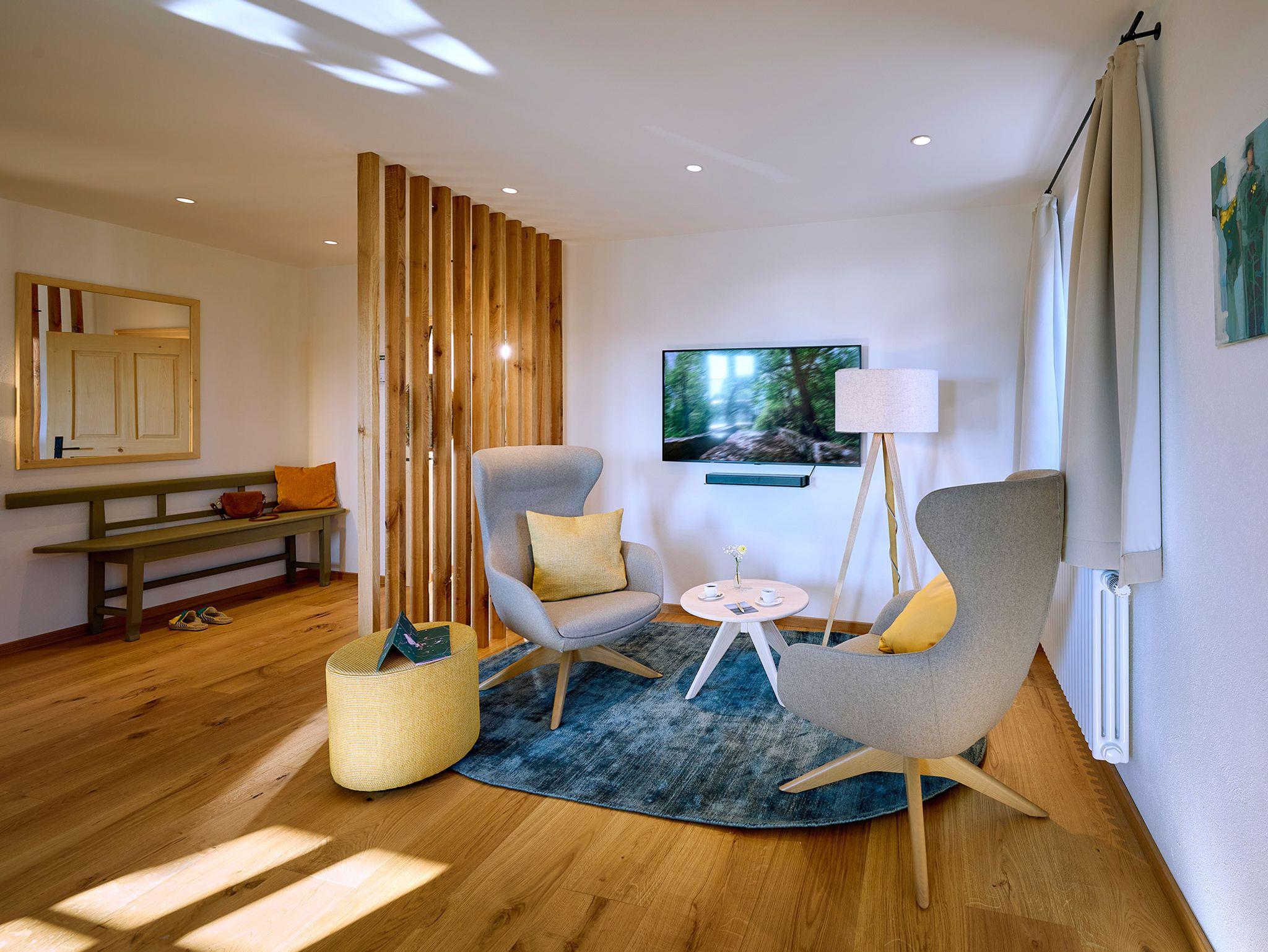 • Wohnbereich mit gemütlichen Sesseln, Smart-TV und Bose-Soundbar