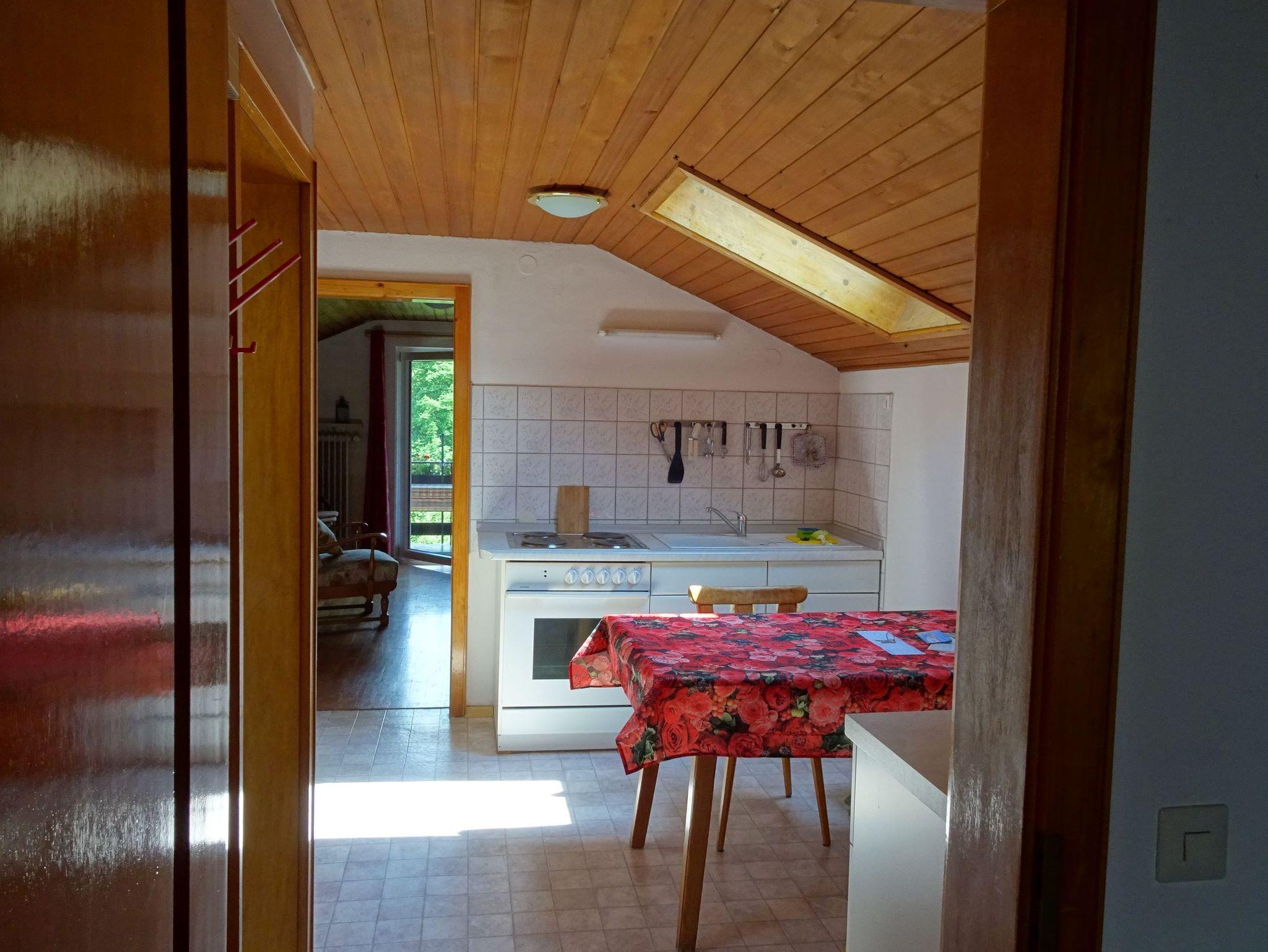 2. Etage-Mansarde, 50 qm, Wohnküche mit Küchenzeile und Essplatz, Schlafzimmer, Wohnraum mit TV und Radio, Dusche/Wc, Balkon mit Morgensonne, Blick zur Kampenwand.