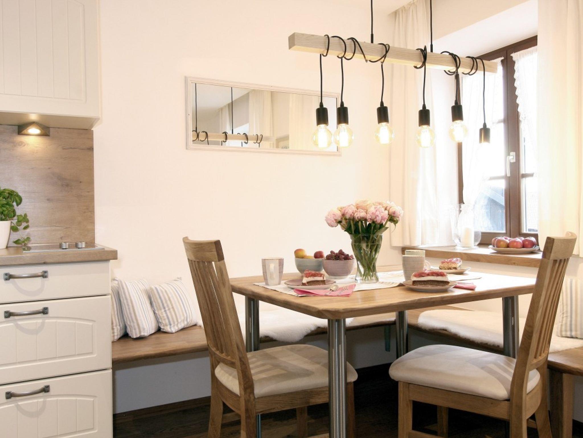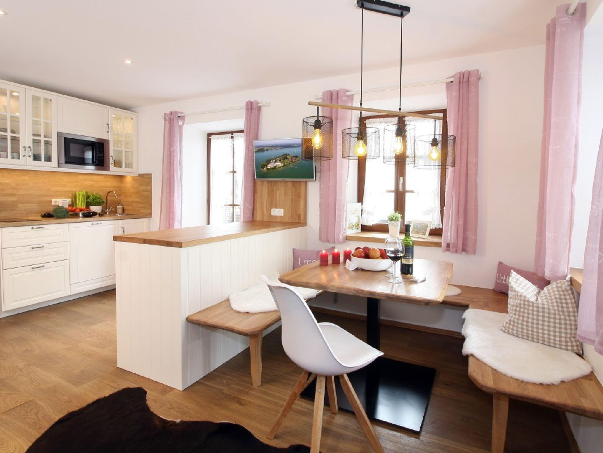 Die geräumige Ferienwohnung im 1. OG ist im gemütlichen Landhausstil modern und hochwertig eingerichtet und hat einen eigenen Zugang zum Balkon mit herrlichem Blick auf Ufer, See und Berge.