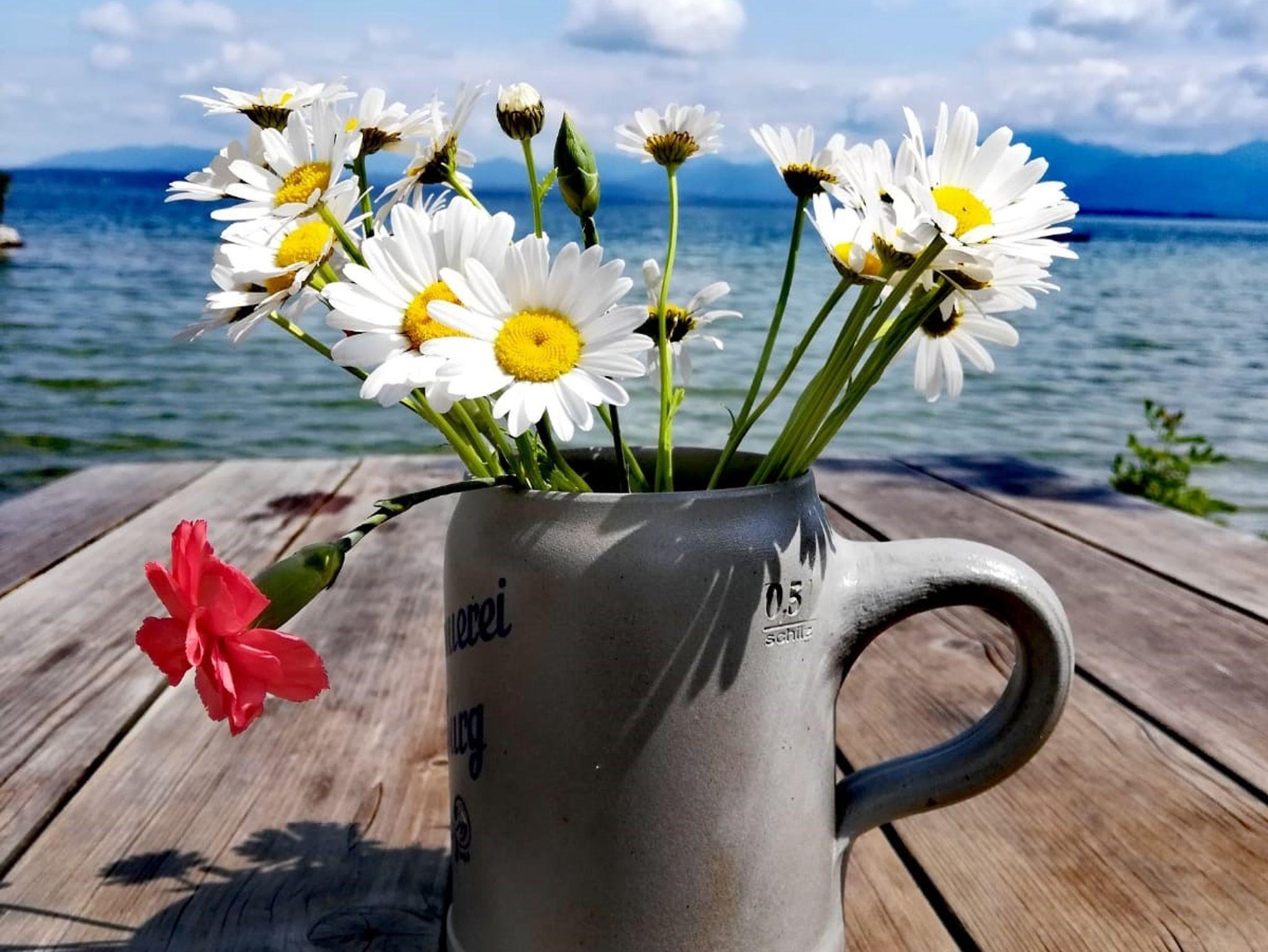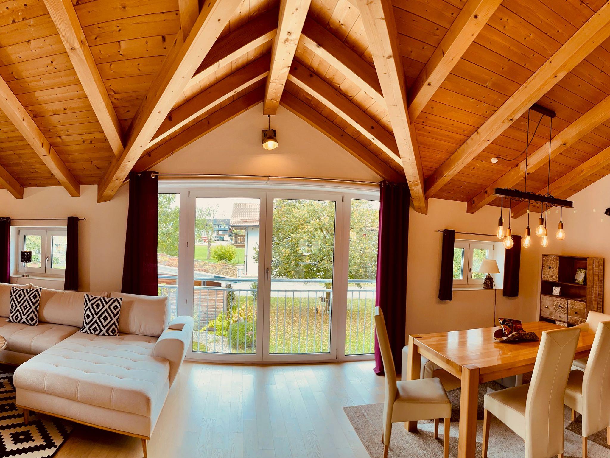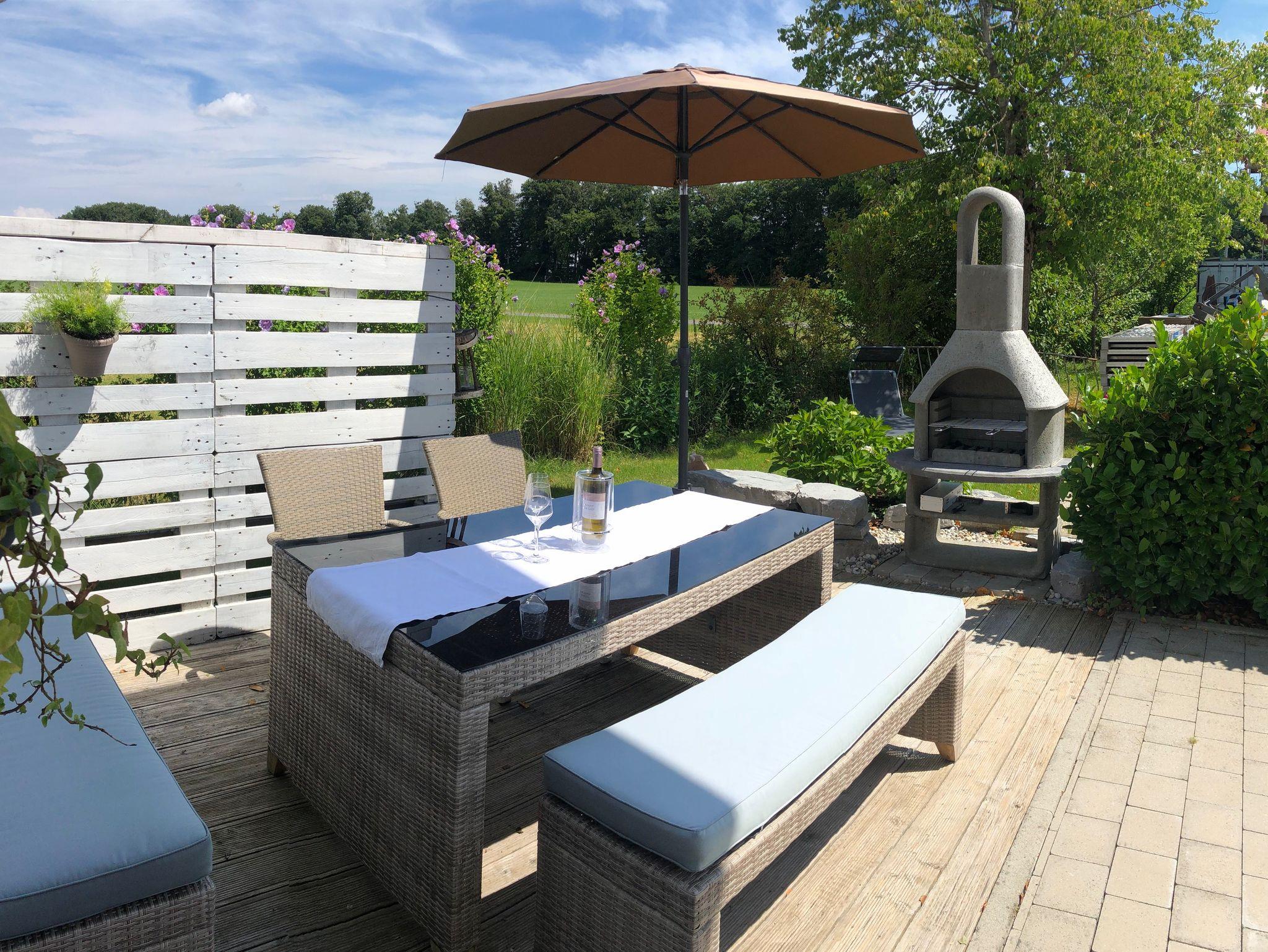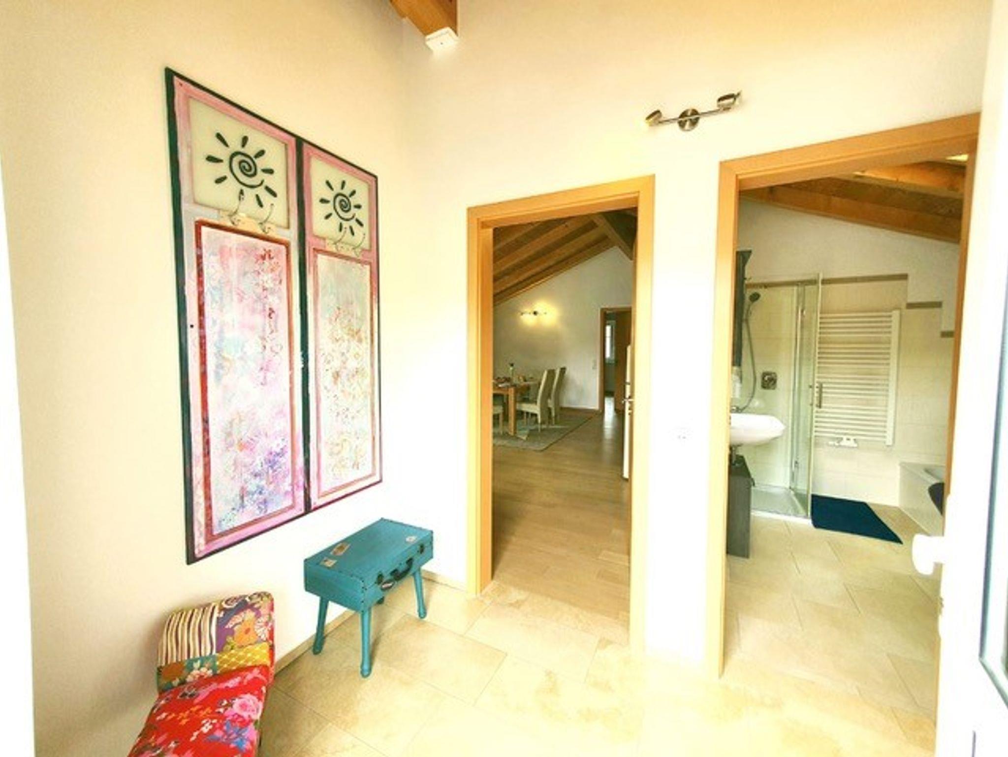 Fühlen Sie sich wohl in der gemütlichen, geräumigen FeWo mit Sichtdachstuhl im 1. OG mit separatem Eingang über eine Außentreppe in freistehendem Gebäude. Das Strandbad mit Spielplatz und Kiosk ist zu Fuß in 5 Min. erreichbar. Die Bushaltestelle (Chiemseeringlinie) und eine Bäckerei mit Einkaufsmöglichkeit sind in unmittelbarer Nähe. Besonderheiten: Terrasse mit Grill-Kamin, Carport, Abstellmöglichkeit für Anhänger, abschließbarer Abstellraum, Abholung vom Bahnhof sowie Einkaufs- und Wäscheservice auf Anfrage möglich, Nichtraucher, keine Haustiere, Terrasse, ganzjährig buchbar.