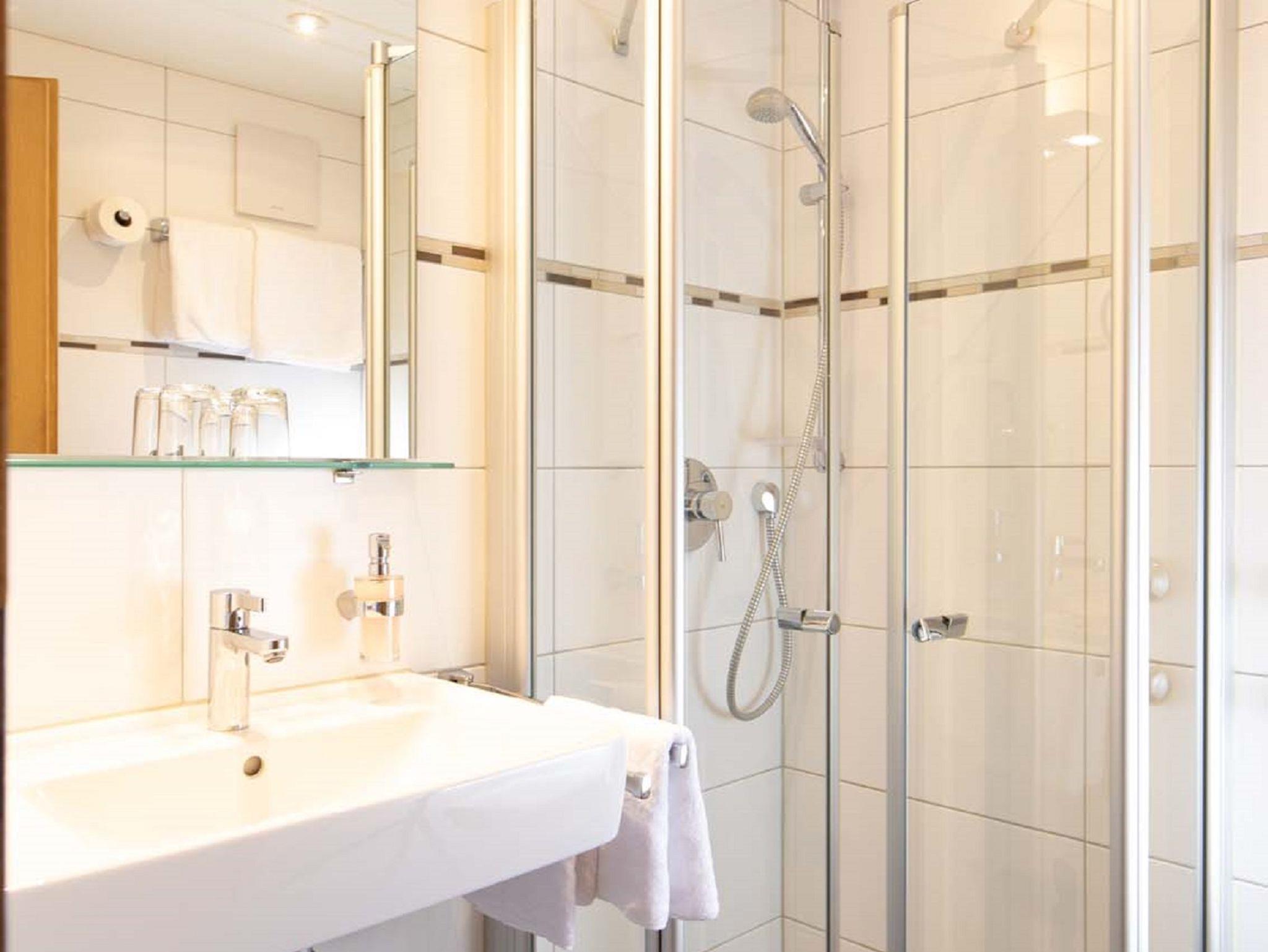 Unser Einzelzimmer mit Dorfblick verfügt über ein bequemes 140cm-Bett, Flachbild-TV, kostenfreies W-LAN, Durchwahltelefon, eine kleine Sitzecke, einen Mini-Kühlschrank, eine Teestation (Wasserkocher), ein modernes Bad mit Dusche, Toilette, Haarföhn, Seifenspender.