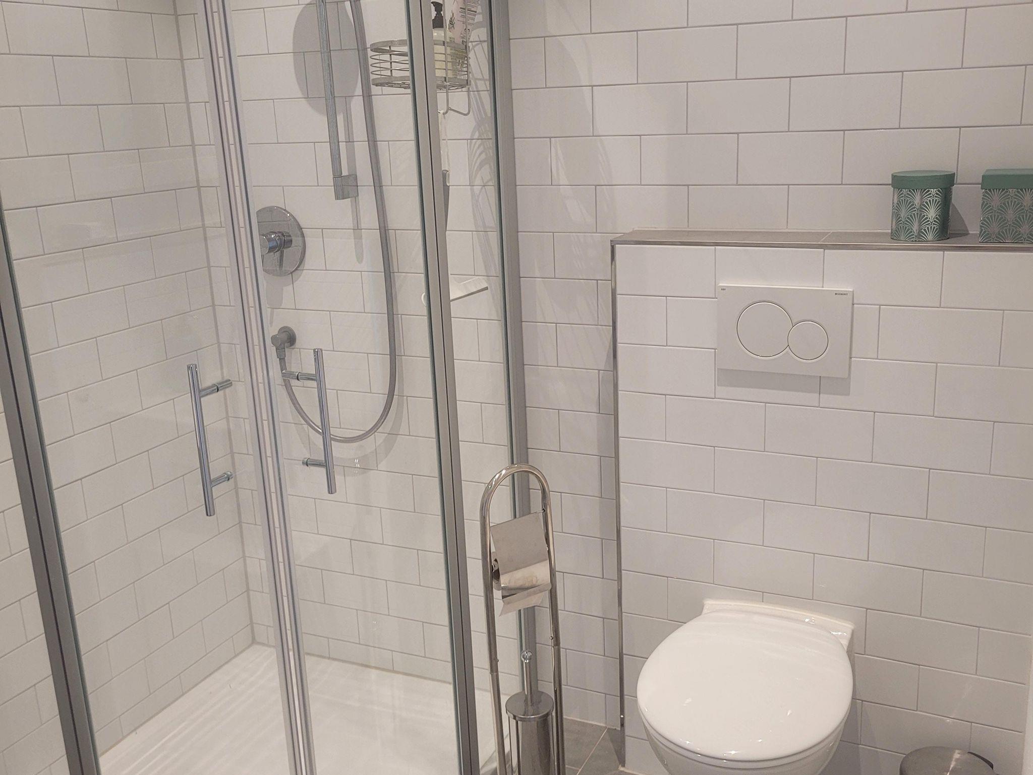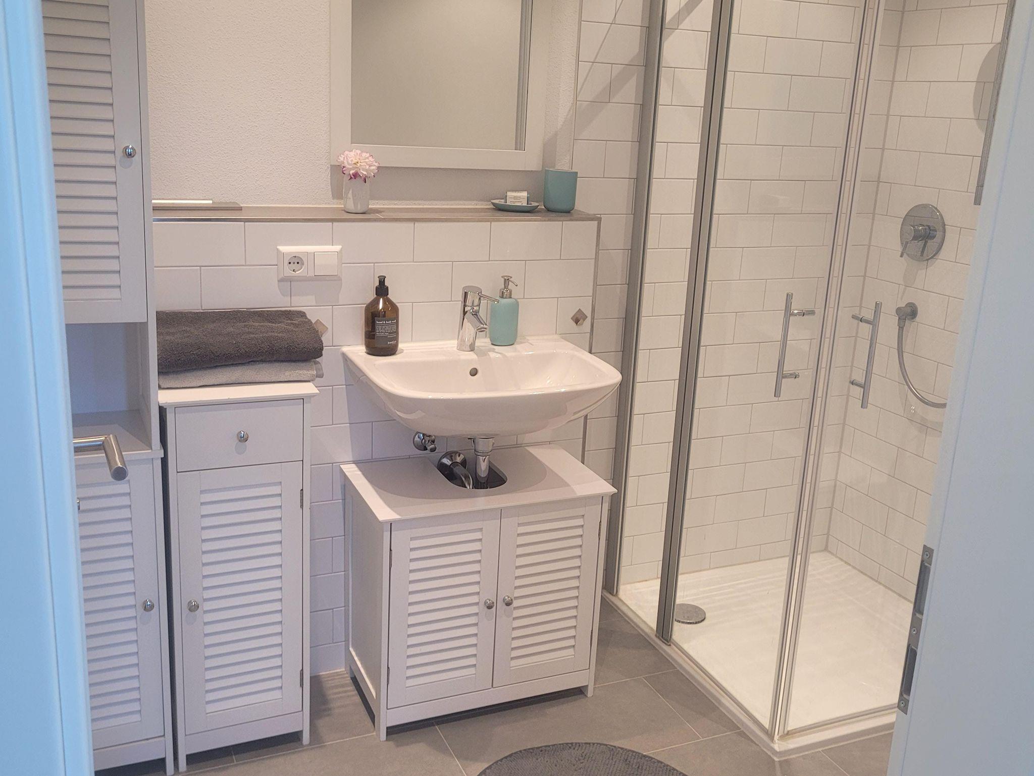 Im Badezimmer mit Dusche sind Handtücher und Fön vorhanden.