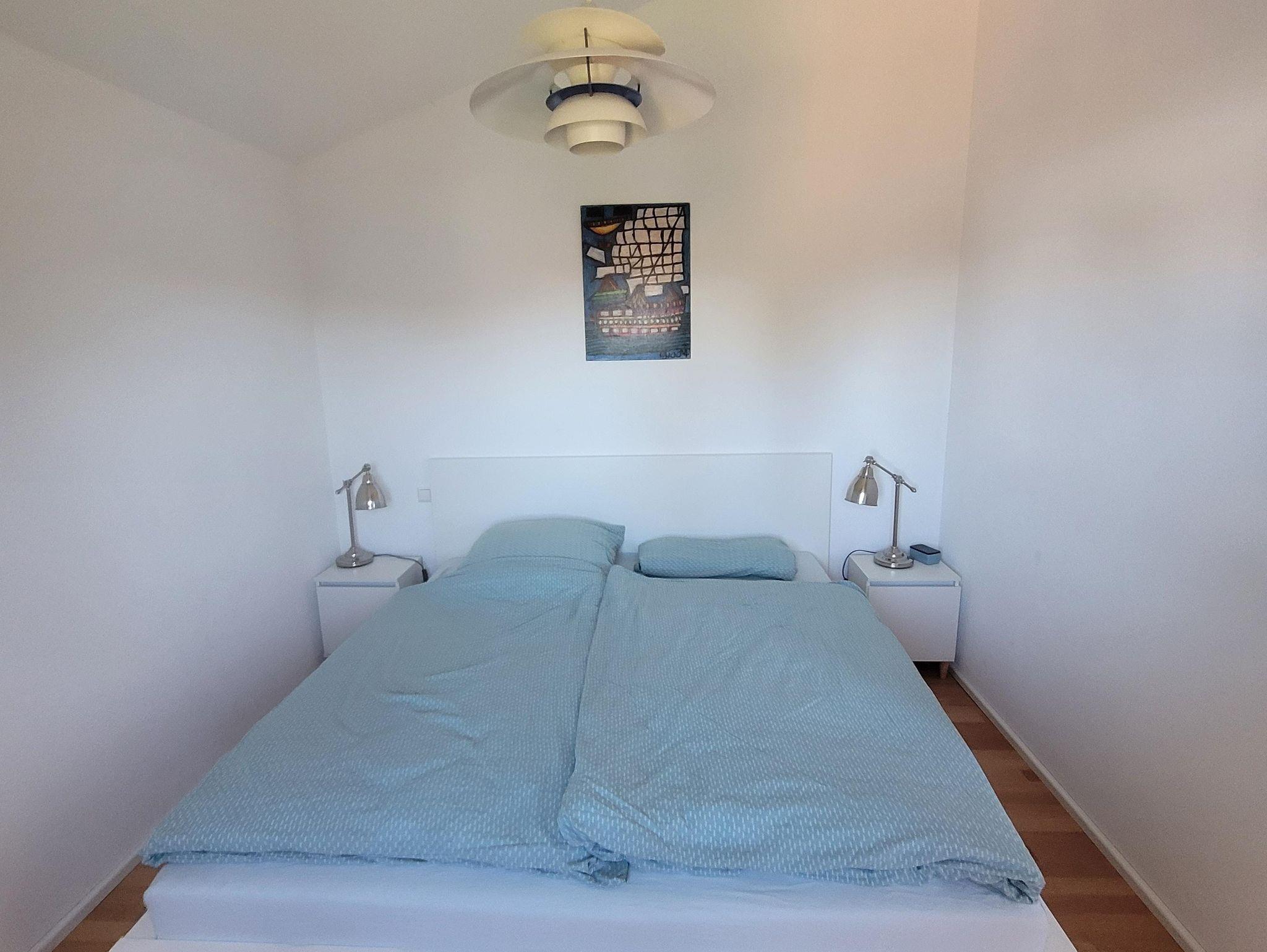 Das Schlafzimmer hält Bettwäsche und einen ausreichend großen Kleiderschrank bereit.