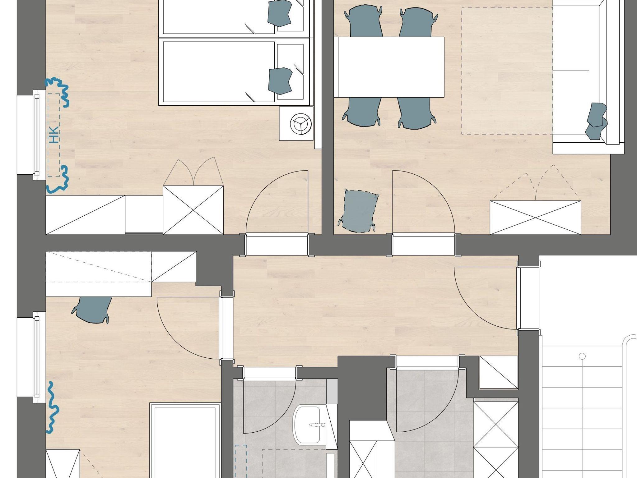 Zimmeraufteilung: 1 Bad mit Dusche, Einbauküche,1 Schlafzimmer mit Doppelbett, 1 Schlafzimmer mit 1 Einzelbett, 1 Wohnzimmerzimmer mit 1 Schlafsofa