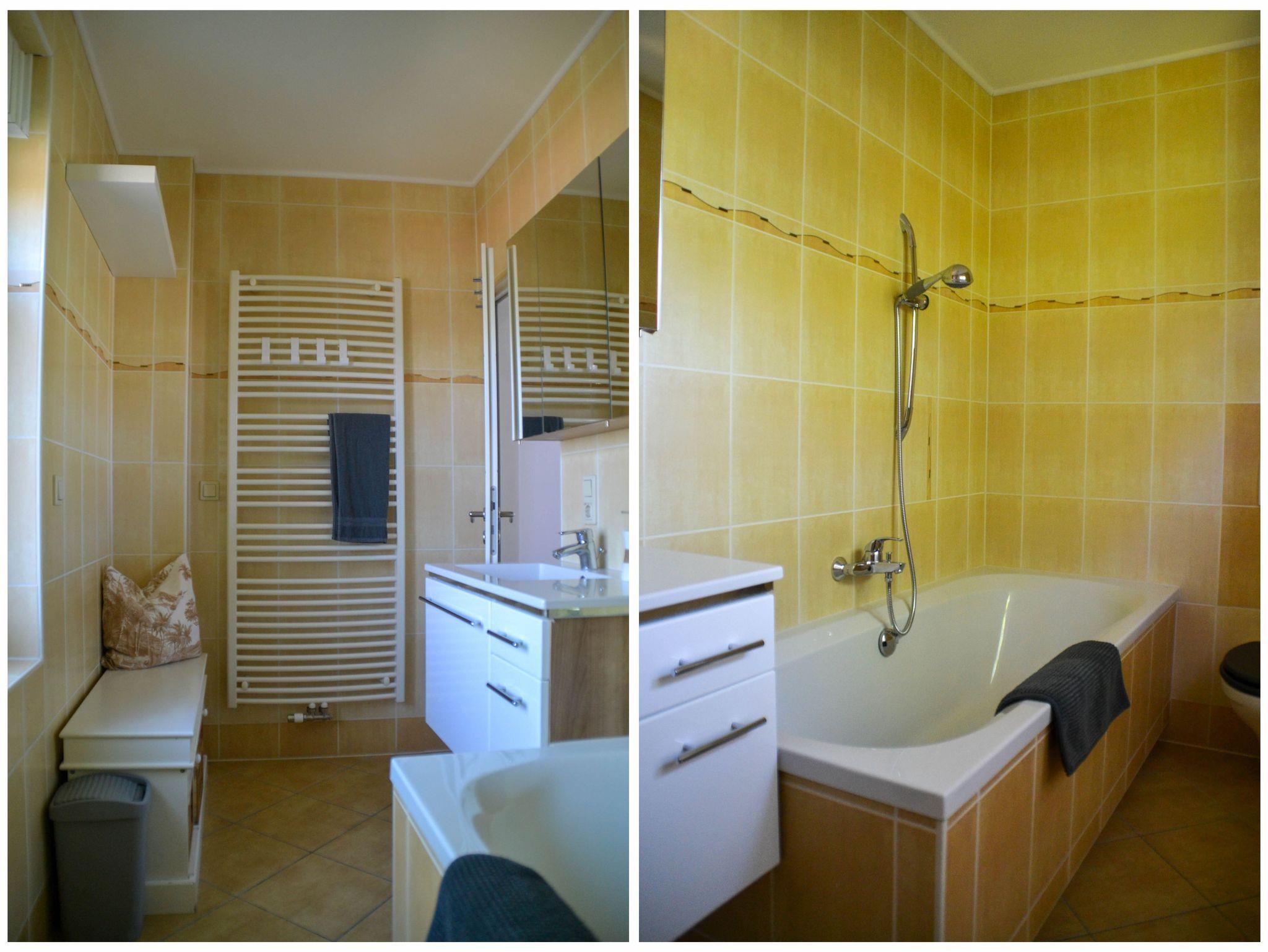 Bad: Badewanne, Toilette, Waschtisch und Handtuchtrockner