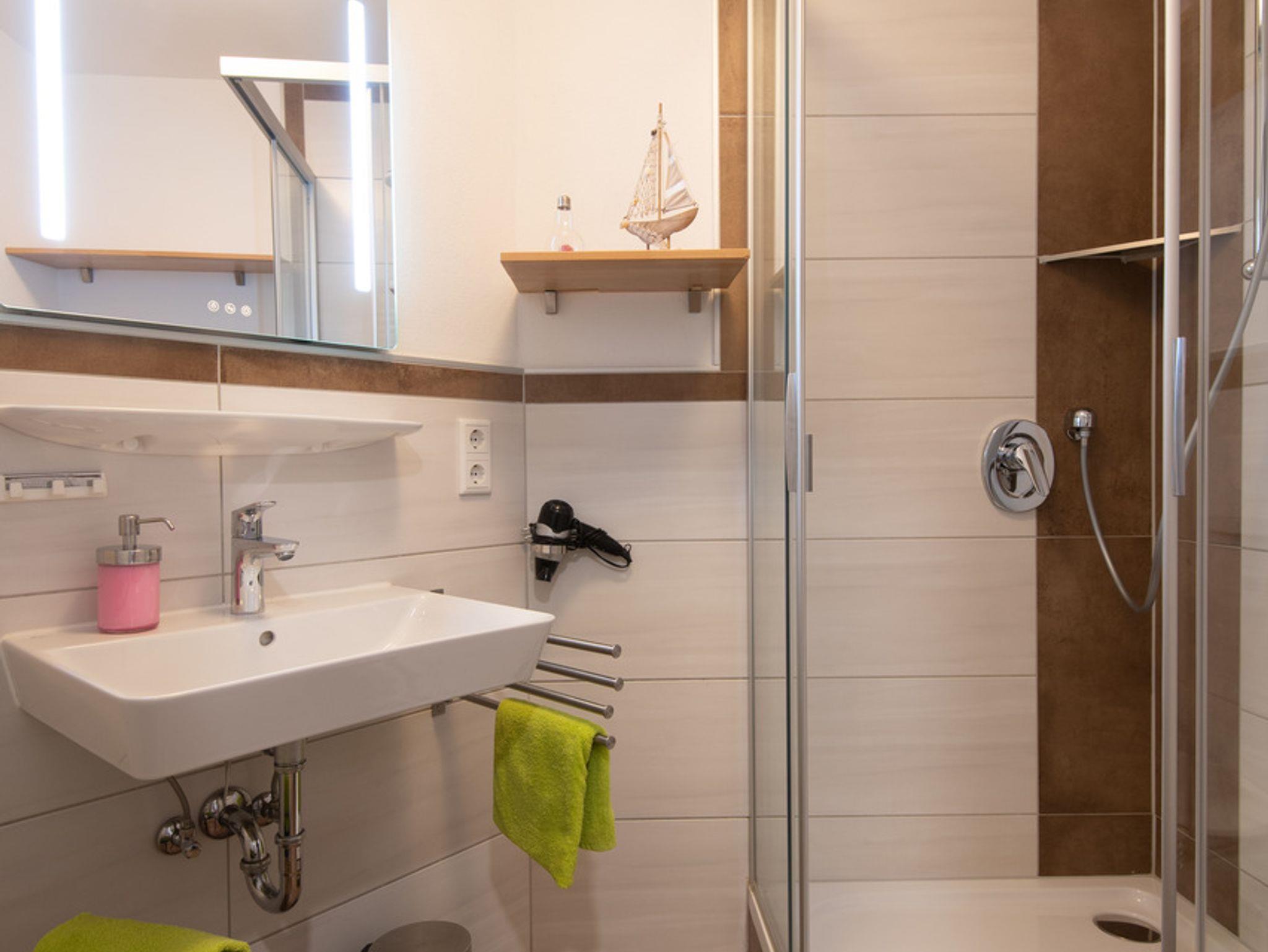 Bad mit Waschbecken, Handtuchtrockner, Föhn, Wc. und ebenerdiger Dusche. An allen Fenstern Aussenrollos und in Schlafräumen Fliegengitter.