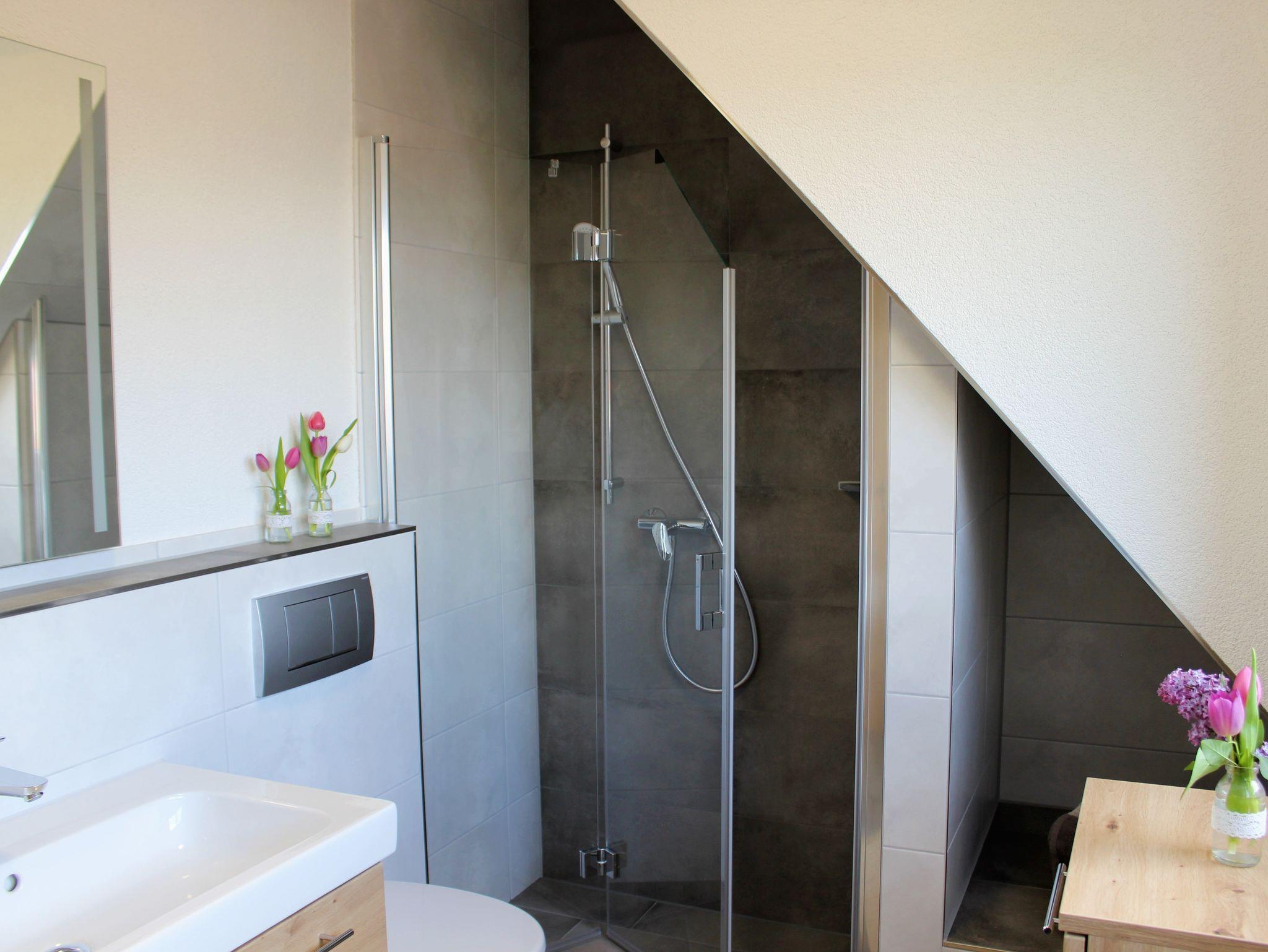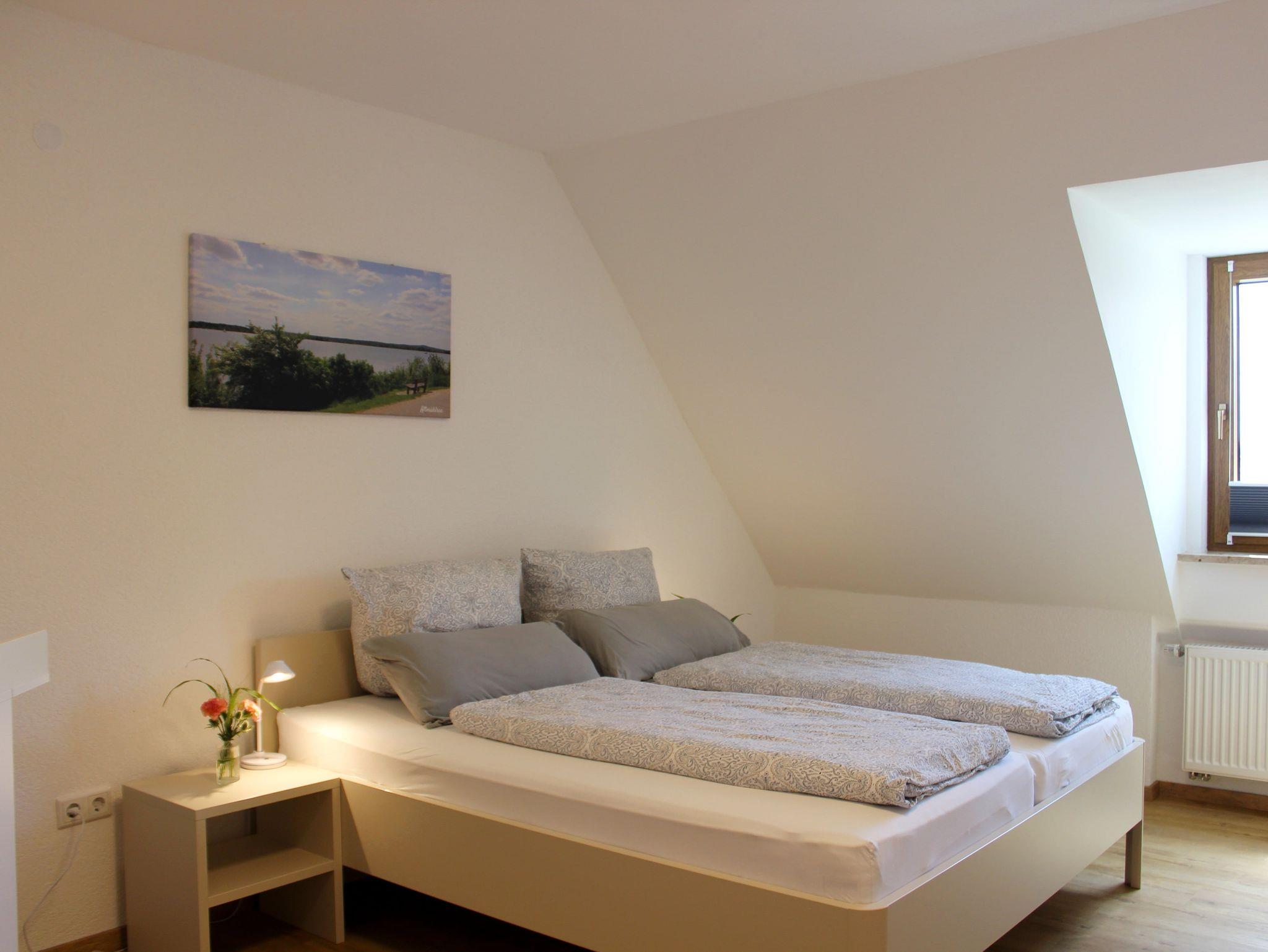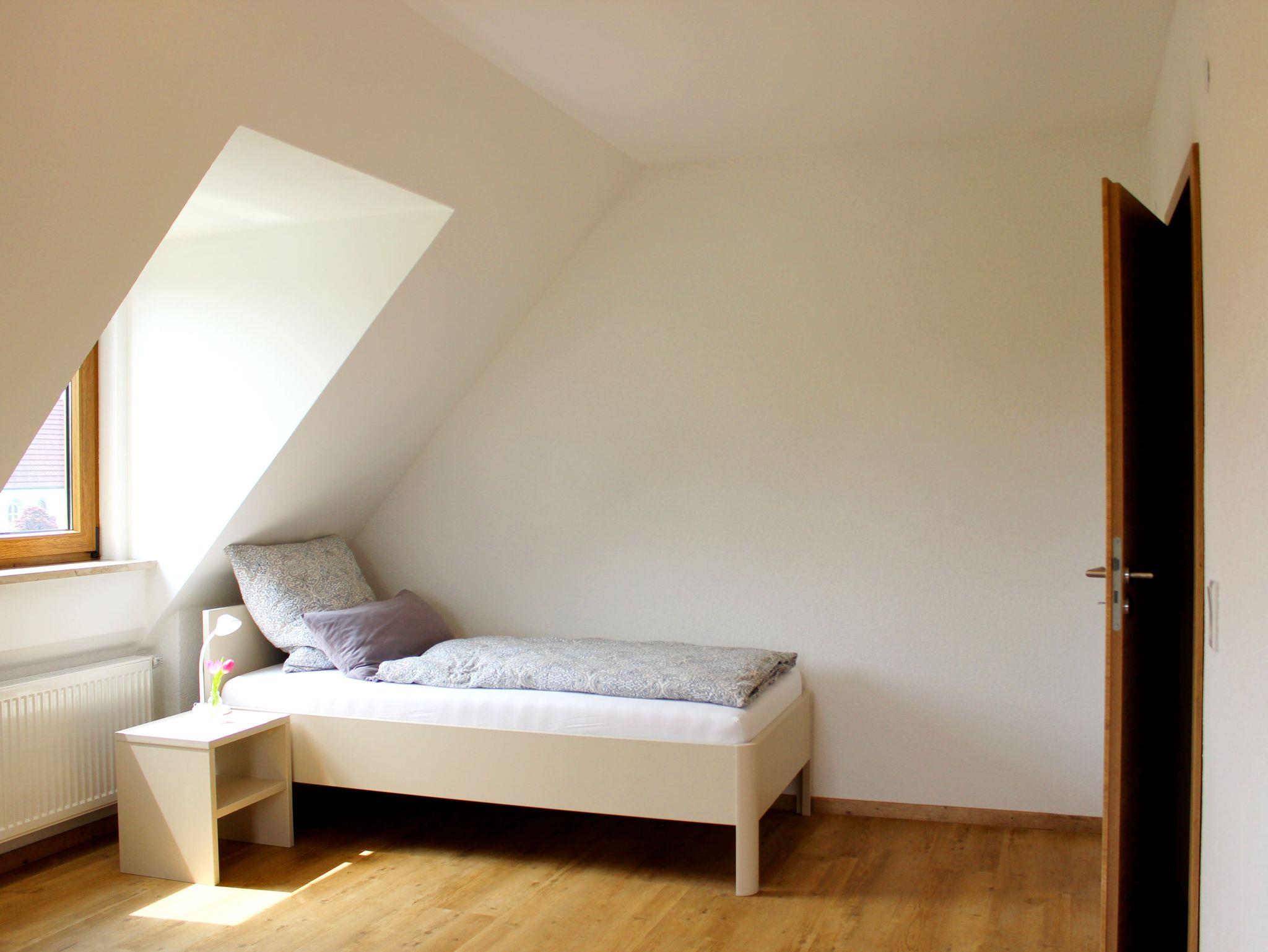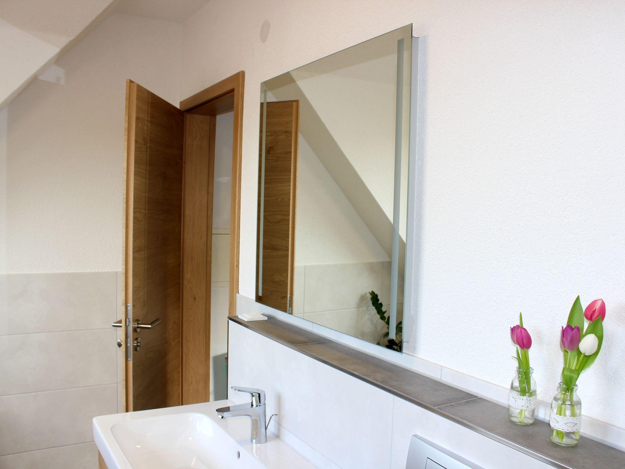 Unsere Ferienwohnung mit 75 m² Wohnfläche im ersten Stock bietet Platz für bis zu 4 Personen. Die Wohnung verfügt über ein geräumiges Kinderzimmer mit zwei Einzelbetten (200cm x 90cm). Das nebenanliegende Elternschlafzimmer besitzt ein großes Doppelbett (200cm x 180cm). Ein Beistellbett, eine Wickelkommode, ein Hochstuhl und eine Trittstufe sind vorhanden. Das geräumige Wohnzimmer mit Essbereich ist mit einem Satelliten-TV, einer Couch, zwei Sitzsäcken und großem Esstisch ausgestattet. Die Balkone sind vom Wohnzimmer und Kinderzimmer aus zugänglich und bieten einen Sonnenschirm und eine Sitzgelegenheit mit Tisch. Die komplett ausgestattete Küche lässt mit einem Herd, Backofen, Kühlschrank mit Gefrierfach, Spülmaschine, Kaffeemaschine, Espressokocher, Mikrowelle, Stabmixer, Toaster und Wasserkocher keine Wünsche offen. Im Bad befinden sich eine geräumige ebenerdige Dusche und ein großer beleuchteter Spiegel. Zudem ist ein Föhn vorhanden. Im Übernachtungspreis sind Endreinigung, Nebenkosten, PKW-Stellplatz, die gesetzlich gültige Mehrwertsteuer, Bettwäsche, Hand-, Spül- und Geschirrtücher sowie Toilettenpapier enthalten. Küchentücher, Spülmittel und ein Staubsauger stehen bereit.
