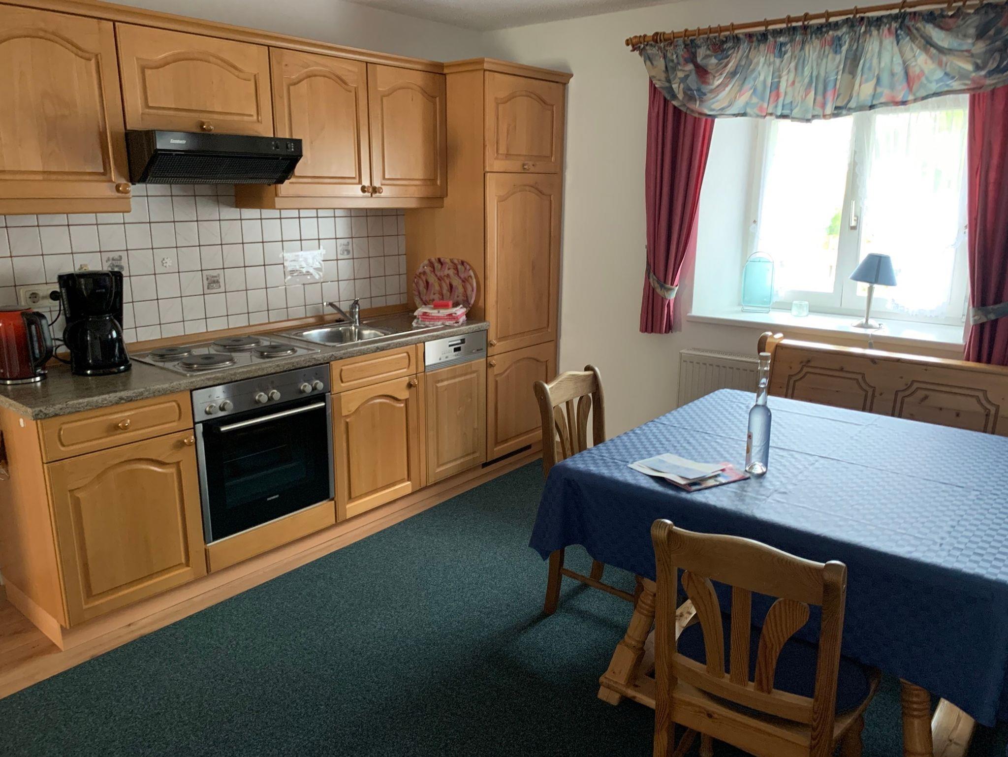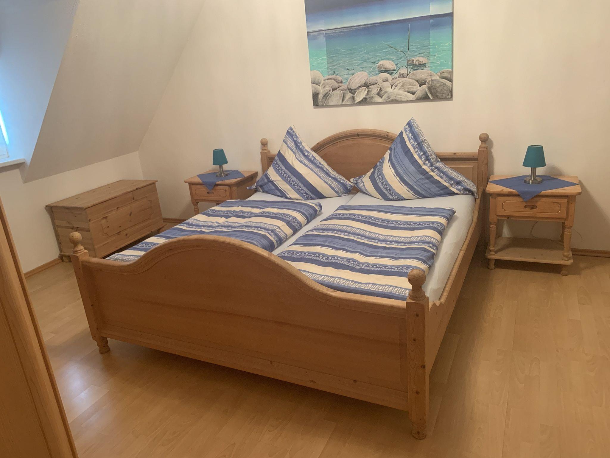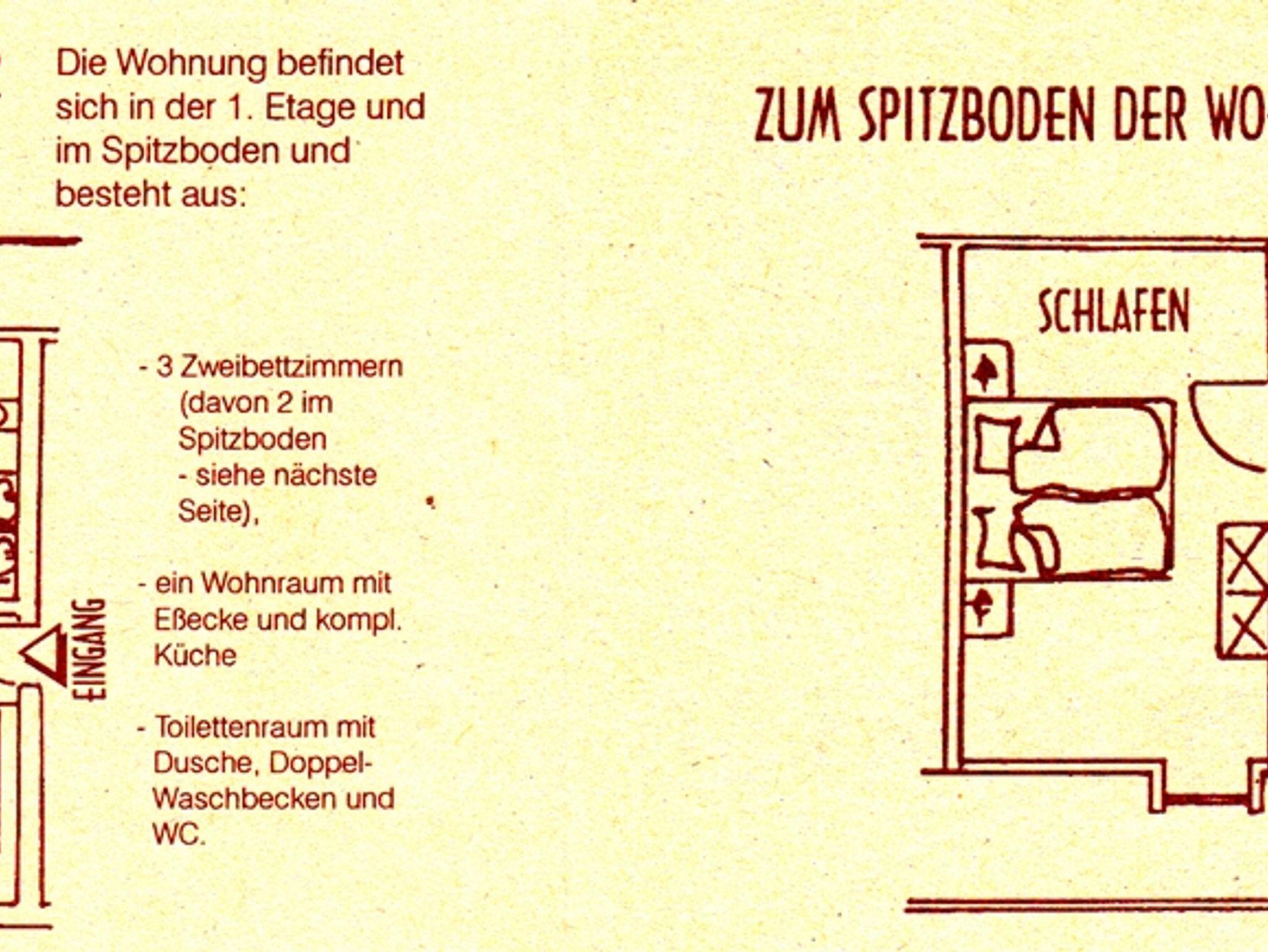 Unsere Wohnung 2 ist mit ca. 95 qm unsere größte Wohnung. Die in sich abgeschlossene Wohneinheit umfasst insgesamt drei Schlafräume. Ein Zweitbettzimmer befindet sich in der 1. Etage, das Doppelzimmer mit Kinder-/Babybett und ein weiteres Zweibettzimmer liegen im Dachgeschoss. Der großzügige Wohnraum ist kombiniert mit einer Essecke, einer Couchgarnitur, Sat-TV und einer komplett ausgestatteten Küche (inklusive Spülmaschine, Kühlschrank, Kaffeemaschine, Wasserkocher, Backofen, Toaster). Im Badezimmer mit Fenster befindet sich eine Dusche, ein Doppelwaschbecken und ein WC.