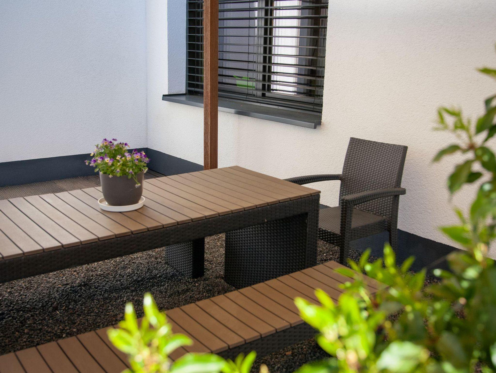 Stilvoller Außenbereich mit gemütlichen, gemeinschaftlich nutzbaren Sonnenterrassen