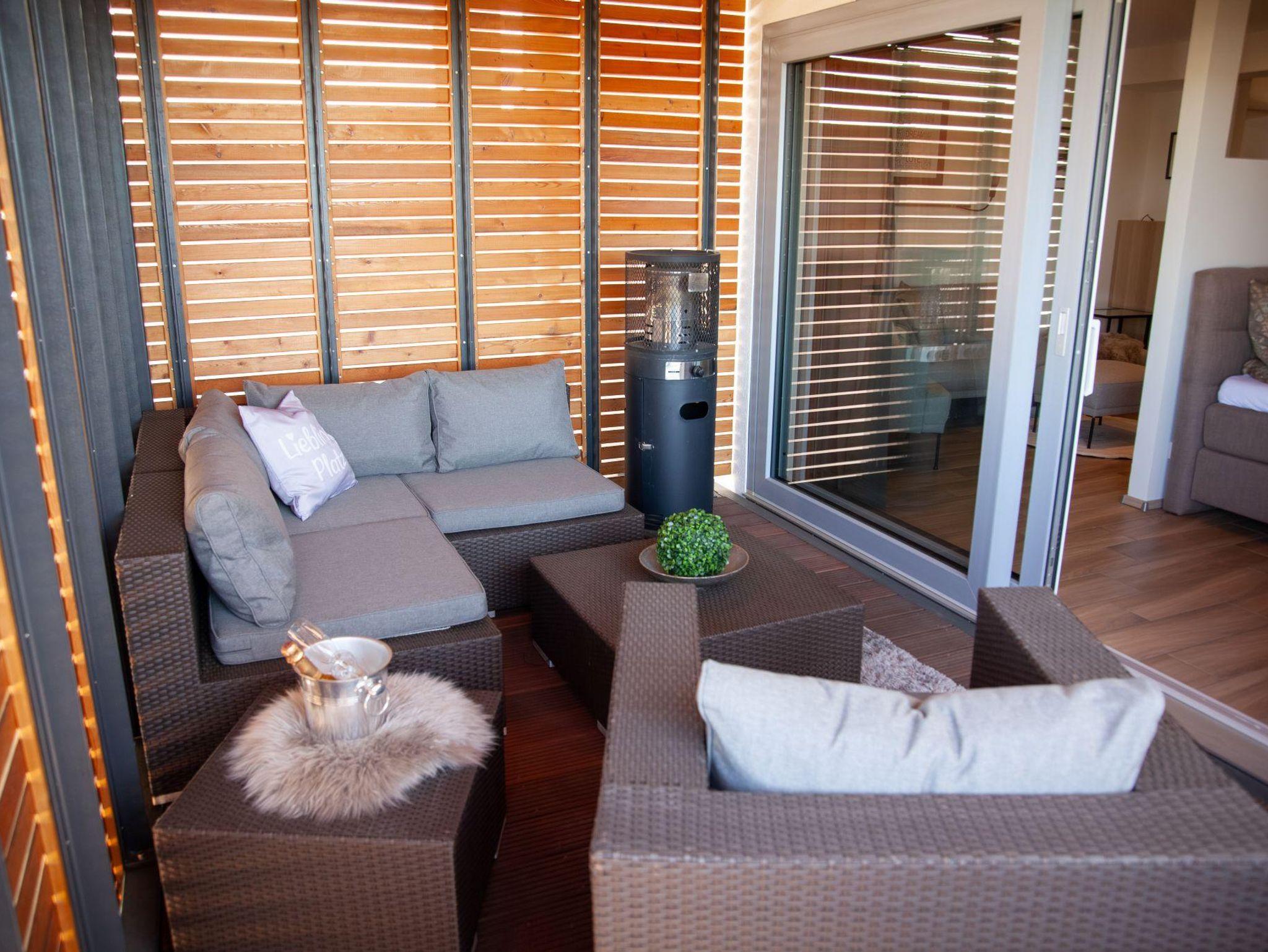 Überdachte Wohlfühlterrasse mit Loungemöbeln und Terrassenheizung