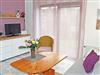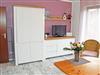Im Wohn- und Schlafraum mit großer Fensterfront (die über Jalousien zu verdunkeln ist) und Zugang zur Terrasse, befinden sich eine bequeme Schlafcouch mit Tisch und ein modernes Flachbild-TV-Gerät. Die Schlafcouch kann für 2 Gäste aufgebettet werden. Ein Kleinkind bis 3 Jahre kann zusätzlich in einem Kinderbett schlafen.