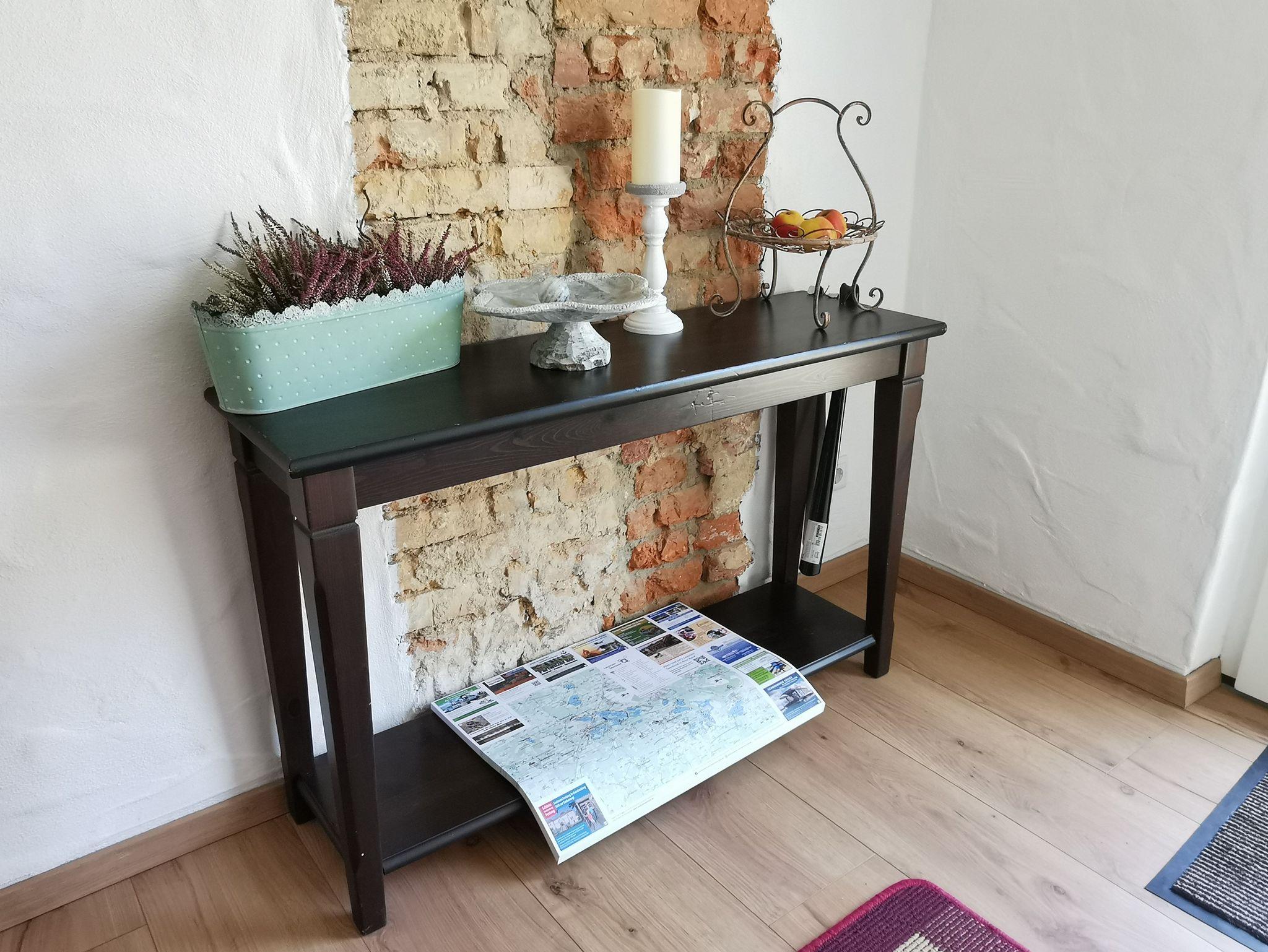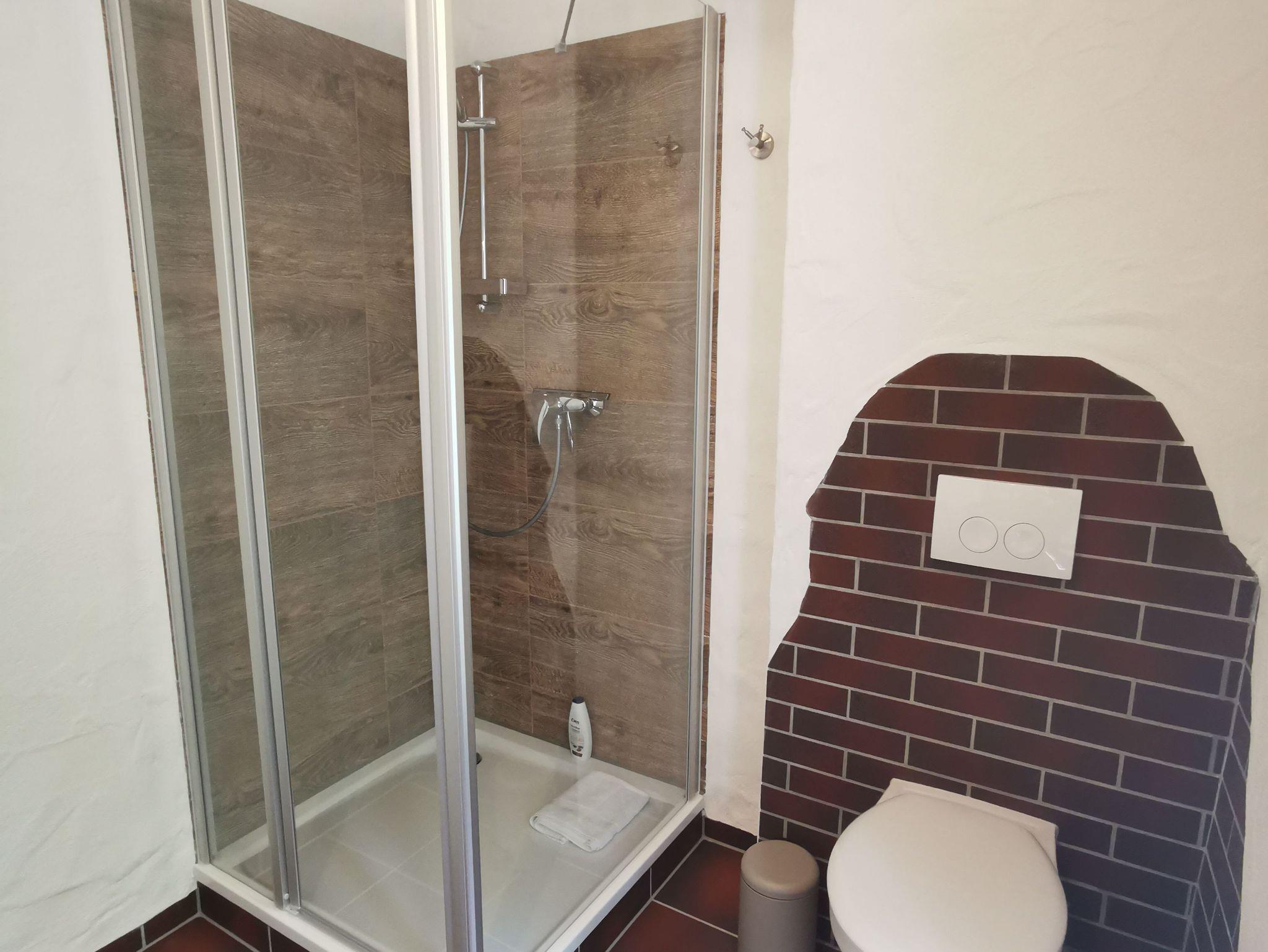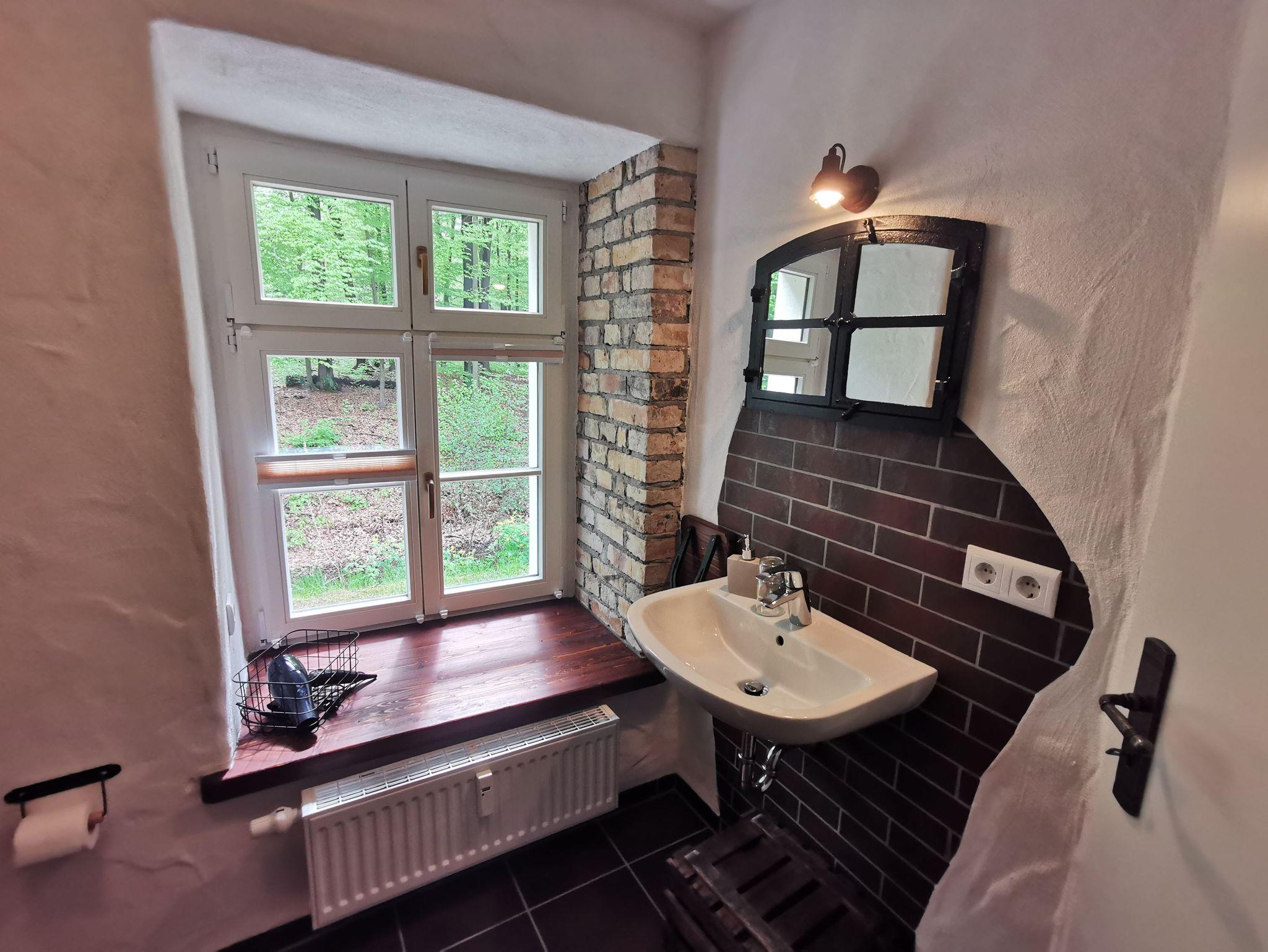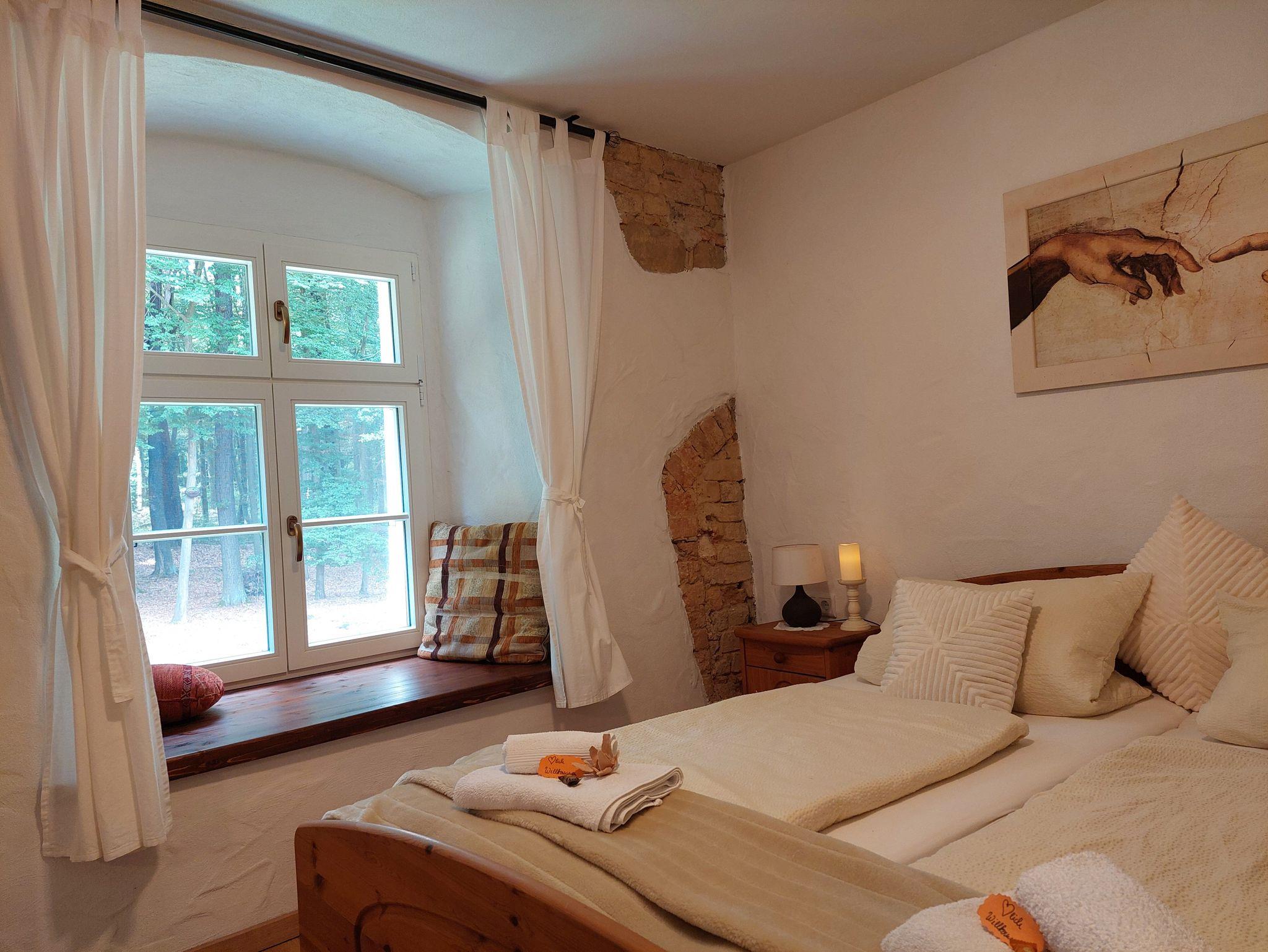 Passend zum Namen ist es ein ländliches Zweibettzimmer, mit einem gemütlichen Doppelbett (1,80×2,00 m). Sie können von diesem Zimmer aus dem Bett heraus in den Wald schauen. Gern können Sie sich auch auf die 60 cm tiefe Fensterbank setzen und dabei ein Buch lesen oder einfach nur in den Wald schauen und die Seele baumeln lassen. Das Zimmer folgt dem Landhausstil mit rustikalem Einfluss, welcher zum Beispiel durch einen alten Balken um 1850 zum Vorschein kommt. Es wird teilweise originales, altes Sichtmauerwerk gezeigt.