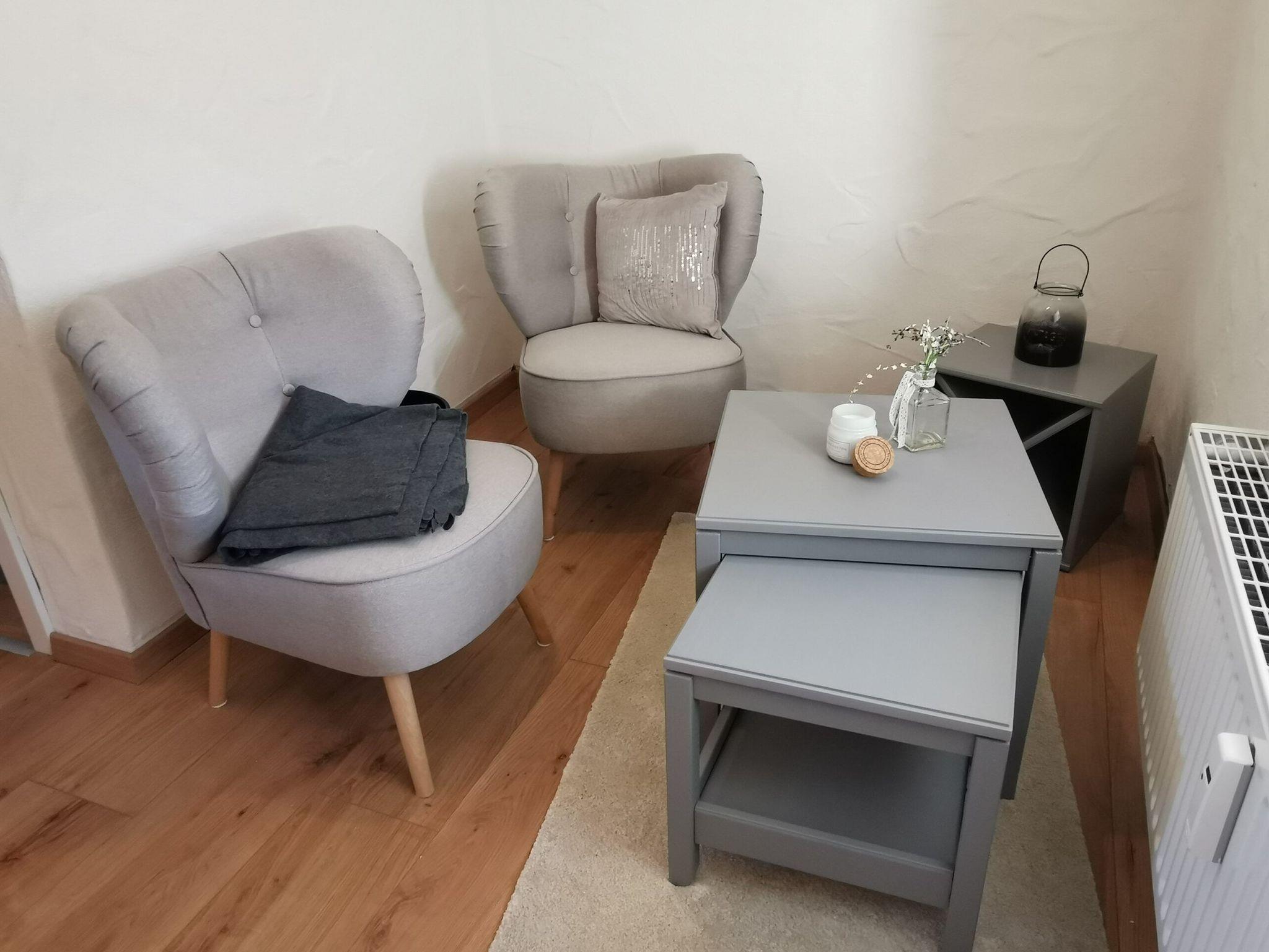 Das Zimmer liegt als einziges in der ganzen Anlage im ersten Obergeschoss und ermöglicht dadurch einen weitläufigen Blick in den dahinterliegenden Wald. Das Zimmer verfügt über ein Doppelbett in den Maßen 1,60x2,00 m. Von den zwei kleinen Sesseln lässt sich wunderbar der Wald beobachten.