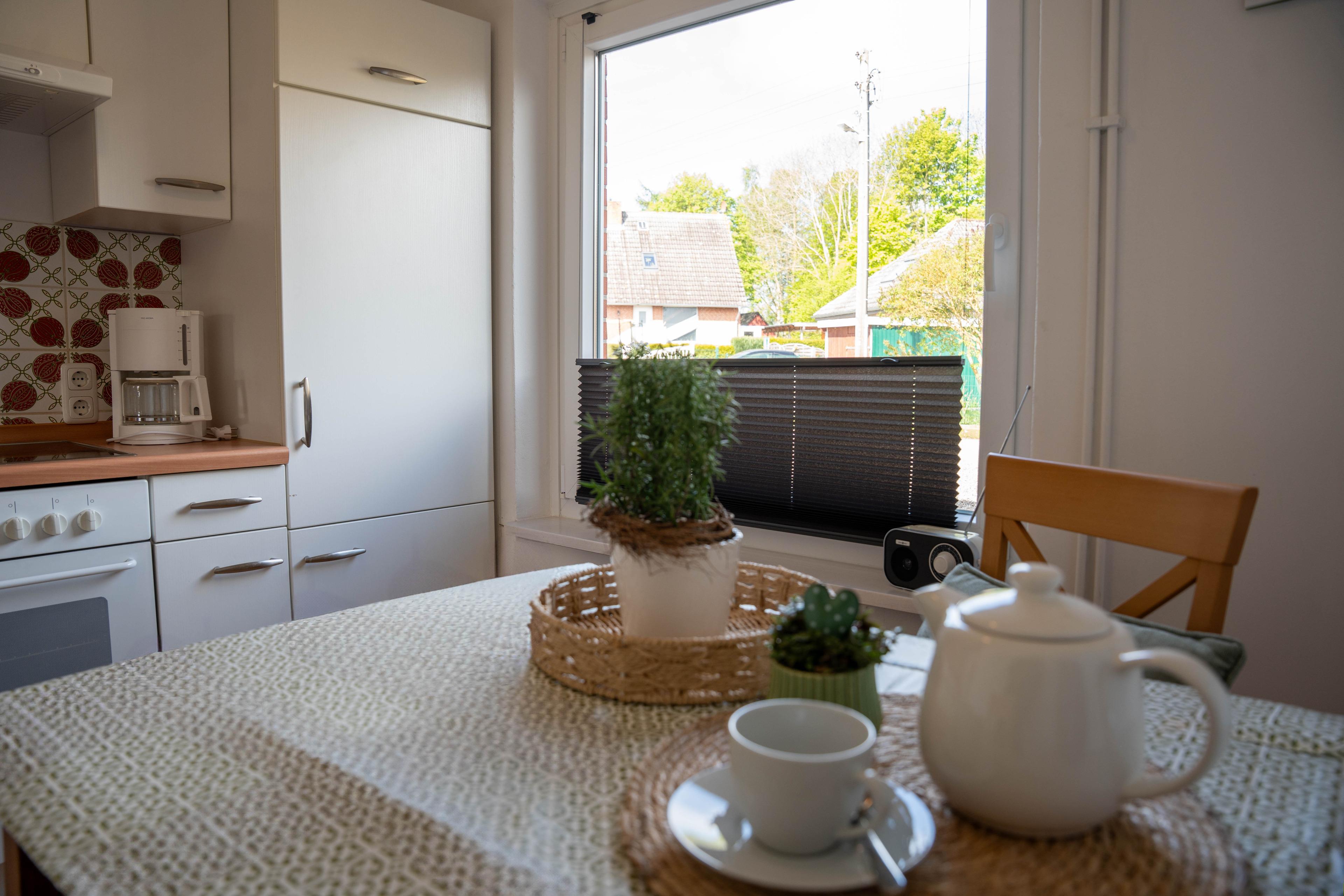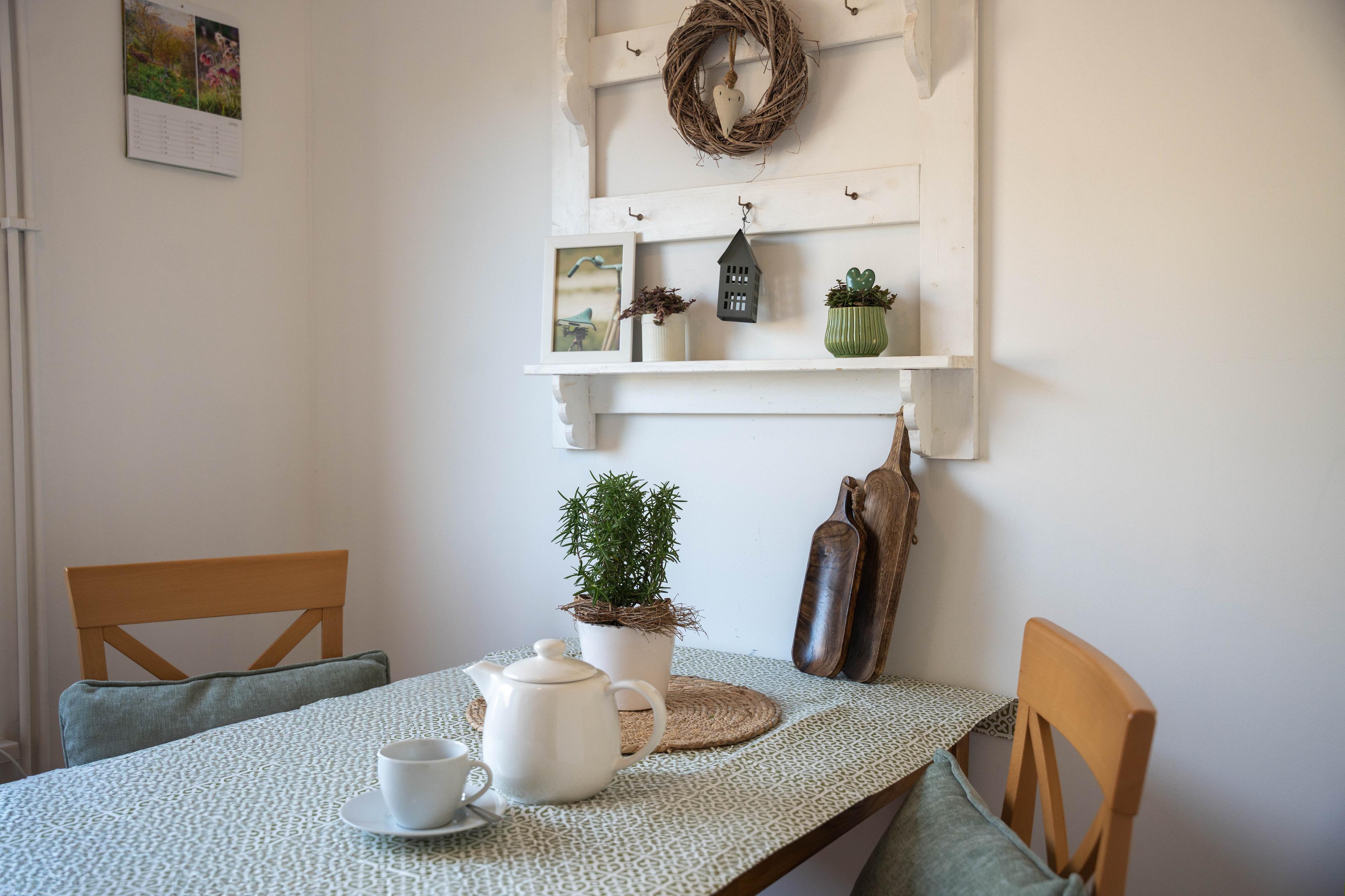 Die Aufteilung ist wie folgt. Wohnzimmer mit einem 2er Sofa und einem Sessel. Schlafzimmer mit Doppelbett, eine Panrty-Küche mit Essbereich sowie Bad mit Dusche und WC. Diese gemütliche und geschmackvoll eingerichtete Ferienwohnung ist für 2 Personen geeignet und bietet Ihnen viel Platz um den Urlaub zu geniessen. Die Pantry-Küche ist mit Herd, Backofen, Kaffeemaschine, Toaster und ausreichend Geschirr ausgestattet. Eine Terrasse bietet Ihnen im schönen Garten zusätlichen Platz und die Möglichkeit sich zu erholen. Haustiere sind auf Anfrage erlaubt. Ein Kfz Stellplatz ist vorhanden. Bettwäsche und Handtücher können hinzugebucht werden.