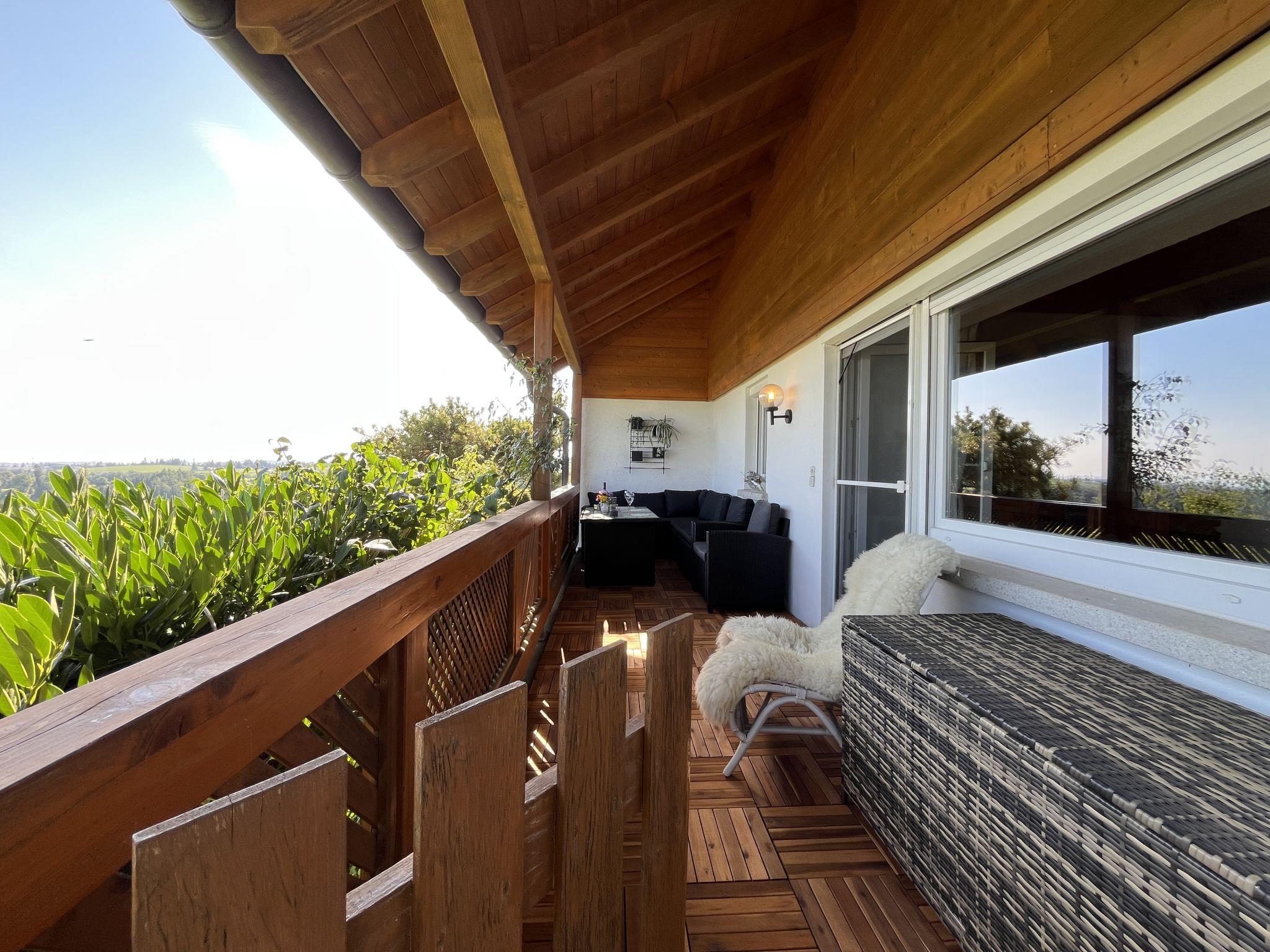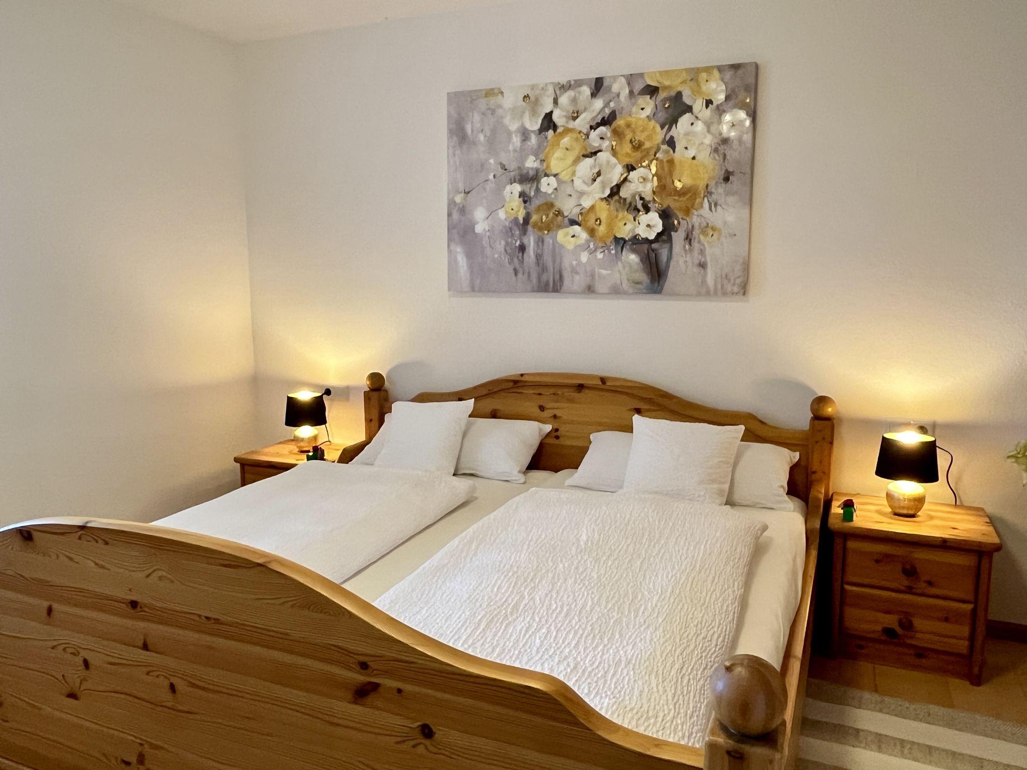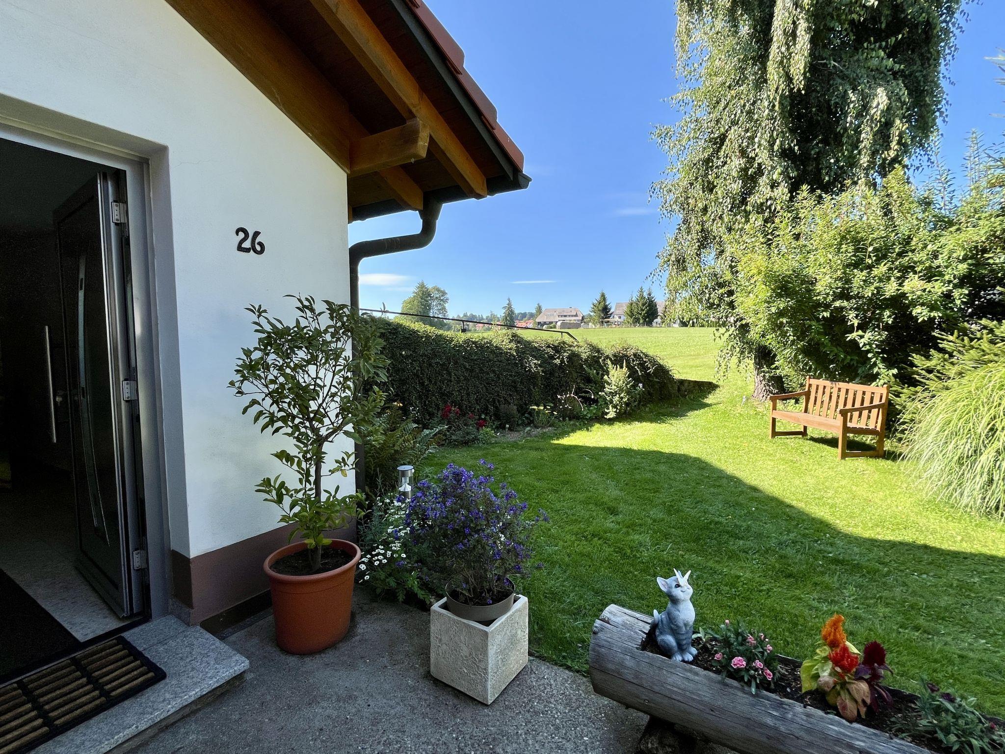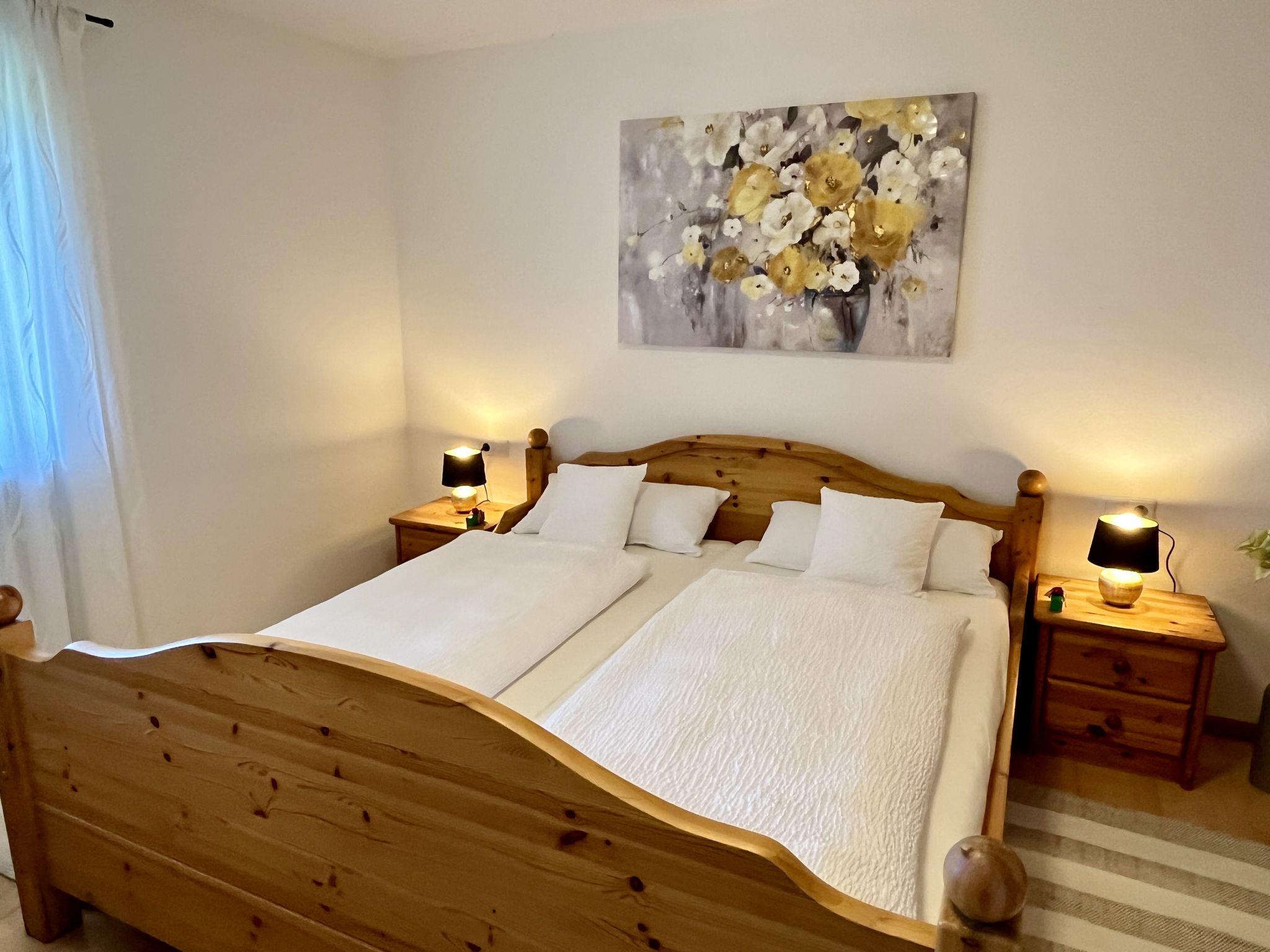 "Gustis Hüsli - Alpensicht & Natur pur", 4-room house 112 m2 on 2 levels. Spacious, partly renovated in 2024, cosy furnishings: entrance hall. Living room with satellite TV (flat screen). Exit to the garden, to the balcony. 1 room with 1 double bed (2 x 90 cm, length 200 cm), satellite TV (flat screen). Large kitchen-/living room (oven, dishwasher, 4 ceramic glass hob hotplates, toaster, kettle, microwave, electric coffee machine) with dining table. Bath/WC. Upper floor: 1 room with 1 double bed (2 x 90 cm, length 200 cm), satellite TV (flat screen). 1 room with 2 beds (90 cm, length 200 cm). Sep. WC. Heating. Large balcony, large patio, lawn 800 m2. Balcony furniture, barbecue, deck chairs (4). Marvellous panoramic view of Alps. Facilities: washing machine, mosquito net, children's high chair, hair dryer. Internet (WiFi). Parking at the house. Please note: non-smoking house. Maximum 1 pet/ dog allowed. Smoke alarm, fire extinguisher. Both TVs are SMART TVs. When there are less than the maximum number of guests staying at the property, not all of the bedrooms will be available for use.