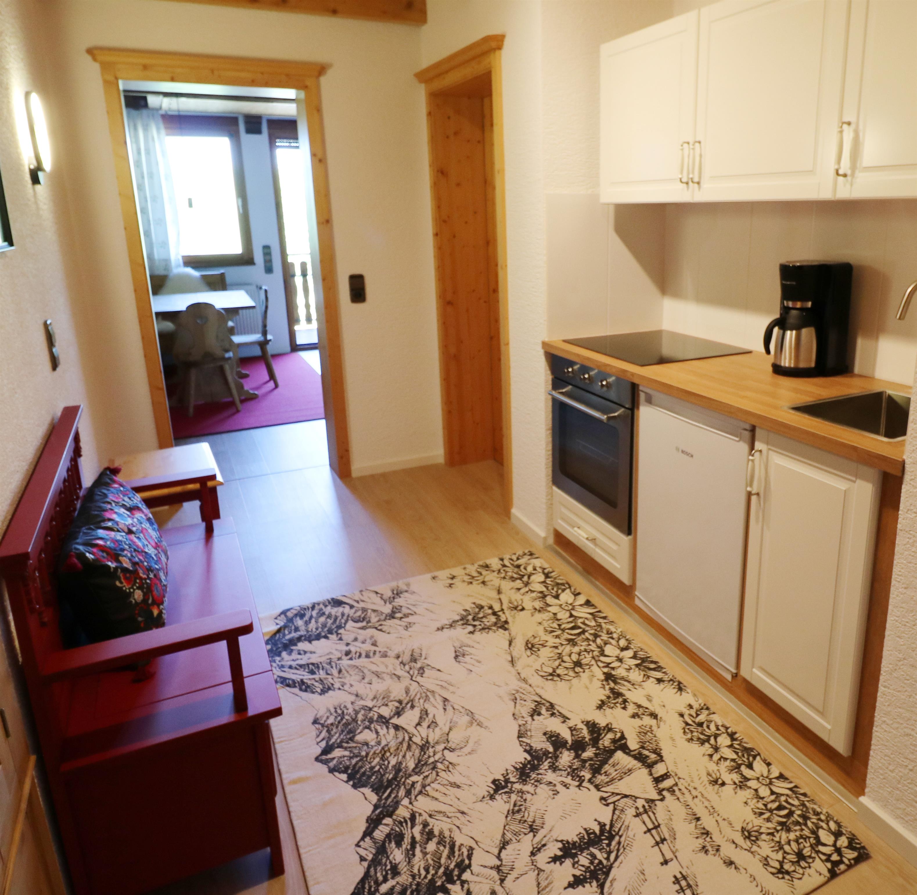 - 1 vollausgestattete Küchenzeile mit Herd mit 4 Kochfeldern, Kühlschrank mit Gefrierfach, Filterkaffeemaschine, Backofen, Toaster