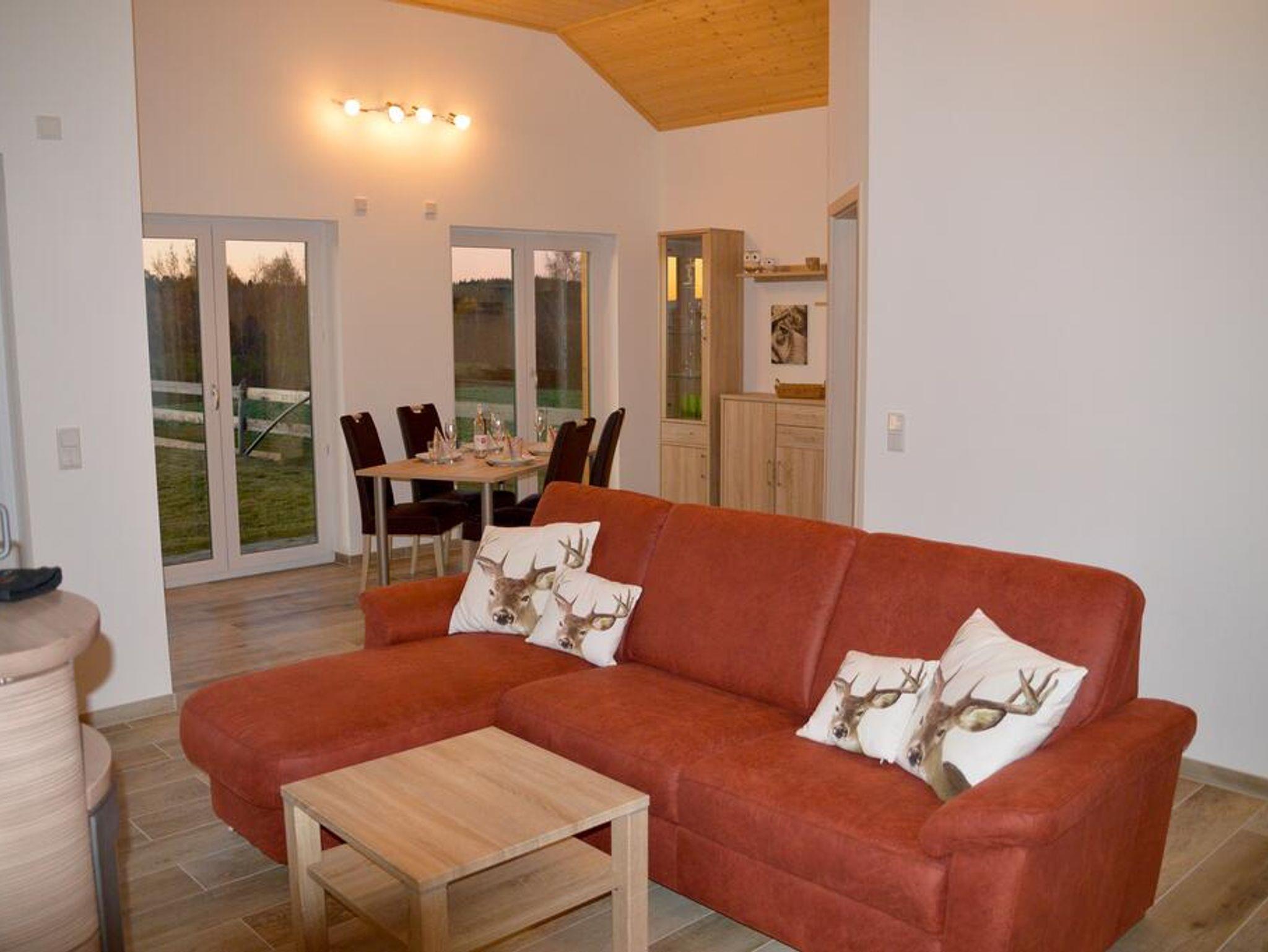 Das gemütliche Wohnzimmer mit TV, Couch und Schwedenofen lädt zu gemütlichen Fernseh- oder Spieleabenden ein. Das Holz für den Ofen kann entweder direkt vor Ort oder im nächsten Baumarkt erworben werden.