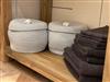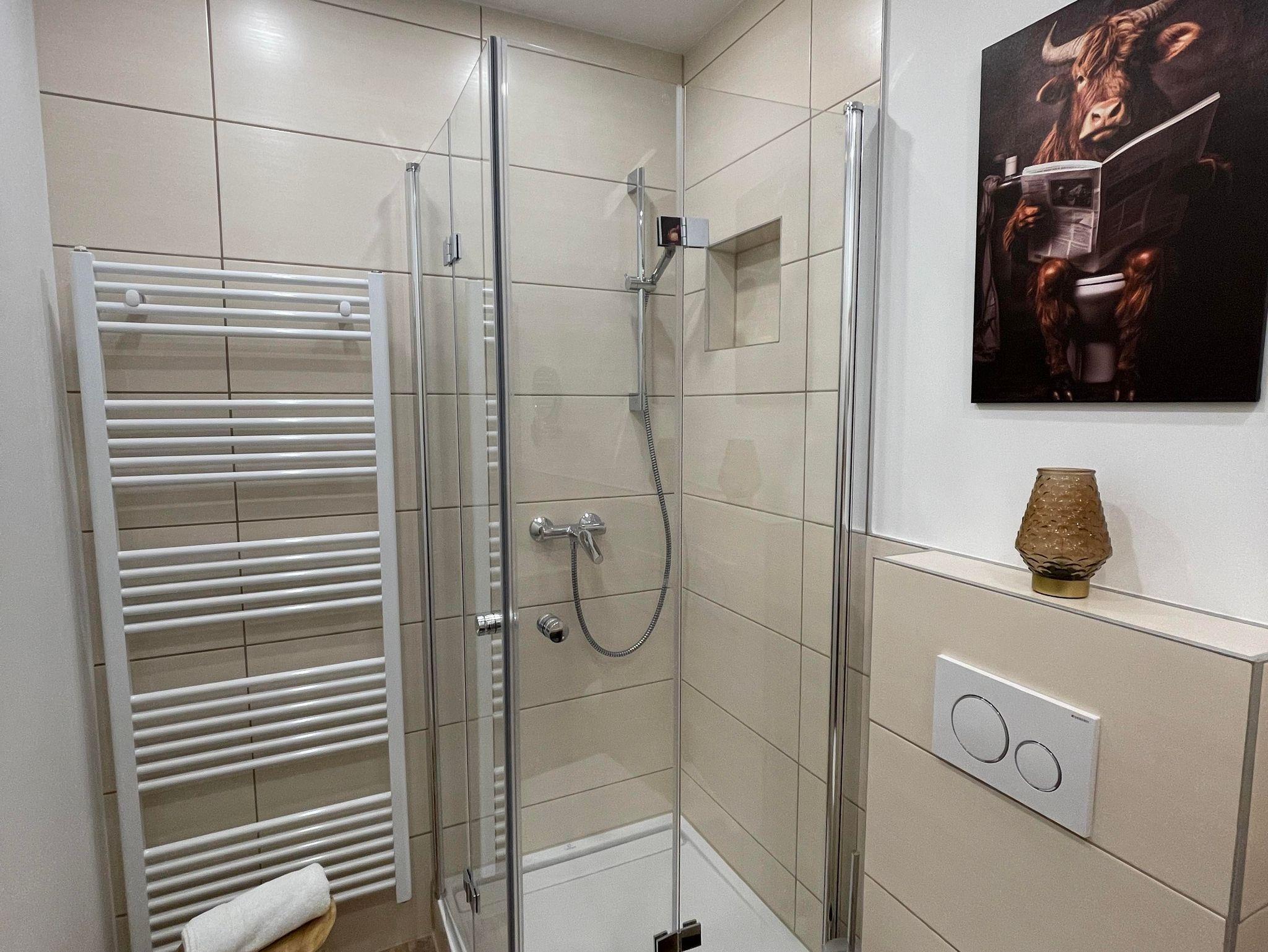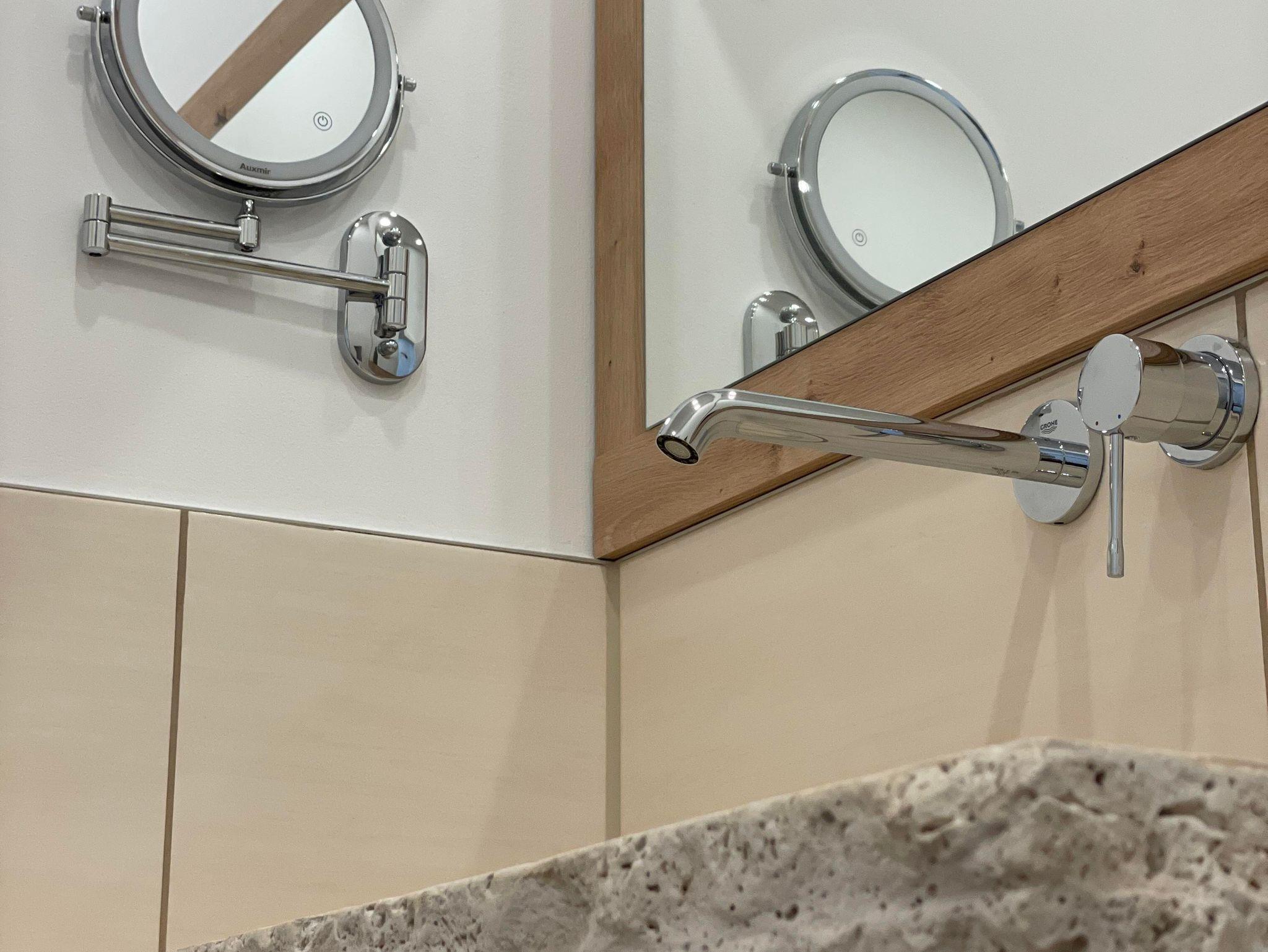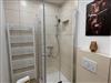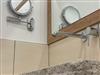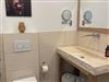 Badezimmer WC, Dusche, Hand- und Duschtücher, Kosmetikspiegel, Fön