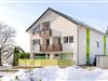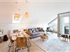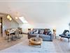 Lichtdurchflutet präsentieren sich Wohn- und Esszimmer mit üppiger Fensterfront unter dem Dach. Ein Sessel in der Lounge-Ecke lädt zum Entspannen ein - für den Kaffee am Morgen, das Glas Wein am Abend oder ein gutes Buch. Gegenüber des kuscheligen, hochwertigen Sofas befindet sich die Cine-Wall mit Flachbild-TV. Die Kissen stammen von Westwing, ein Materialmix mit Samt, Strick und Fell. Über dem großzügigen Holztisch von Studio Copenhagen spenden die Pendelleuchten von Graypants sanftes Licht. Auf dem West-Balkon, mit Blick zum Wald, bieten sich Sitzmöglichkeiten für zwei bis drei Personen.