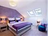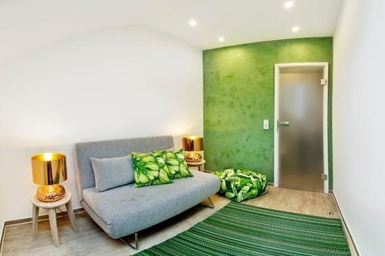 Das große Schlafzimmer beherbergt ein luxuriöses Boxspringbett mit Wildeichen-Rahmen (Liegefläche 180 x 200 cm) für zwei Personen und dazu passendem Mobiliar - Nachttische und ein geräumiger Schrank. Eine Wand wurde in elegantem Violett gestrichen. Die Farbe wirkt ausgleichend und regenerierend. Im zweiten Schlafzimmer befindet sich ein Schlafsofa (Liegefläche 130 x 200 cm) vor grüner Wand.