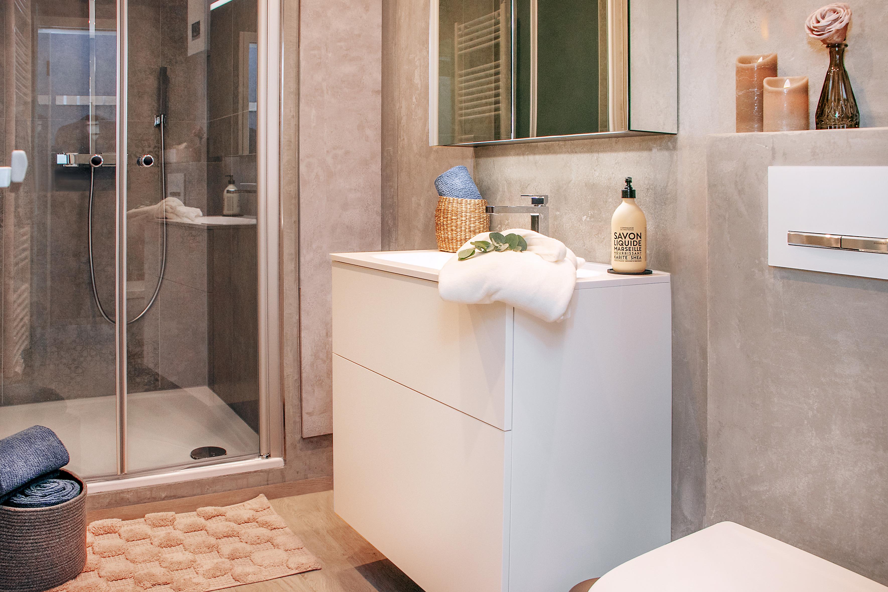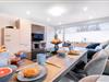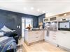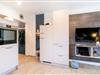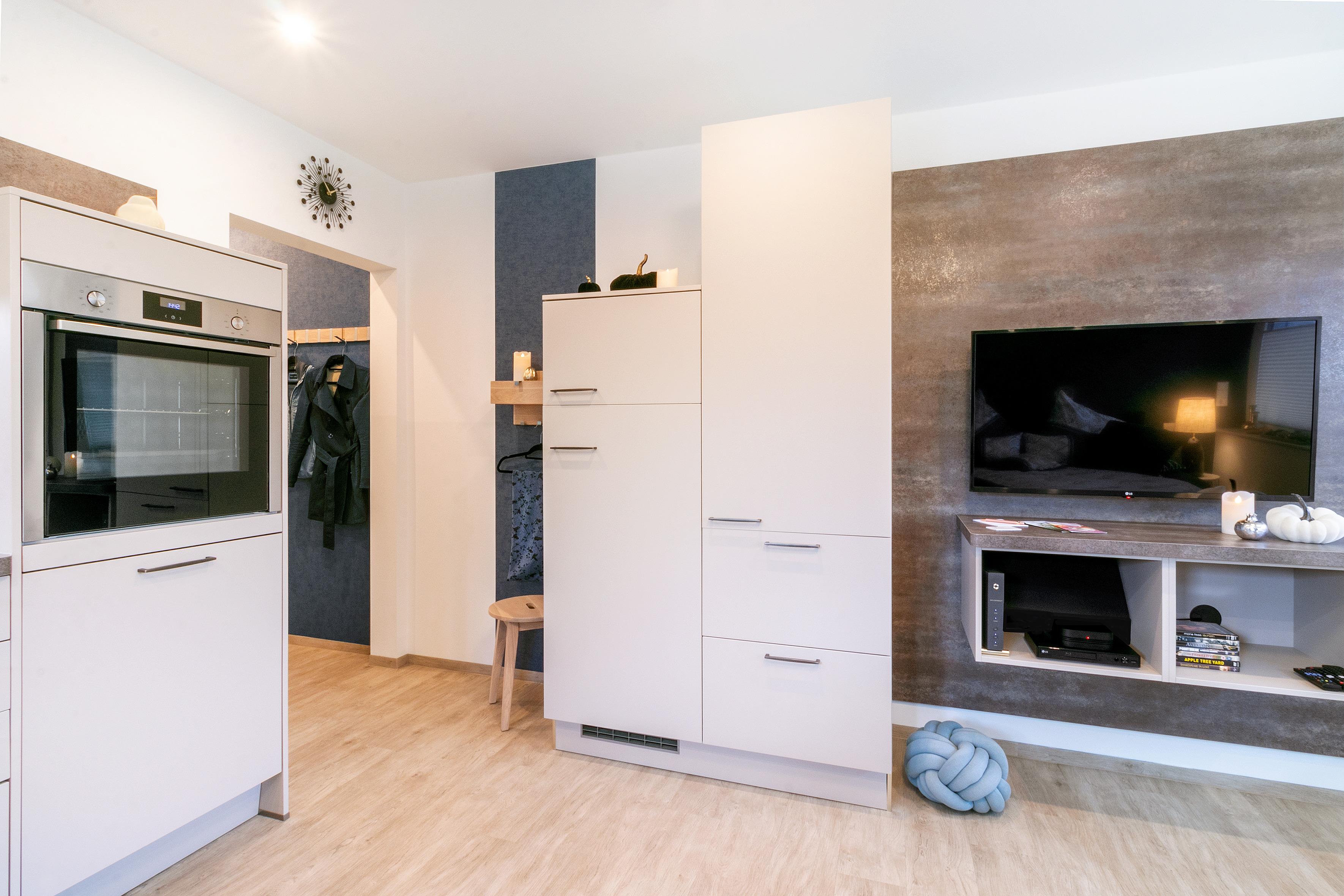 Die moderne Küche bietet neben Spüle, Kühlschrank, Backofen, Geschirrspüler und 4-Platten-Induktionsherd eine gemütliche Essecke und ausreichend Stauraum für Küchenutensilien sowie für Kleidung.