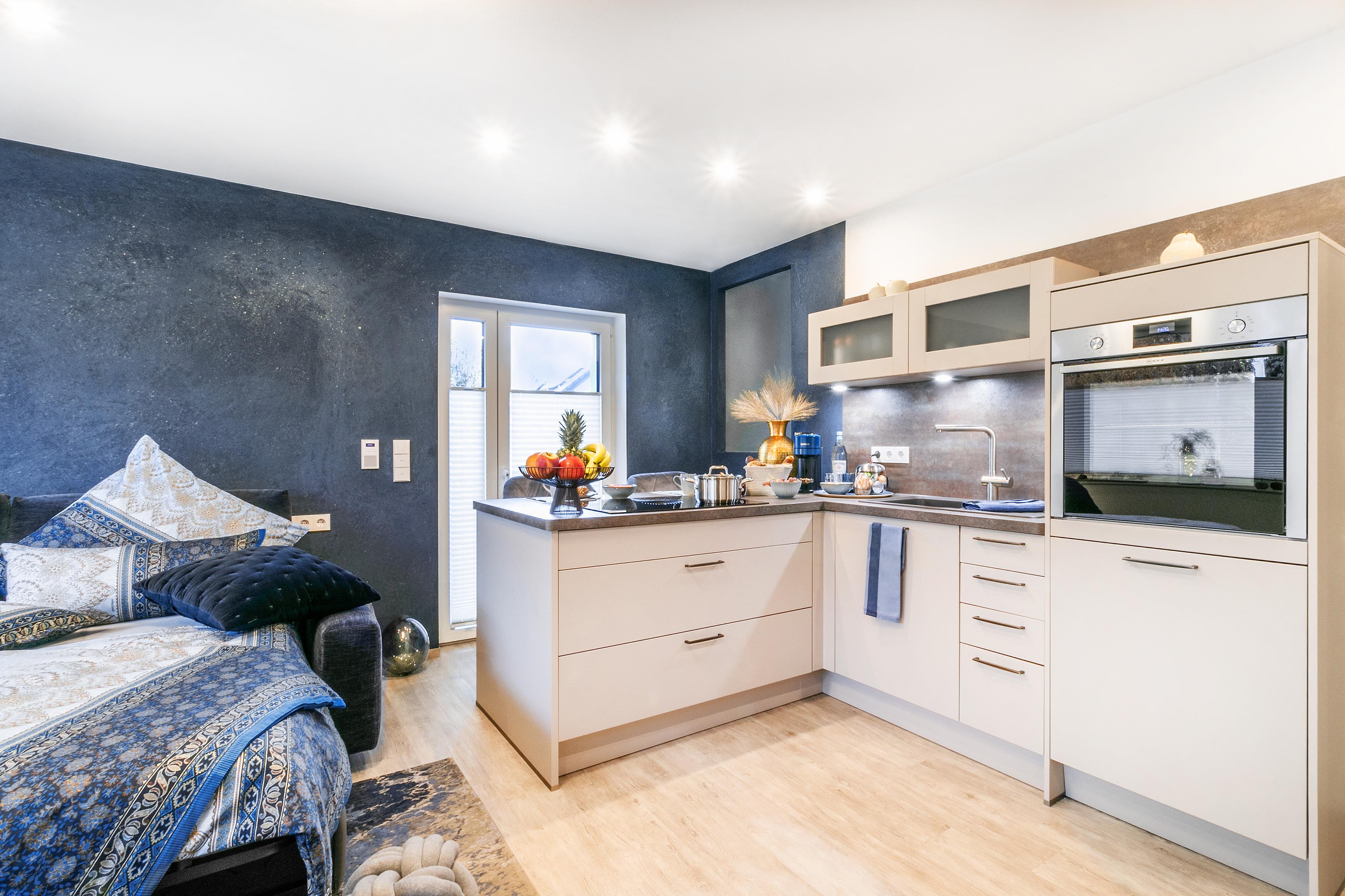Wohn- und Schlafbereich mit integrierter Küche und gemütlicher Essecke mit großer Außenterrasse