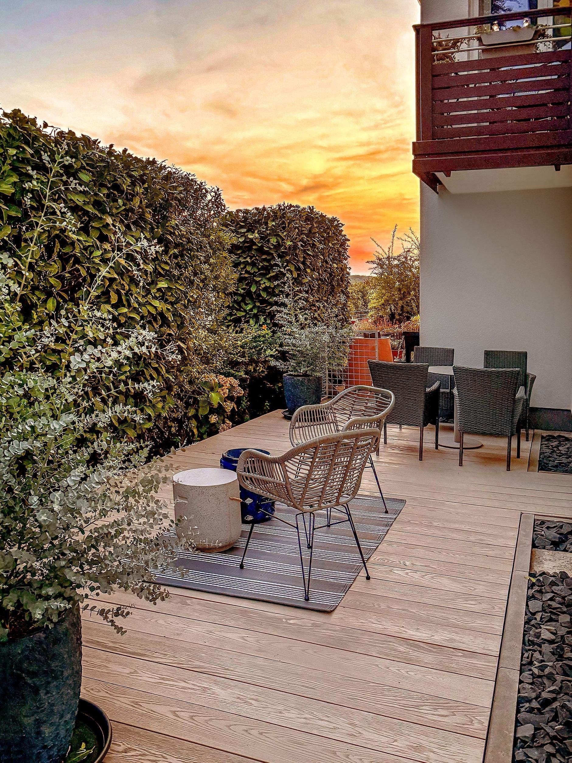 Ab Frühjahr 2024 sehr großzügige Terrasse im Außenbereich auf zwei Seiten der Ferienwohnung.
