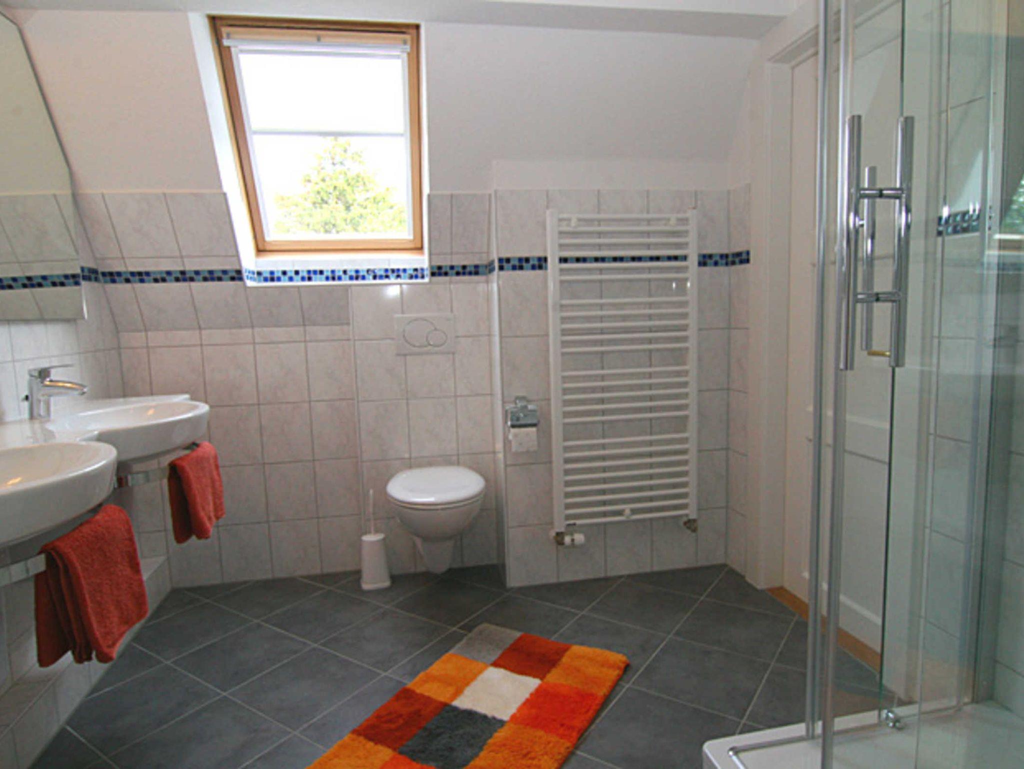 Im 1. OG befinden sich ein Doppelschlafzimmer, ein Einzelschlafzimmer und das geräumige Duschbad mit Doppelwaschbecken.