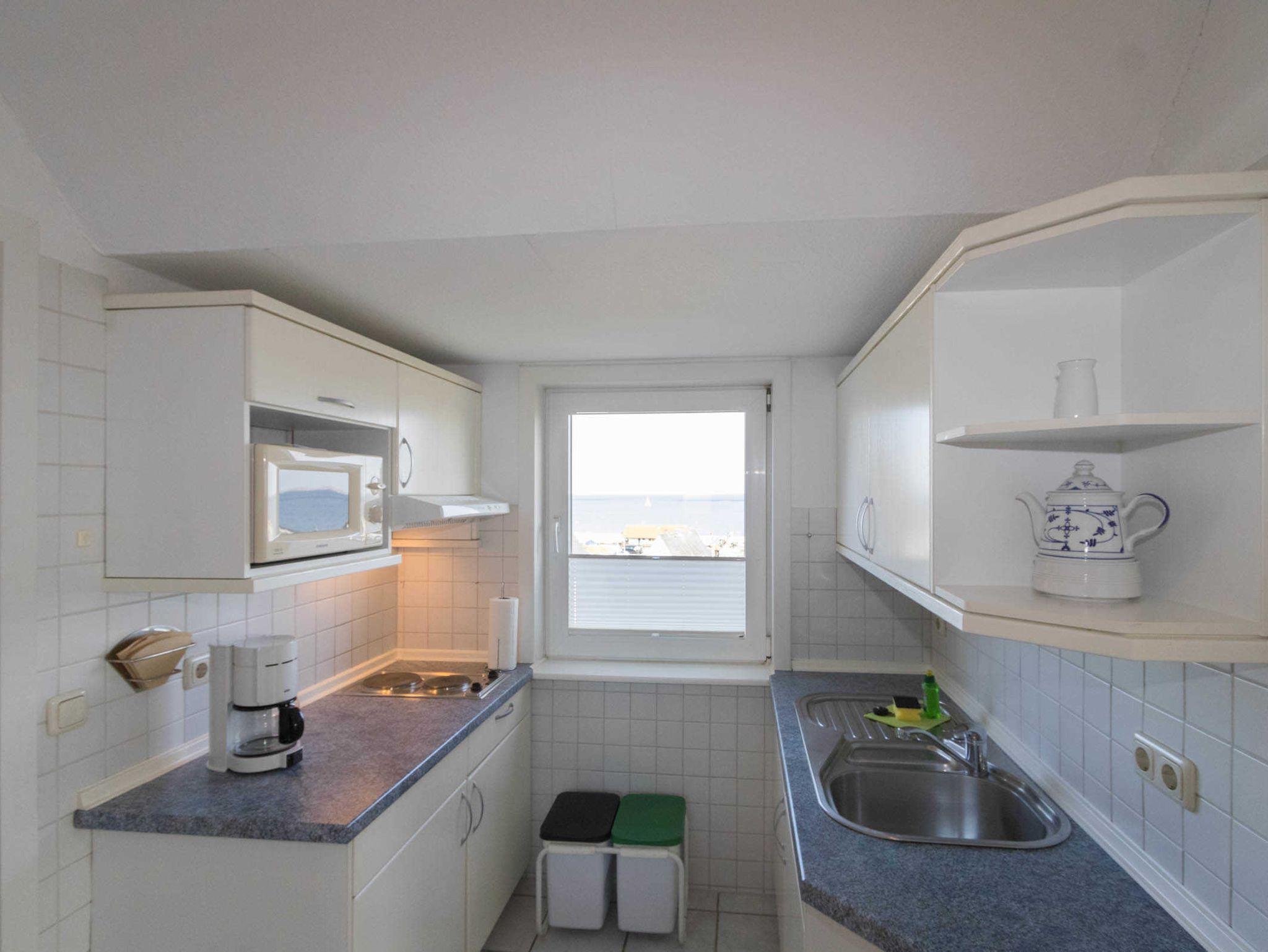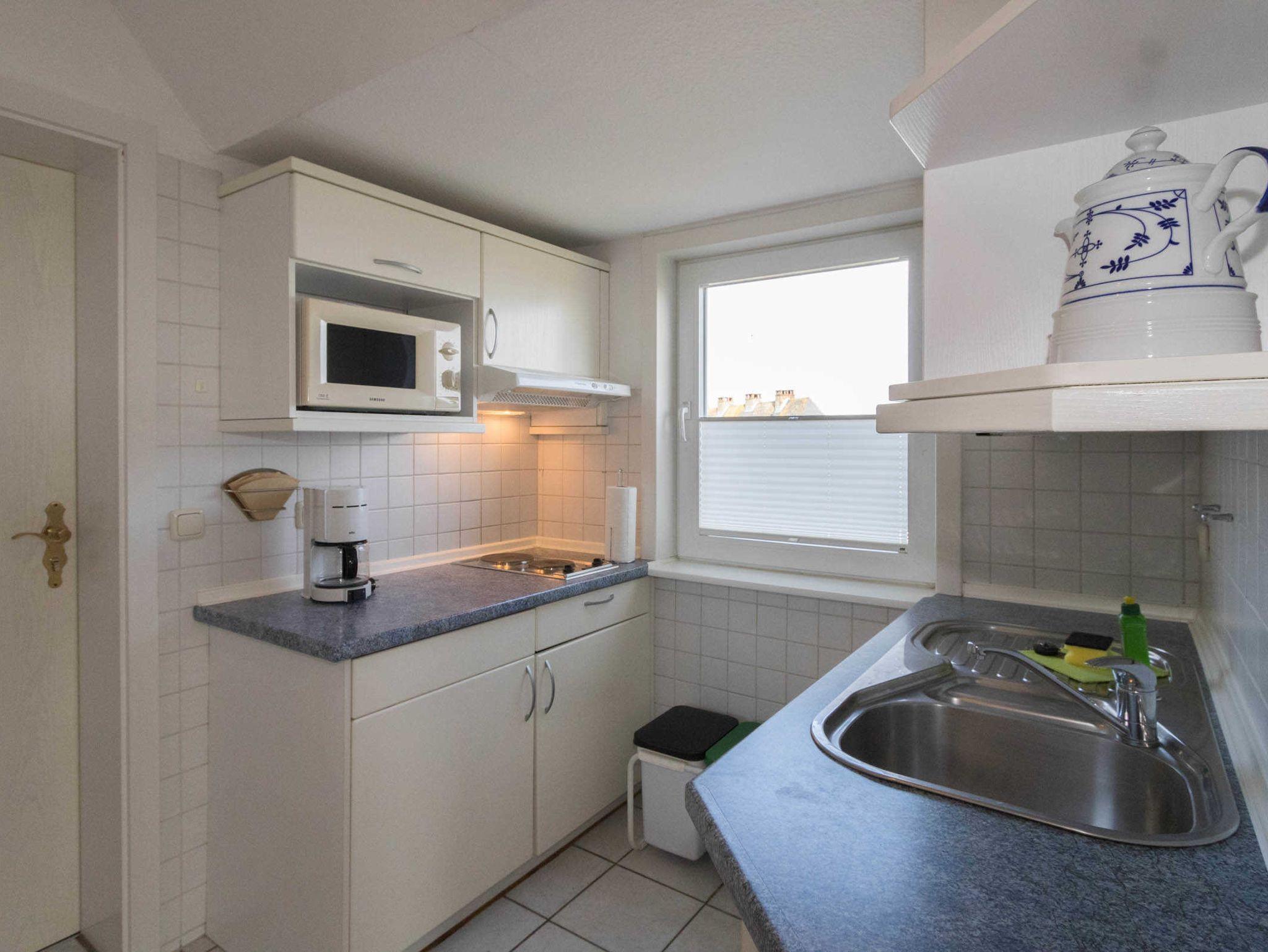 Die sep. kleine Küche ist mit einem 2-Platten-Herd und Mikrowelle ausgestattet.