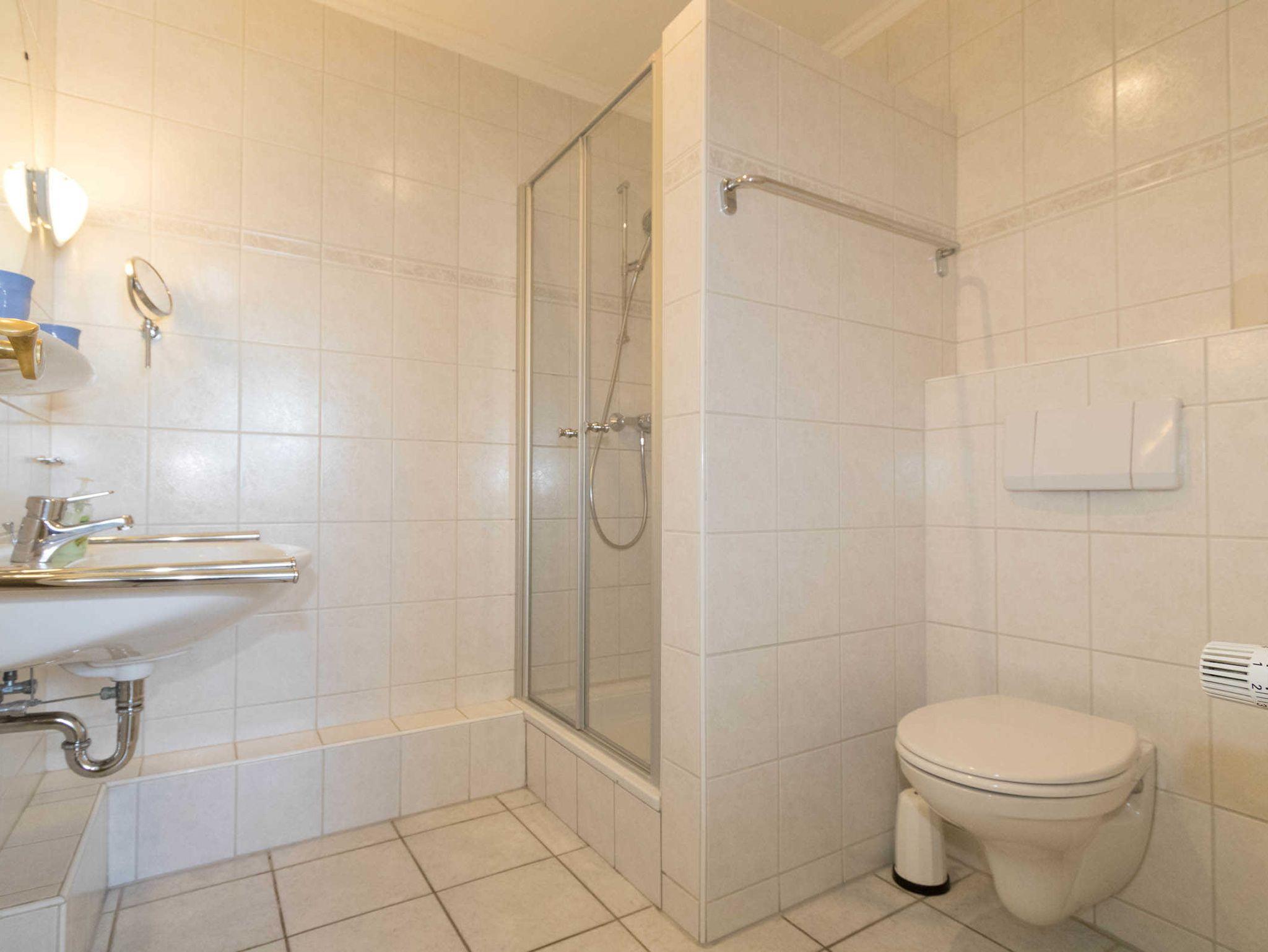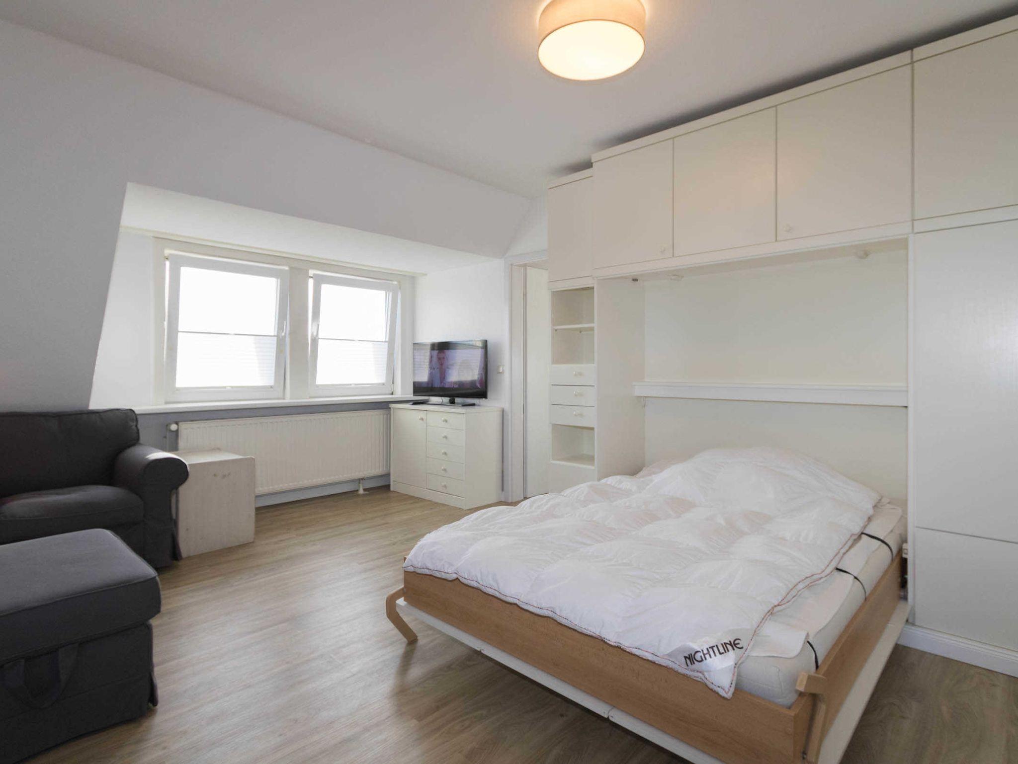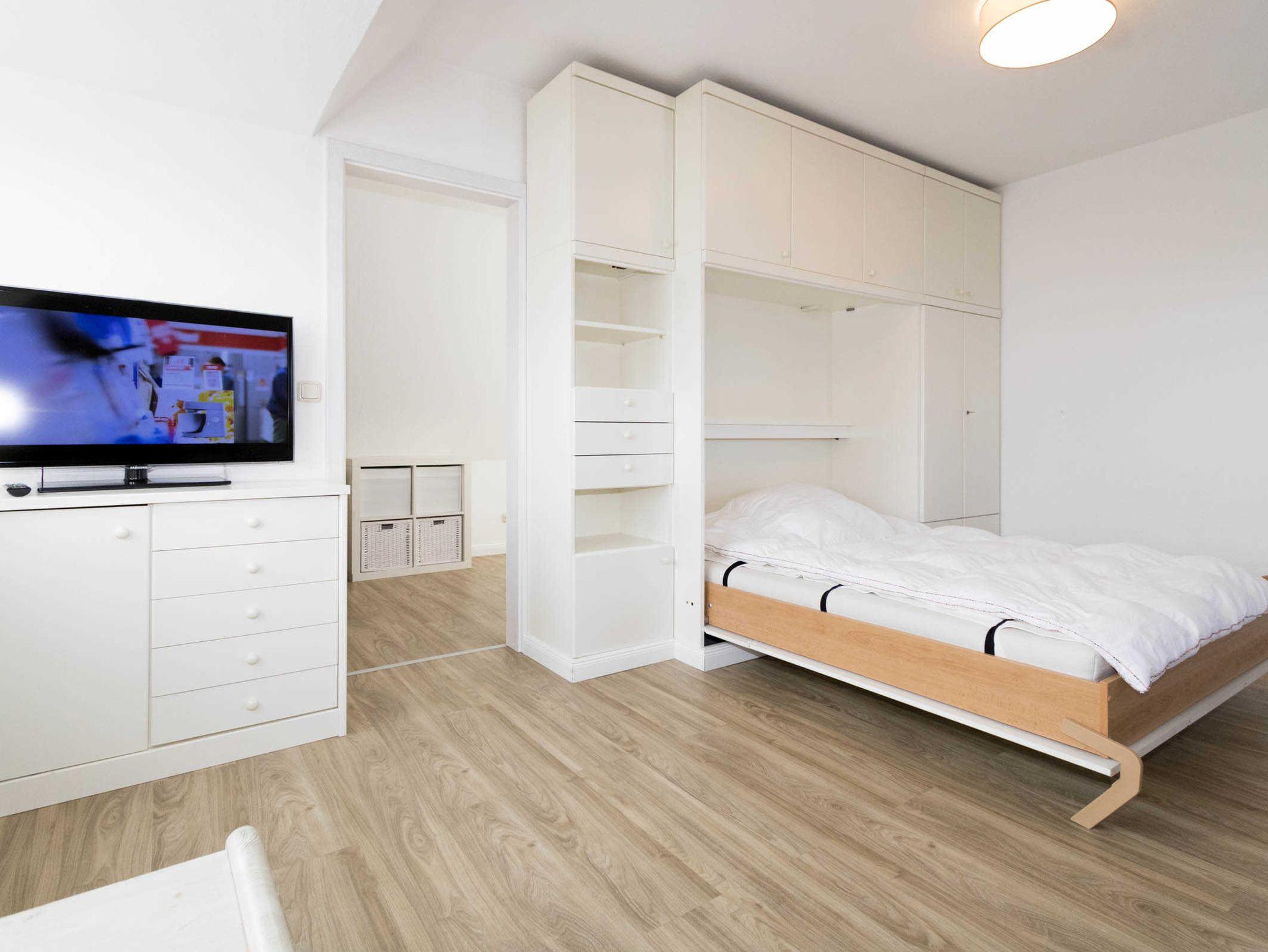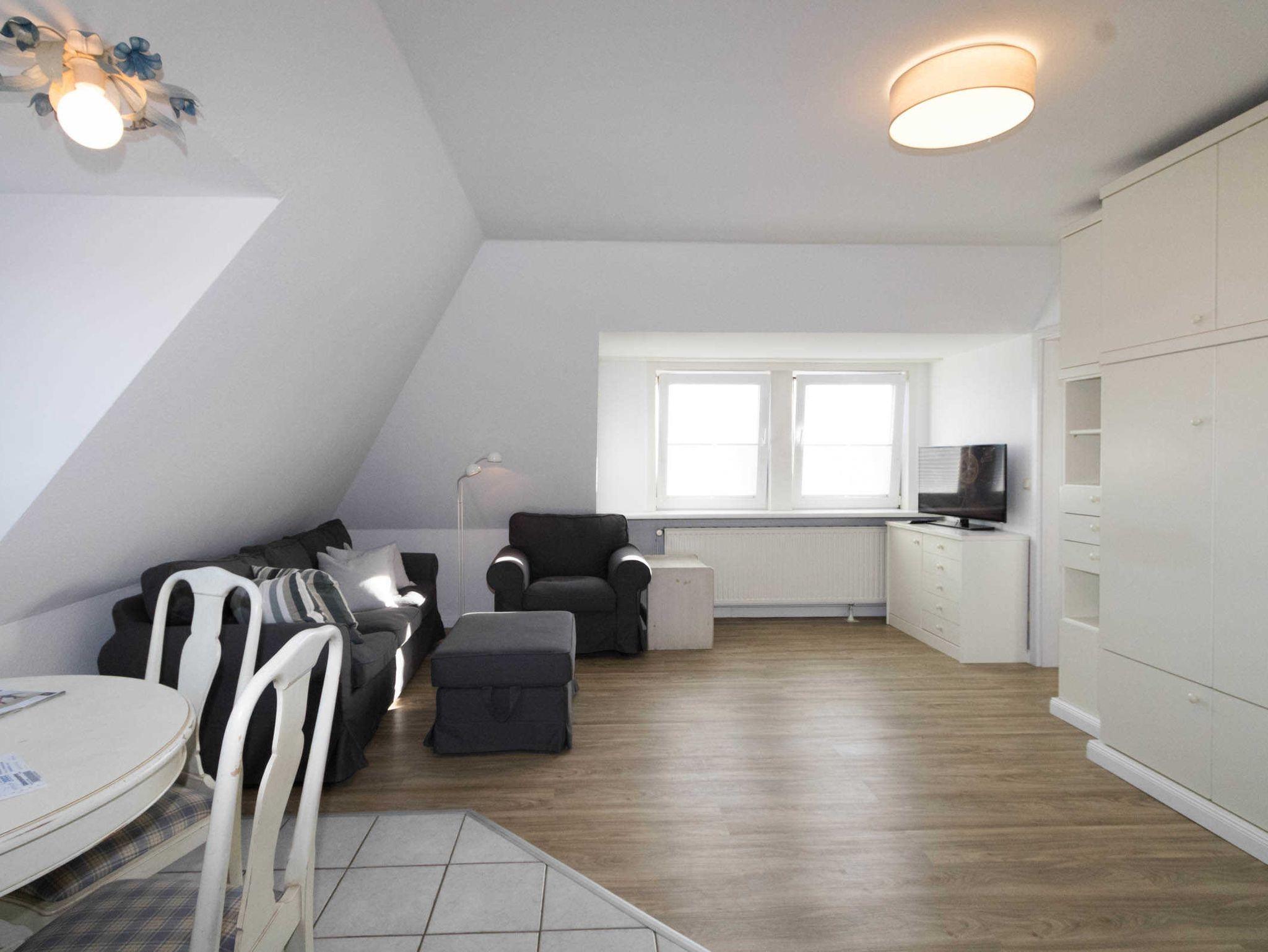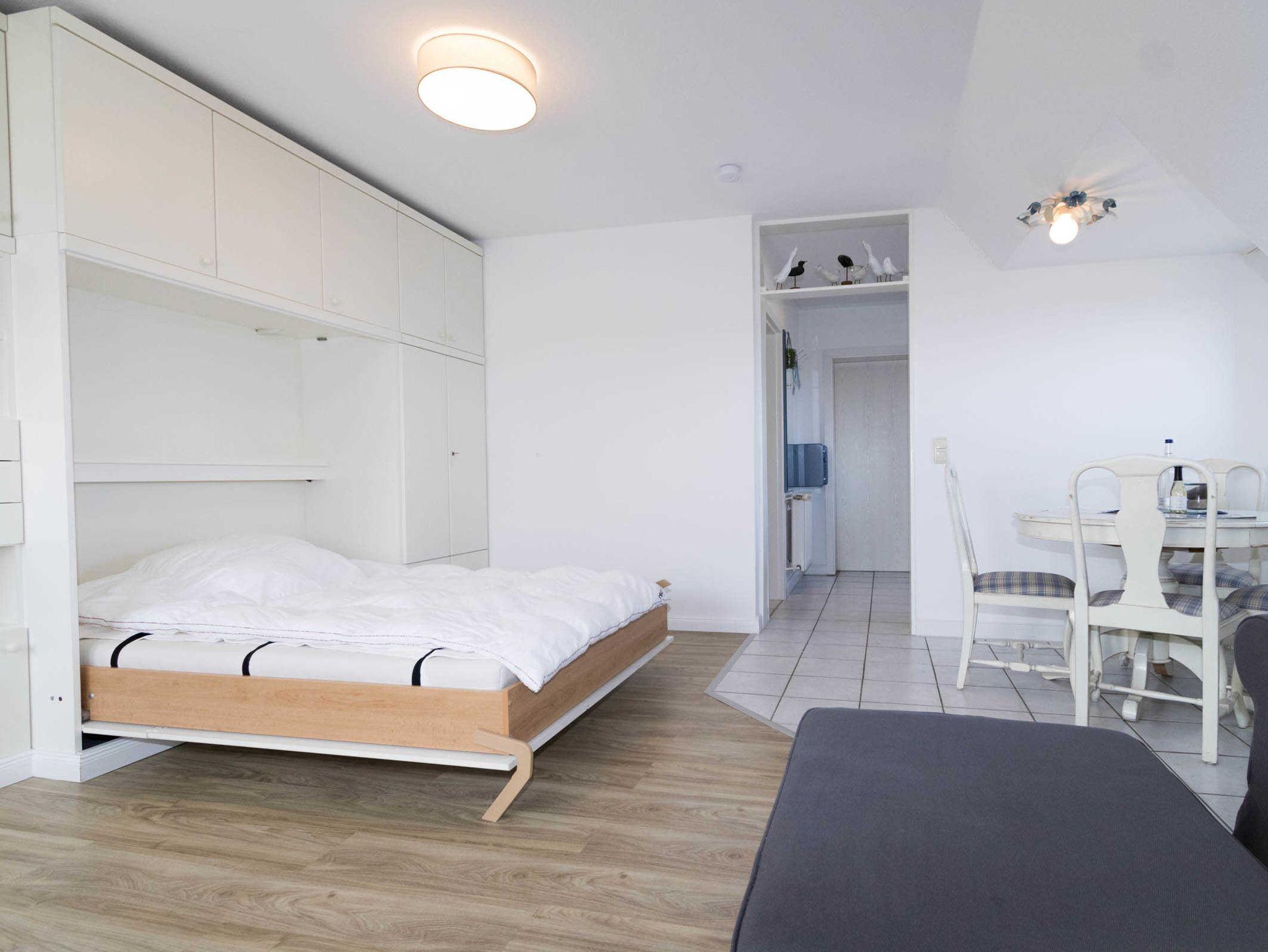 Die Wohnung verfügt über eine sep. kleine Küche, einen Wohnraum, der mit Esstisch für 4 Personen ausgestattet ist. Im Wohnraum befindet sich auch ein Schrankbett (140 x 190cm). Ein Nebenzimmer mit 2 Einzelbetten bietet die Schlafgelegenheit für die 3. und 4. Person. Das Duschbad ist innenliegend.
