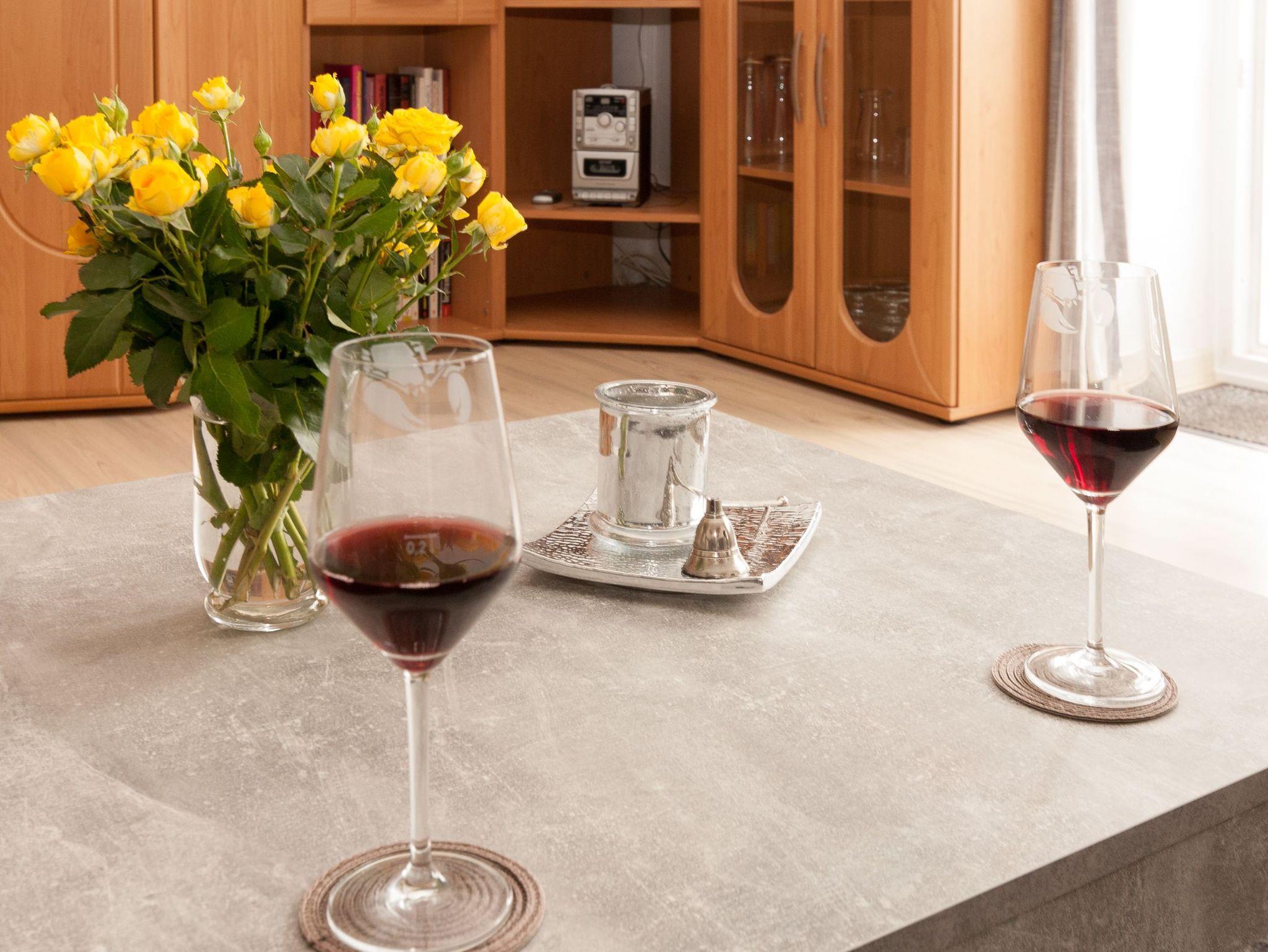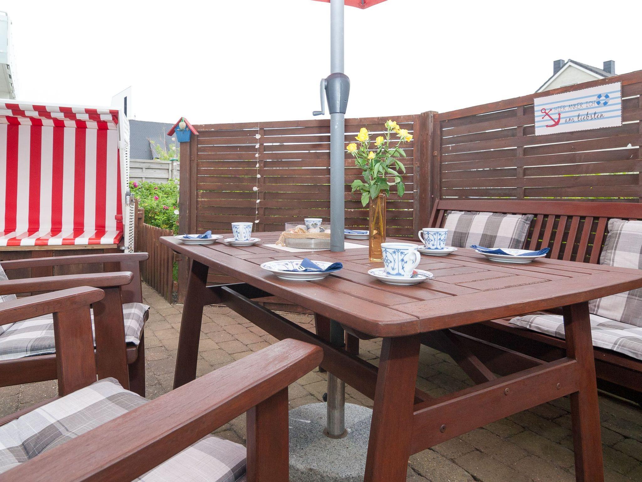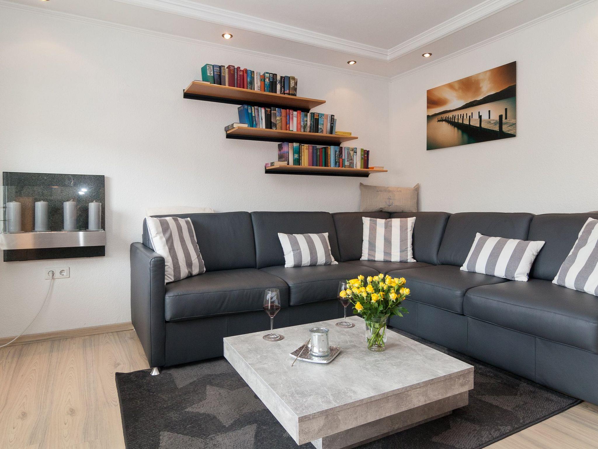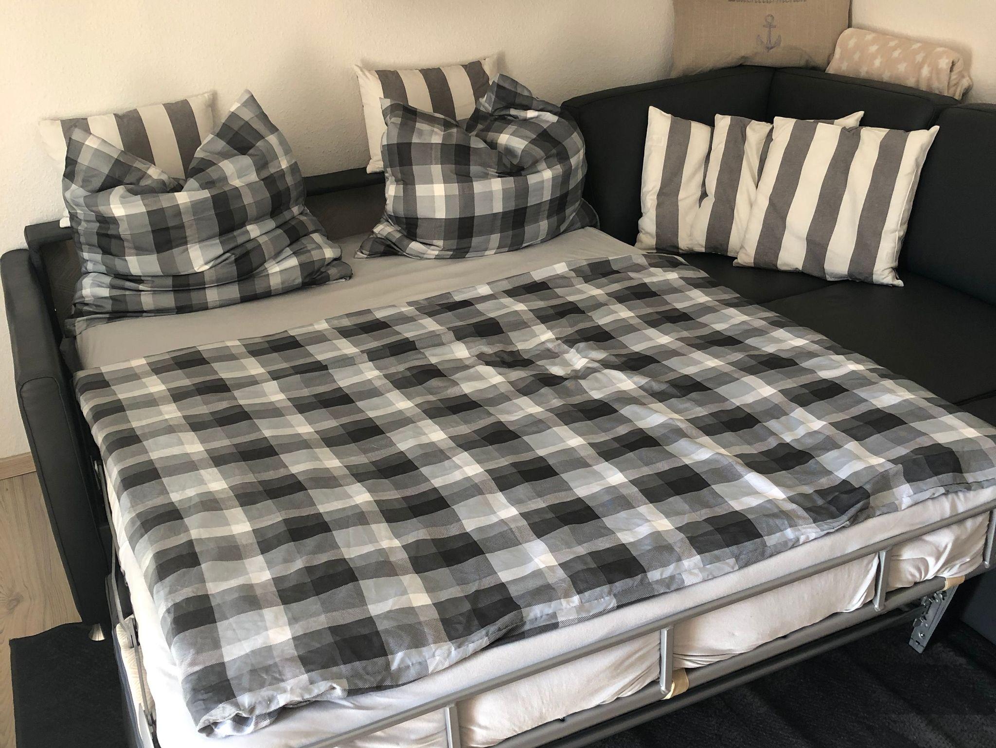 Die Wohnung liegt im Hochparterre und verfügt über ein Wohnzimmer, ein Schlafzimmer mit angrenzendem kleinem Ankleidezimmer, eine Küche mit Essecke und einem neuen Badezimmer. Das Doppelbett im Schlafzimmer ist 1,60m X 2,00m groß und verfügt über zwei Matratzen. Für die dritte und vierte Person befindet sich im Wohnzimmer eine Schlafcouch. Hier empfehlen wir entweder die Wohnung mit 3 Erwachsenen zu nutzen oder 2 Erwachsene und 2 Kinder. Alle Zimmer haben jeweils Außenjalousien vor den Fenstern. Vom Wohnzimmer aus gelangen Sie auf den Balkon mit Terrasse zum Süden.