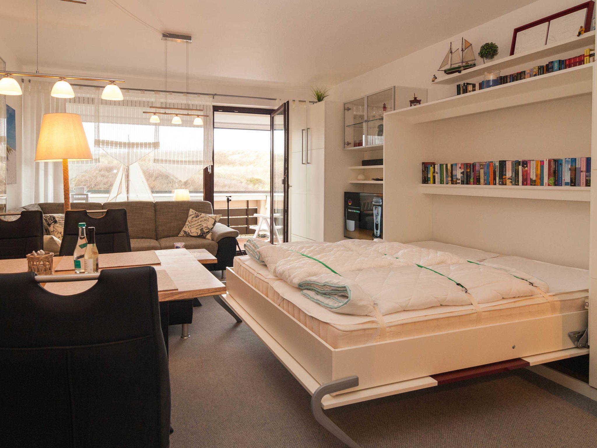 Diese Ferienwohnung Meerzeit im Haus Delphin ist für 3 Personen ausgestattet. Sie verfügt im Wohnbereich über 1 Schrankbett was sich leicht ausklappen lässt. Das angrenzende Schlafzimmer befindet sich direkt neben dem Wohnbereich und wird durch eine Schiebevorrichtung abgetrennt. Vom Wohnzimmer / Esszimmer aus haben Sie einen schönen Blick auf die Dünenlandschaft. Zur Wohnung gehört ein Duschbad mit Badewanne und eine sep. kleine Küche, die mit allem ausgestattet ist, was man im Urlaub braucht.