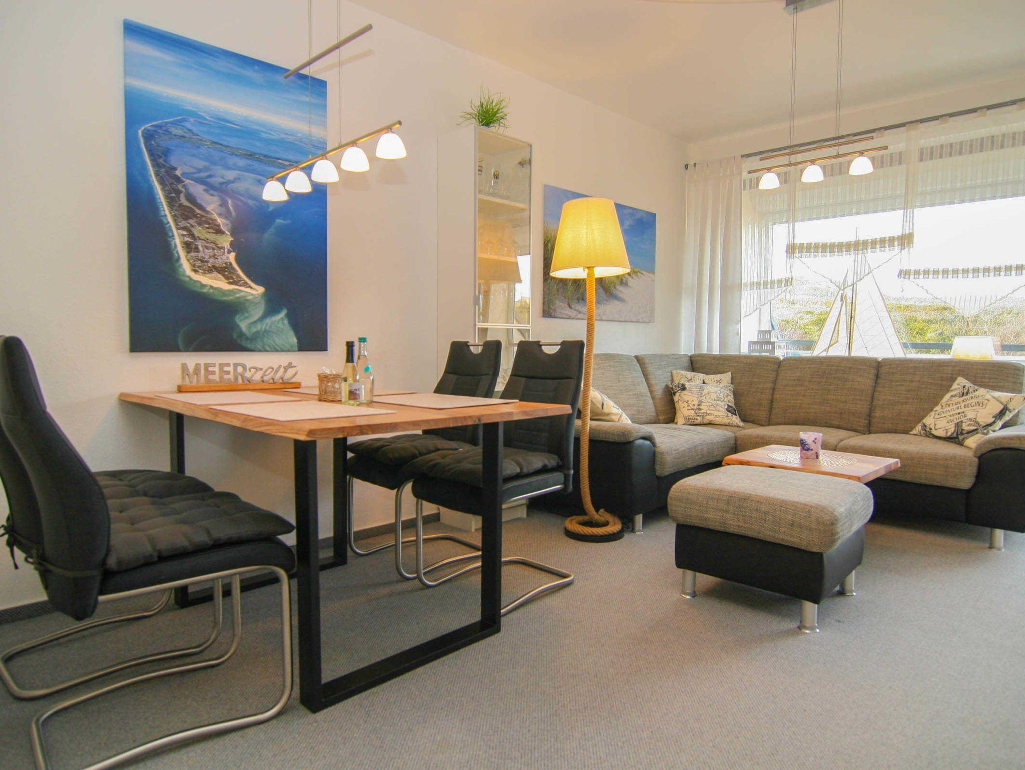 Diese Ferienwohnung Meerzeit im Haus Delphin ist für 3 Personen ausgestattet. Sie verfügt im Wohnbereich über 1 Schrankbett was sich leicht ausklappen lässt. Das angrenzende Schlafzimmer befindet sich direkt neben dem Wohnbereich und wird durch eine Schiebevorrichtung abgetrennt. Vom Wohnzimmer / Esszimmer aus haben Sie einen schönen Blick auf die Dünenlandschaft.