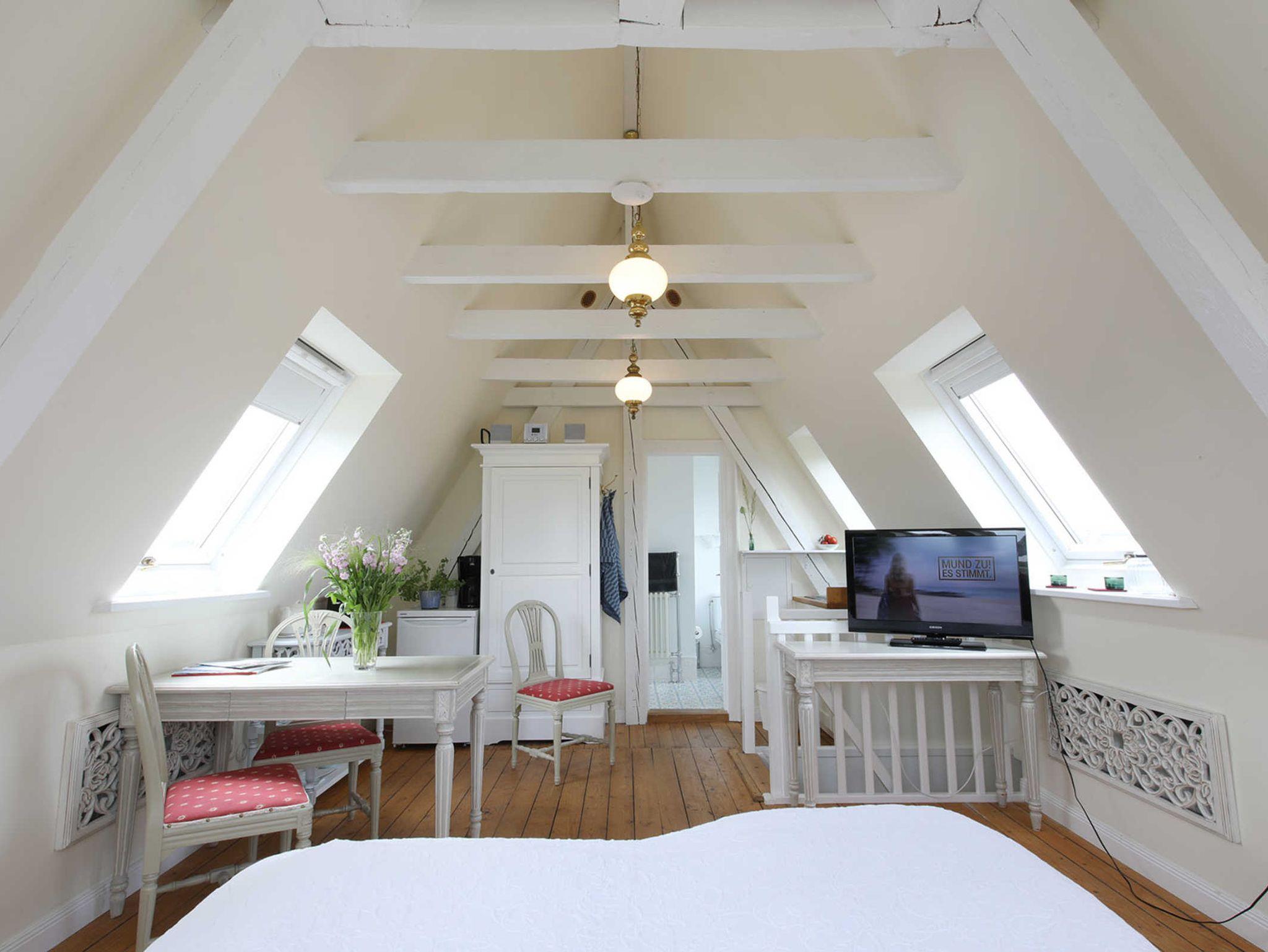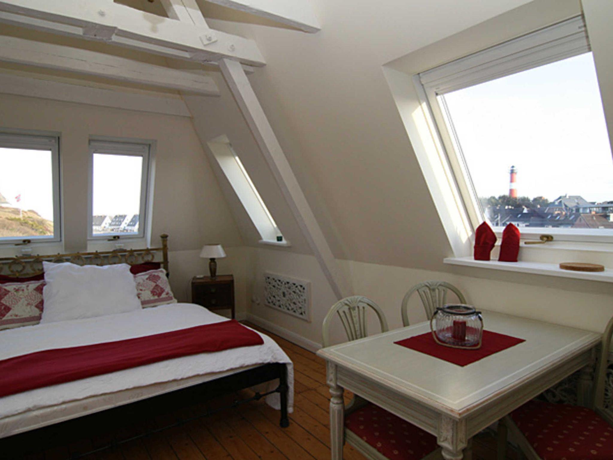 Über zwei, dem Charme des Hauses angepasste Holztreppen, gelangen Sie in Ihre Wohnung nah bei den Sternen. Ein traumhafter Blick erwartet Sie in dem kombinierten Wohn-/Schlafraum. Klein aber fein lässt diese Wohnung kaum einen Wunsch offen. Bestens geeignet für junge Leute und Junggebliebene. Der große Raum bietet neben dem Doppelbett eine Esstisch und eine kleine Küchenzeile. Vom Duschbad aus haben Sie ebenfalls einen Traumblick über den Ort bis zum Leuchtturm.