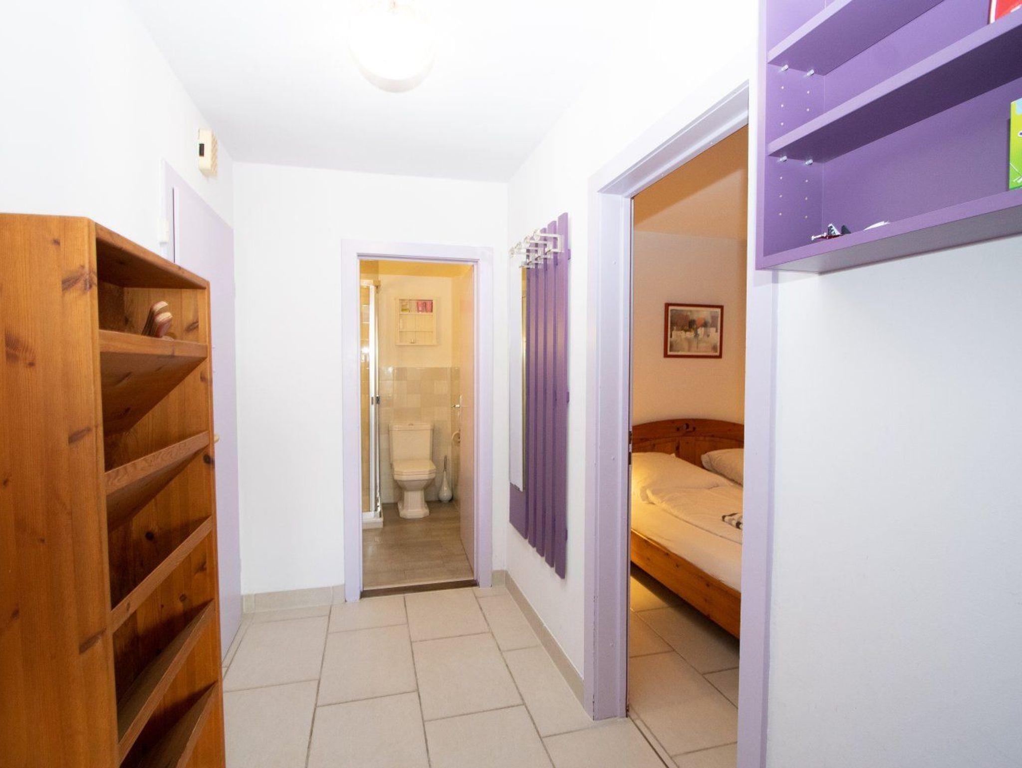 Ausgestattet ist die Ferienwohnung wie folgt: Ein Wohn-/Schlafraum mit Doppelschlafcouch. Separates Schlafzimmer im Souterrain mit breitem Doppelbett. Alle Möbel sind handgefertigte Schwedenmöbel aus Massivholz. Flur mit Garderobe. Das Duschbad mit WC ist modern und hell gehalten. Die Wohnung ist komplett gefliest.