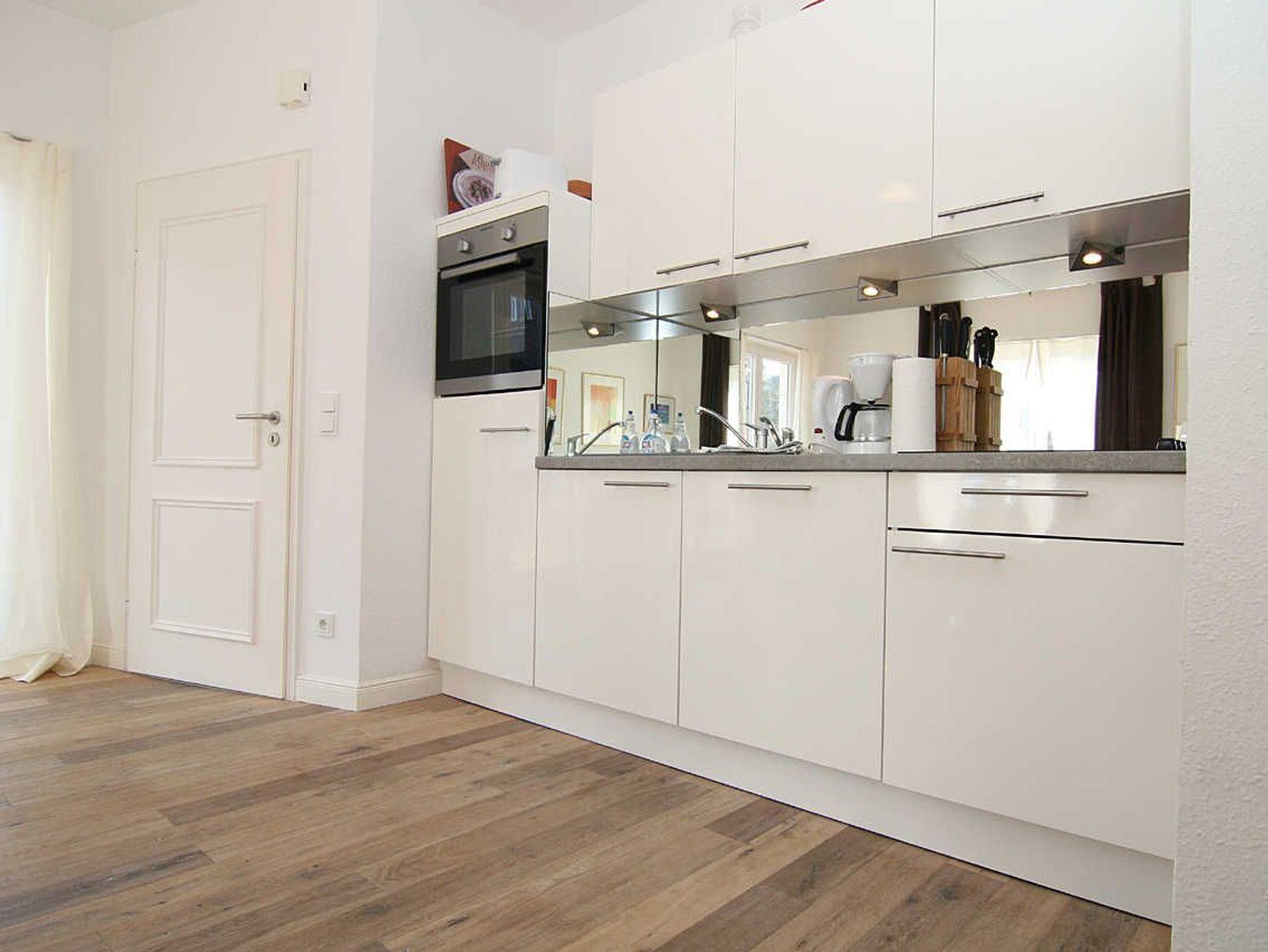 Die hell eingerichtete Ferienwohnung hat einen Wohn-/Schlafraum mit einer Schlafcouch (für 3. und 4.Person) und einen Esstisch sowie einen Fernseher für die gemütlichen Abende. In der offenen Einbauküche mit Geschirrspüler können Sie nach Herzenslust kochen. Das seperate Schlafzimmer befindet sich im hinteren Teil der Ferienwohnung. Nachttische, ein Regalschrank, ein Vitrinenschrank und ein Kleiderschrank bieten ausreichend Stauraum.
