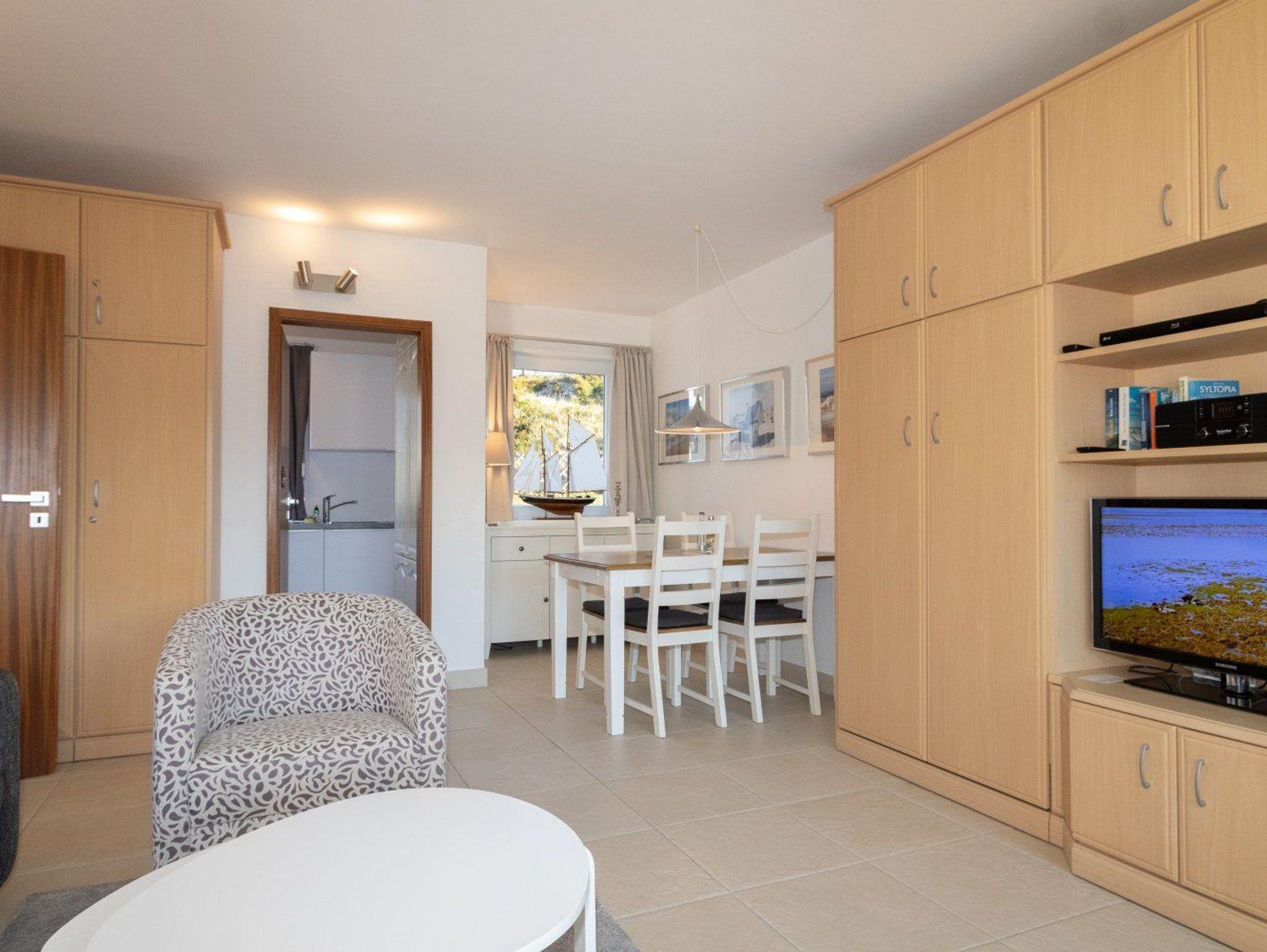 Diese helle Erdgeschoßwohnung verfügt über 1 Schlafzimmer und einem großem Wohnbereich mit 2 Einzelschrankbetten die im Wohnzimmerschrank integriert sind. Das Badezimmer ist modern und hell eingerichtet. Die Küche verfügt über sämtliche Utensilien, alles was man zum Kochen braucht. Die Wohnung wird als Nichtraucherwohnung angeboten. Wer rauchen möchte, der nutzt bitte die Terrasse.