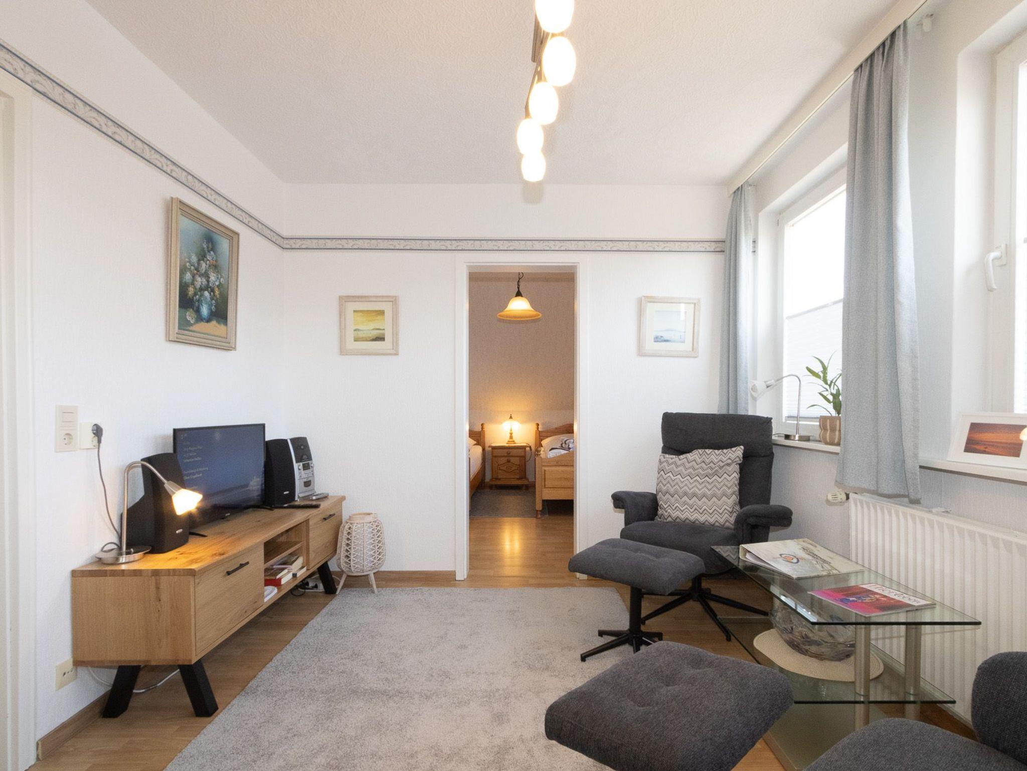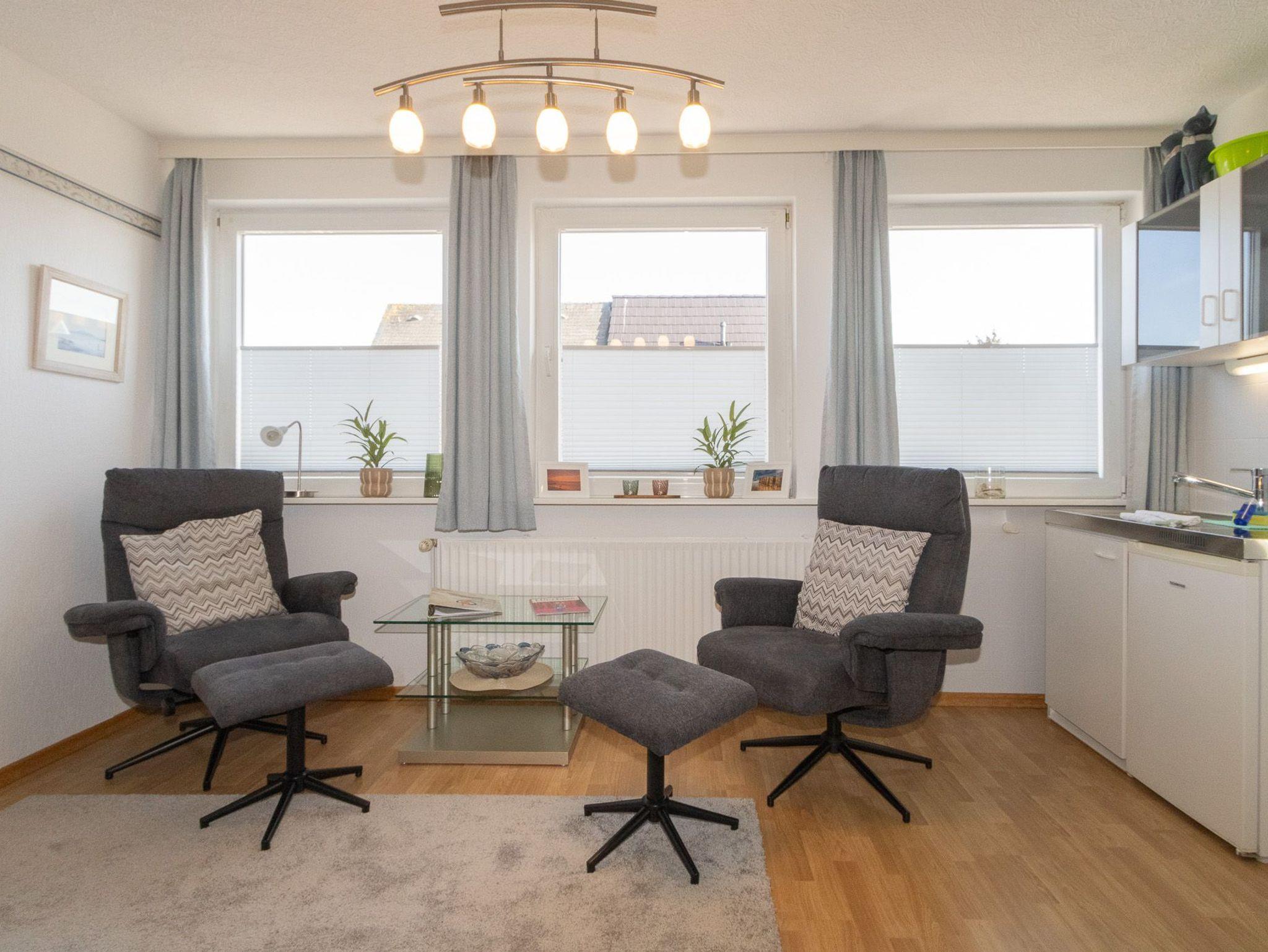Gemütliche 2-Raum Ferienwohnung mit 2 nebenander stehenden Einzelbetten und einer Pantryküche für den täglichen Bedarf.