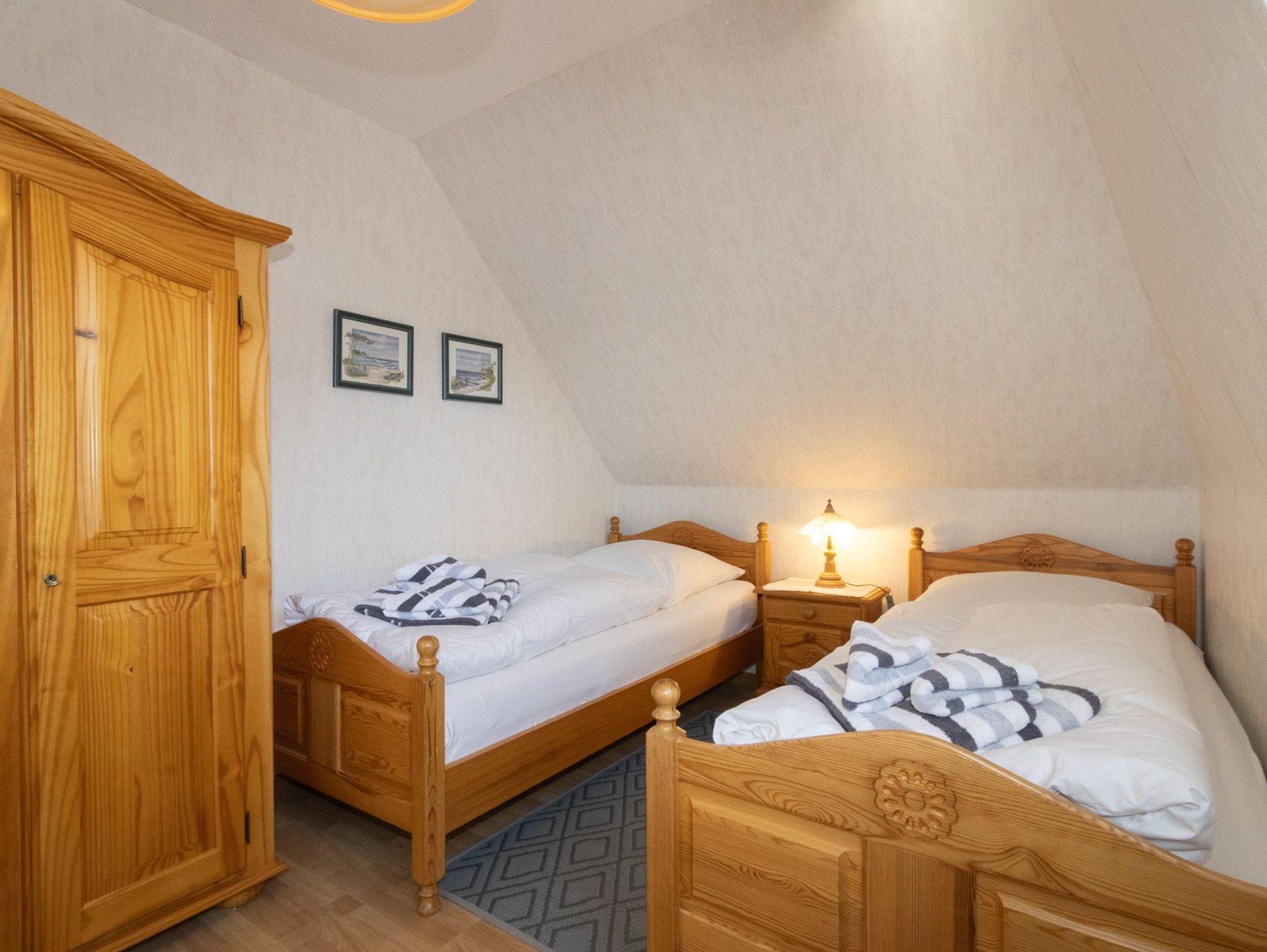 Die Wohnung befindet sich im Obergeschoss des Hauses. Sie verfügt über 2 Einzelbetten die im seperatem Schlafzimmer sind. Die Pantryküche ist mit Allem ausgestattet für den täglichen Bedarf. Kaffeemaschine, Toaster und Wasserkocher sind ebenfalls vorhanden. Das Badezimmer verfügt über ein WC und eine Dusche und ist hell ausgestattet.